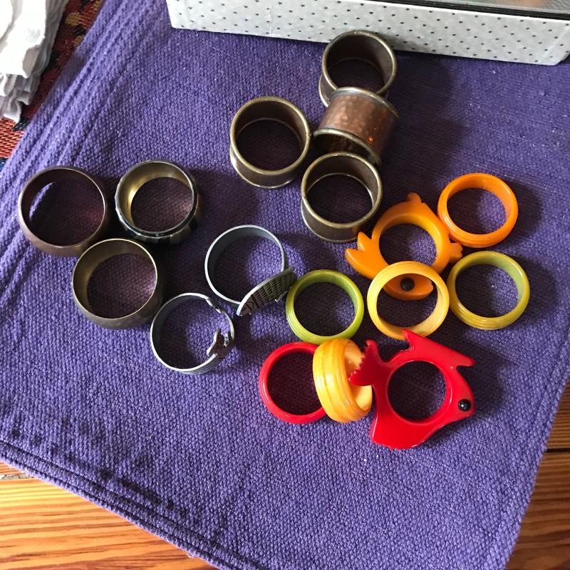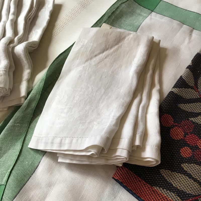 Lot includes six tablecloths, two sets of 8 placemats, tablerunner, 5 cloth napkin sets, beeswax candles, and various vintage napkin rings. Shipping available or local pickup in Asheville, NC.