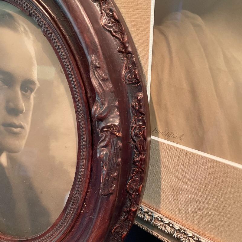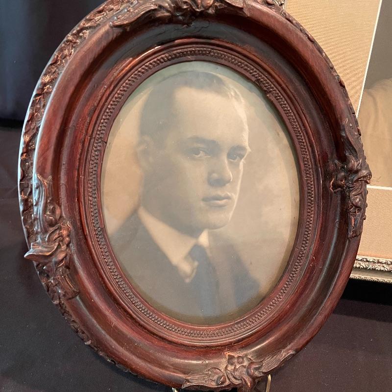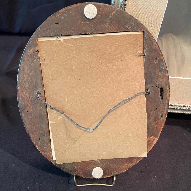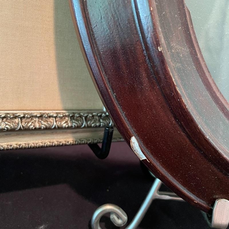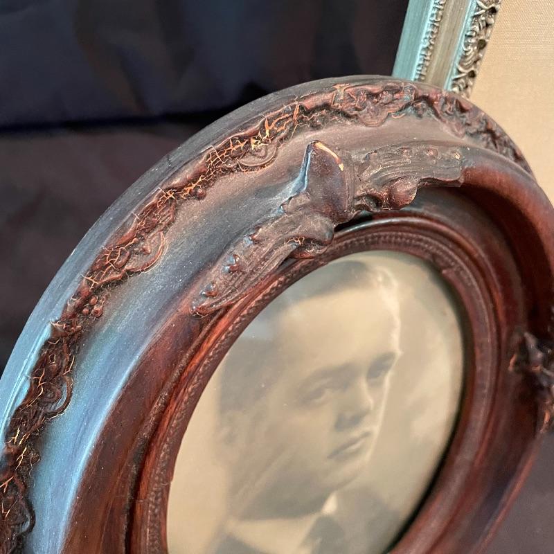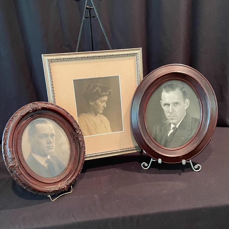 Two handsome young men with two antique, oval, dark wood frames and a beautiful woman with a gilt style silver colored wood frame. The silver framed art has a signature noted in images and frame measures approximately 13.5” x 15.5”. One oval frame has a chip and a couple other nicks that look to be covered up or refinished. See images. All three frames have glass panels. Local pick up only.