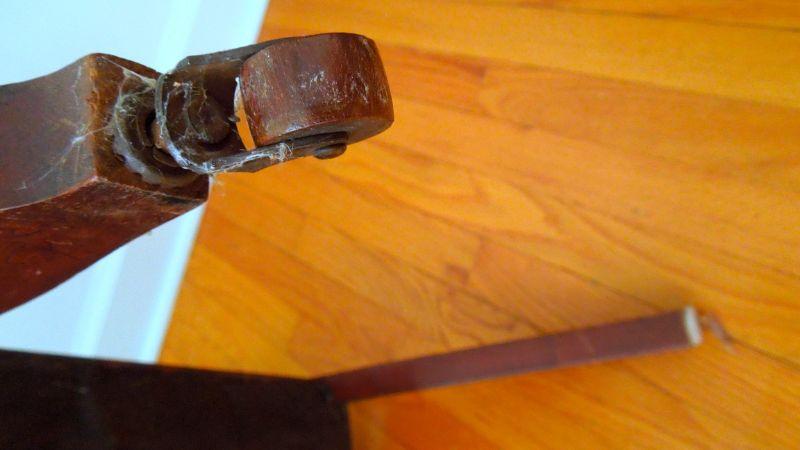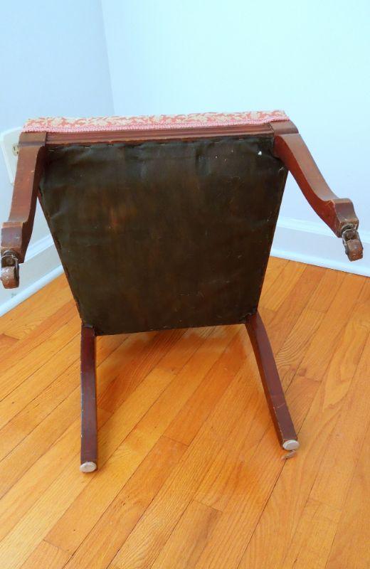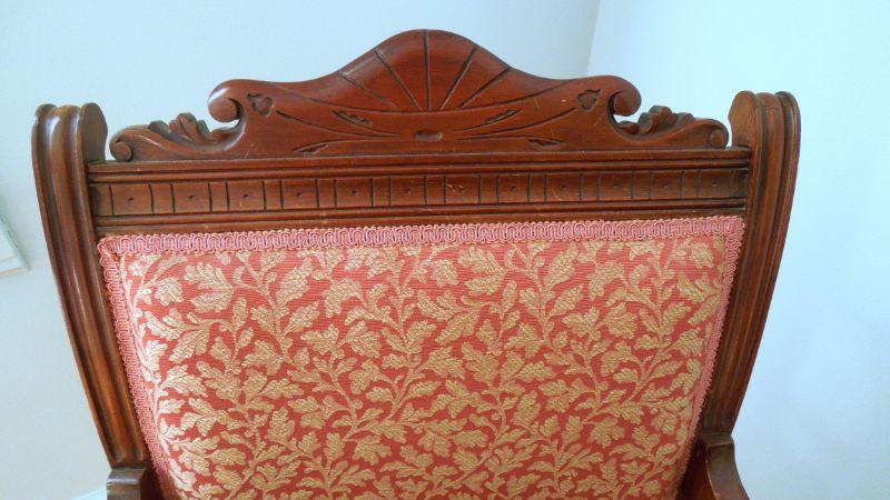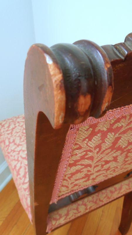 One padded armchair with brocade upholstery. Chairs are sturdy. Wood shows distess (see photos). Front legs have castors. Upholstery is slightly sunfaded from age.