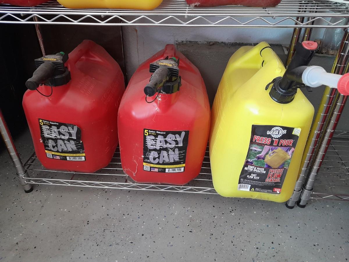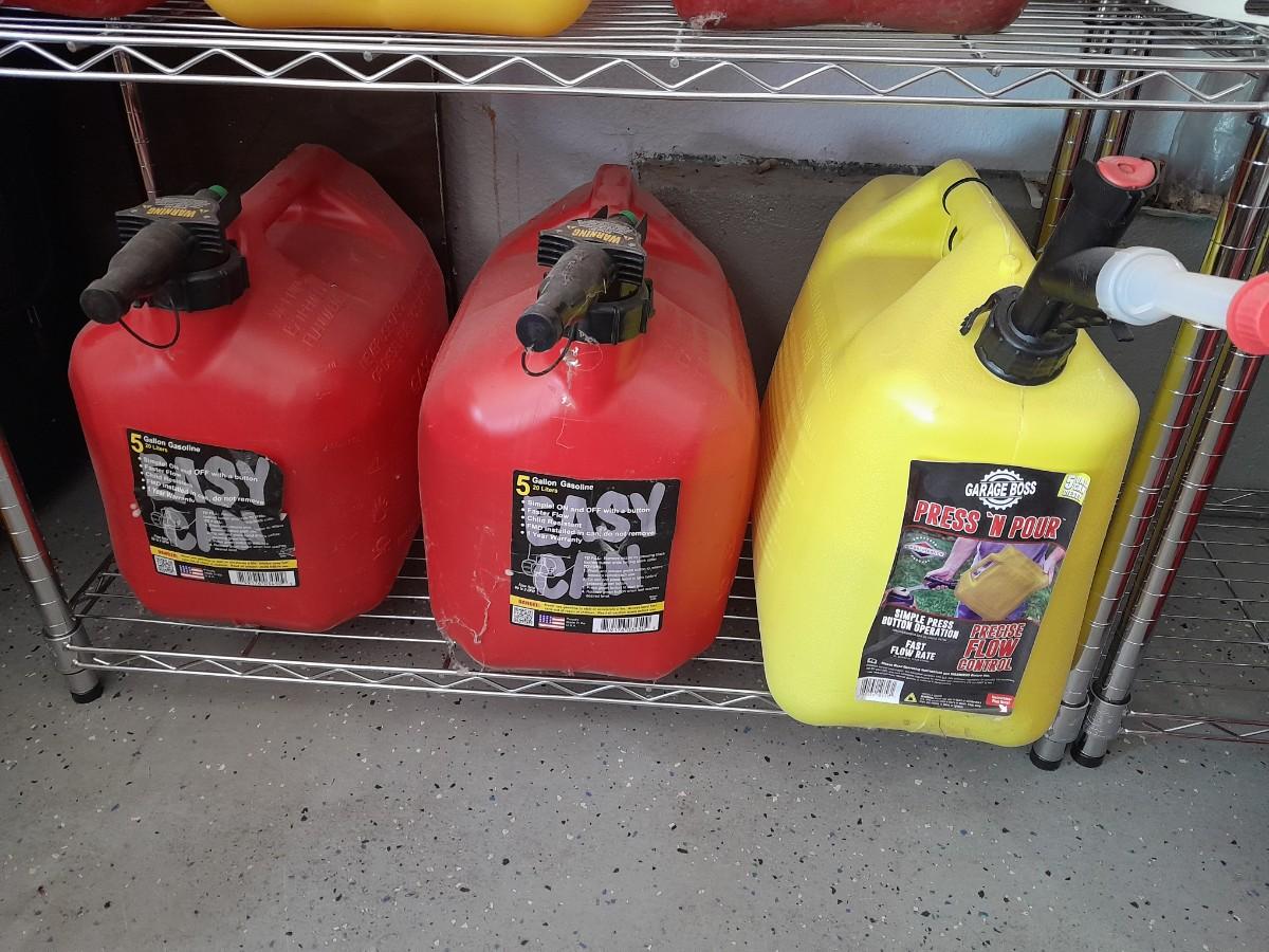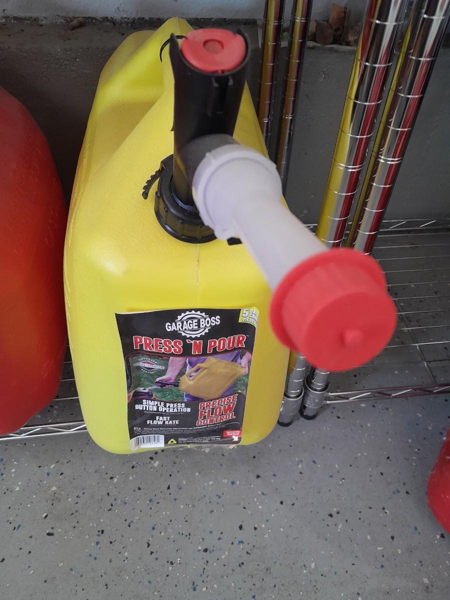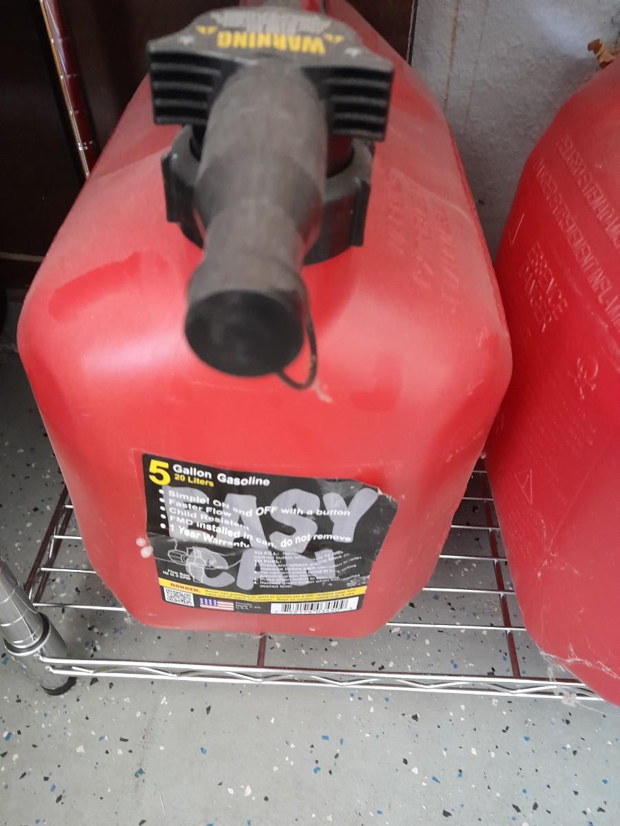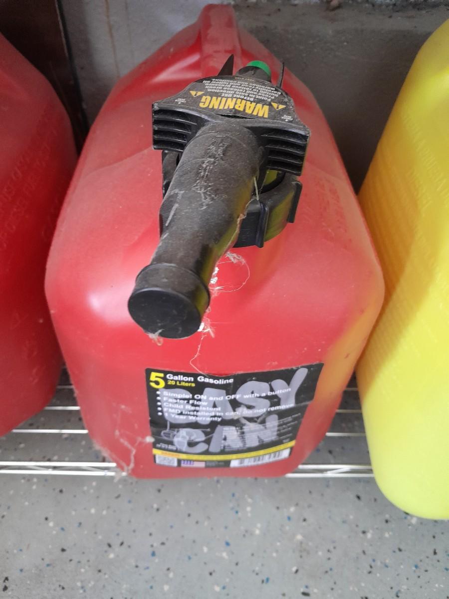 TWO EASY CAN FUEL CONTAINERS AND ONE PRESSN' POUR