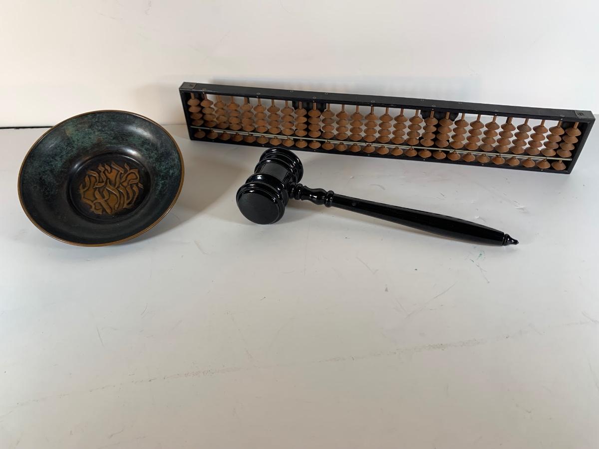 Lot includes a vintage Abacus, black wooden Gavel and a little metal bowl that measures 5 1/4".