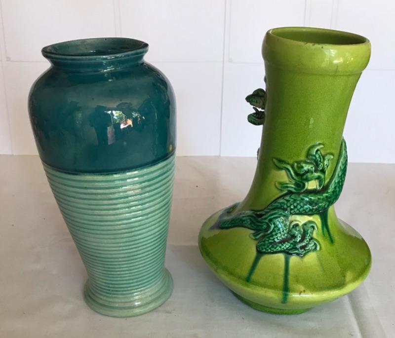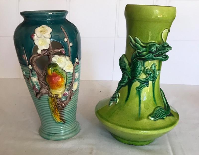 Green Dragon Vase measures 8-1/2” tall. Blue vase with Parrot measures 8” tall and is stamped Made In Japan.