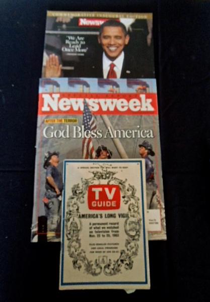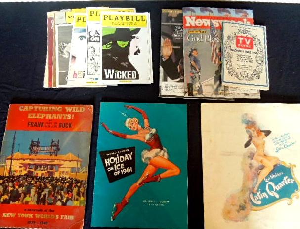 9 Broadway Playbill programs, New York World's Fair memorabilia publication, 1961 Holiday on Ice program, 1960's menu from Latin Quarter, special edition of TV Guide programming from JFK assasination and Newsweek magazine after 9/11. Conditions vary, but no major tears or rips.