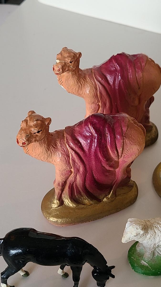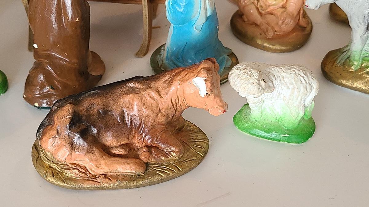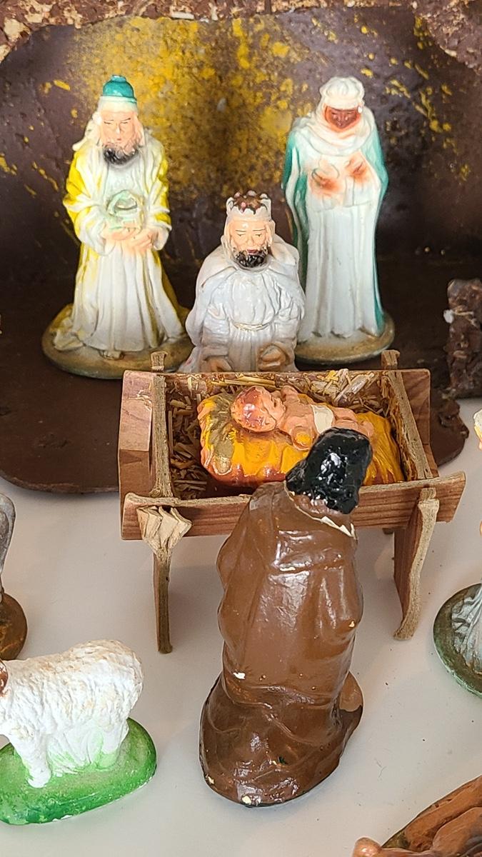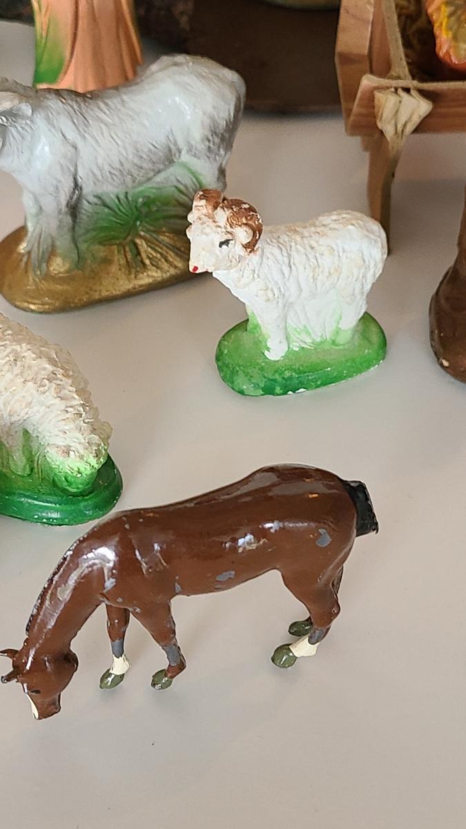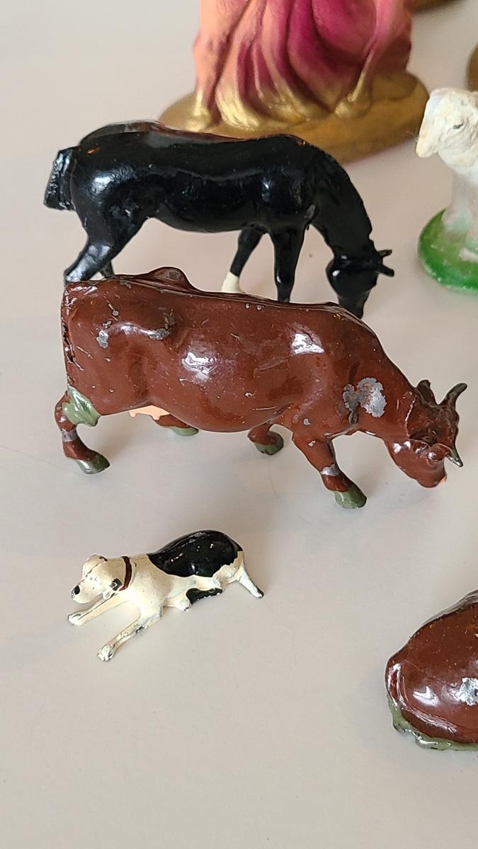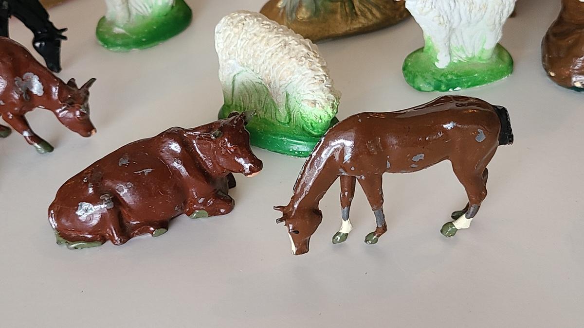 Vintage Chalk-ware nativity set, some of the pieces do have chips. Mary and Joseph both had neck repairs. Also included are vintage metal animals, some have chips to paint due to age, it adds character! Please see all pictures for content of the lot, condition of the lot, and measurements if taken. Pictures are the best representation of the items listed and items are untested unless indicated in description. Thank you for looking and have fun bidding!