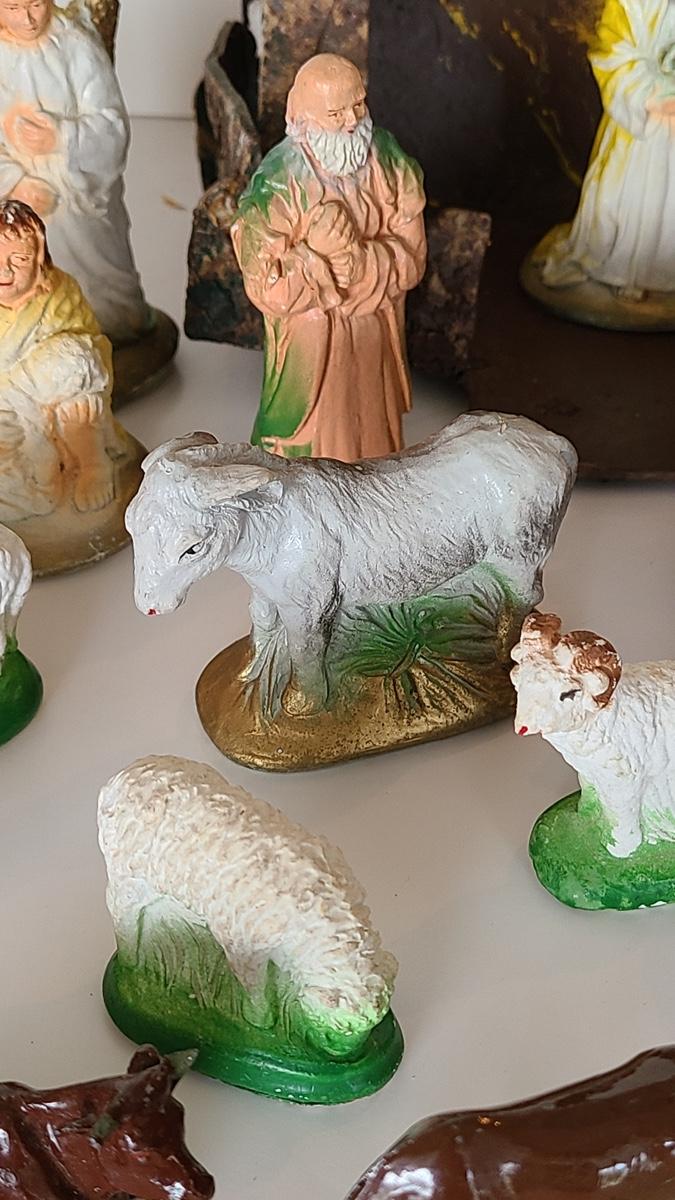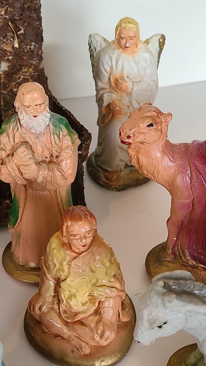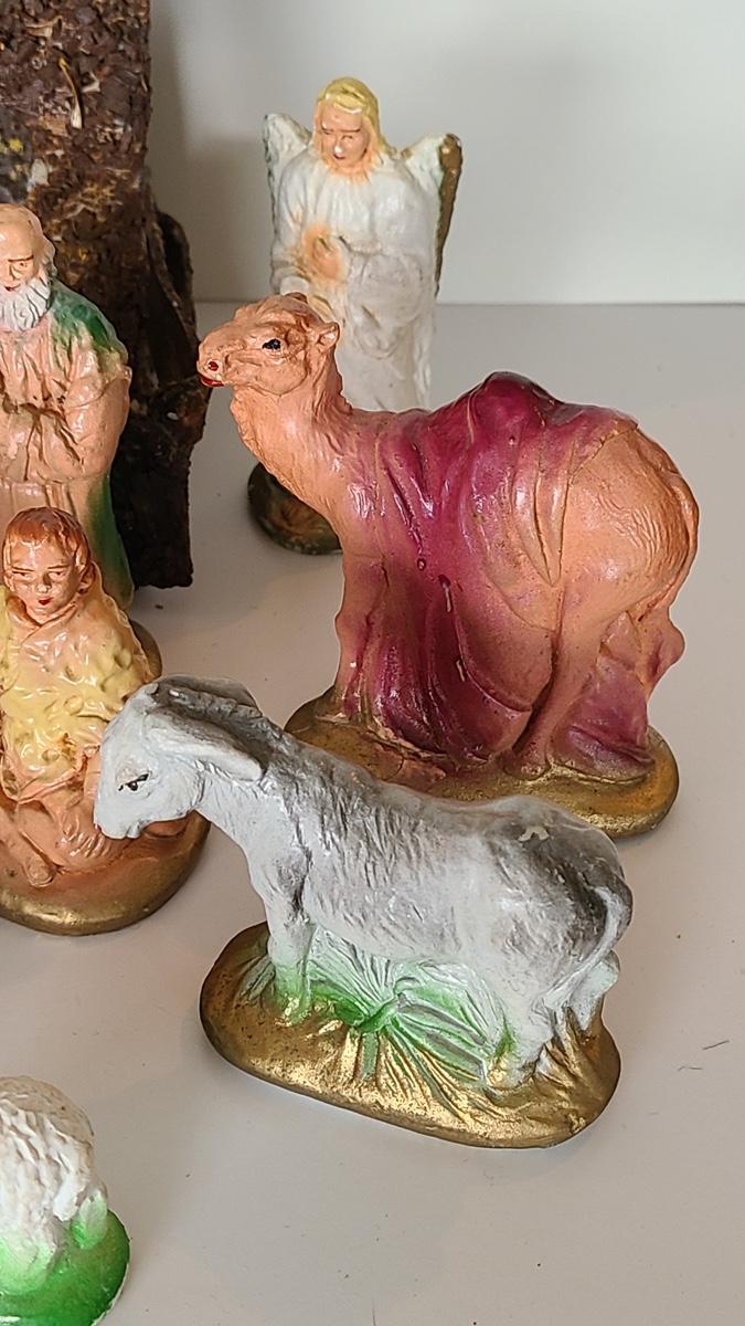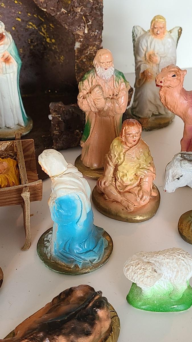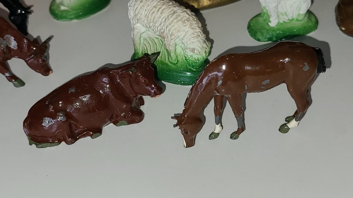 Vintage Chalk-ware nativity set, some of the pieces do have chips. Mary and Joseph both had neck repairs. Also included are vintage metal animals, some have chips to paint due to age, it adds character! Please see all pictures for content of the lot, condition of the lot, and measurements if taken. Pictures are the best representation of the items listed and items are untested unless indicated in description. Thank you for looking and have fun bidding!