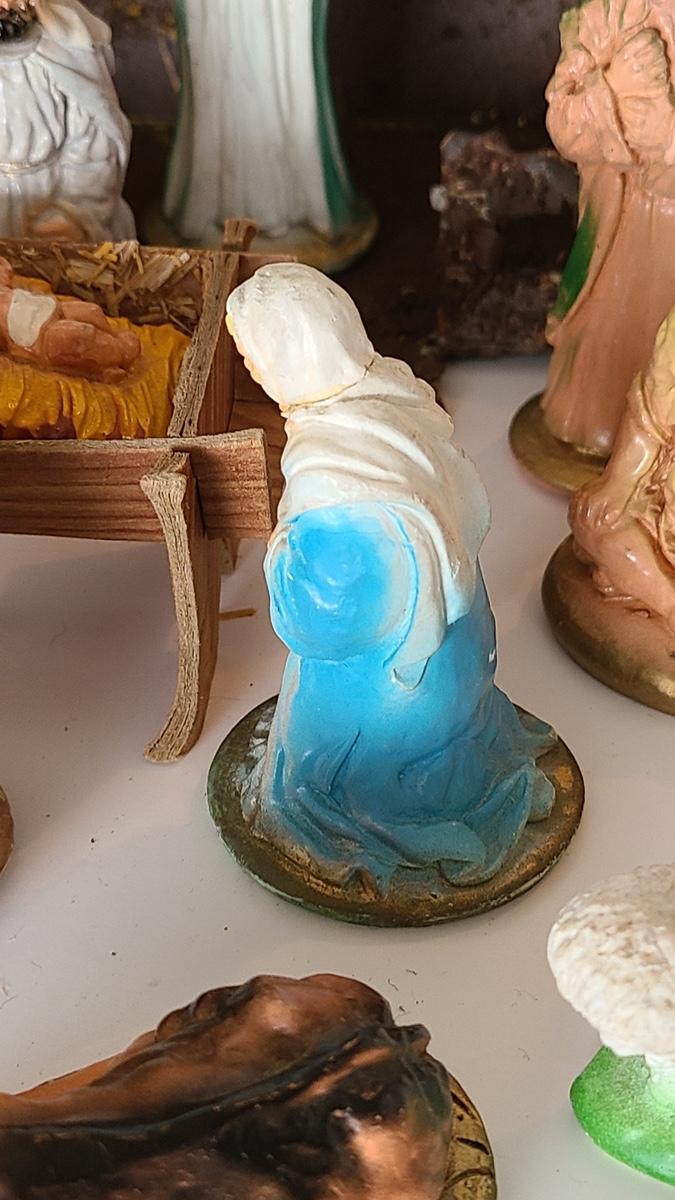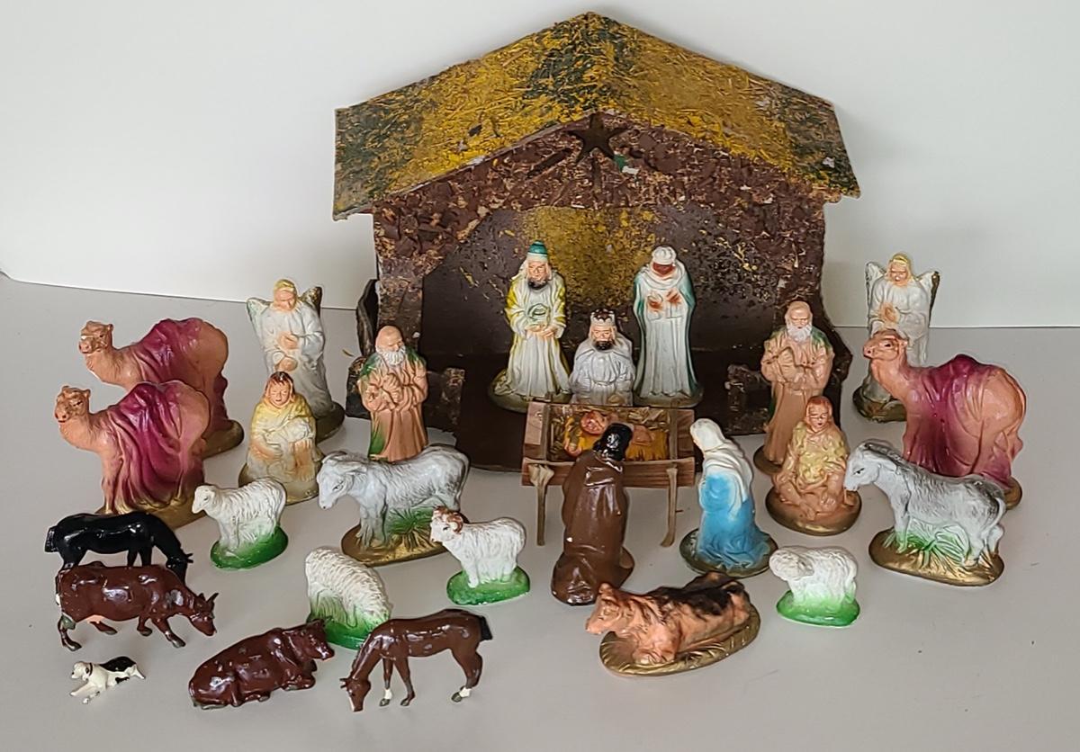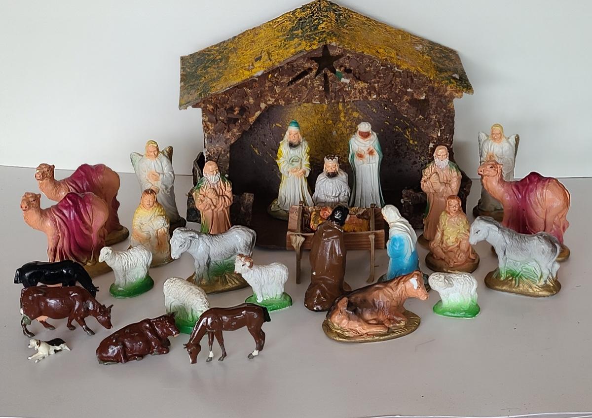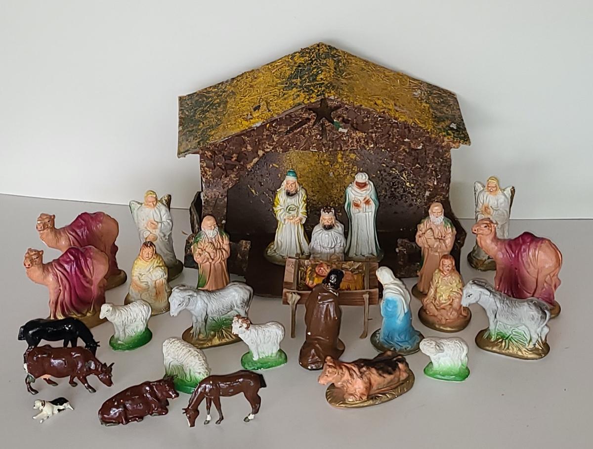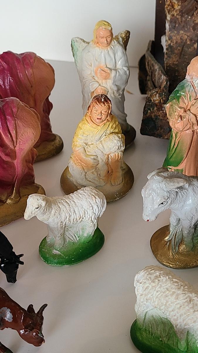 Vintage Chalk-ware nativity set, some of the pieces do have chips. Mary and Joseph both had neck repairs. Also included are vintage metal animals, some have chips to paint due to age, it adds character! Please see all pictures for content of the lot, condition of the lot, and measurements if taken. Pictures are the best representation of the items listed and items are untested unless indicated in description. Thank you for looking and have fun bidding!