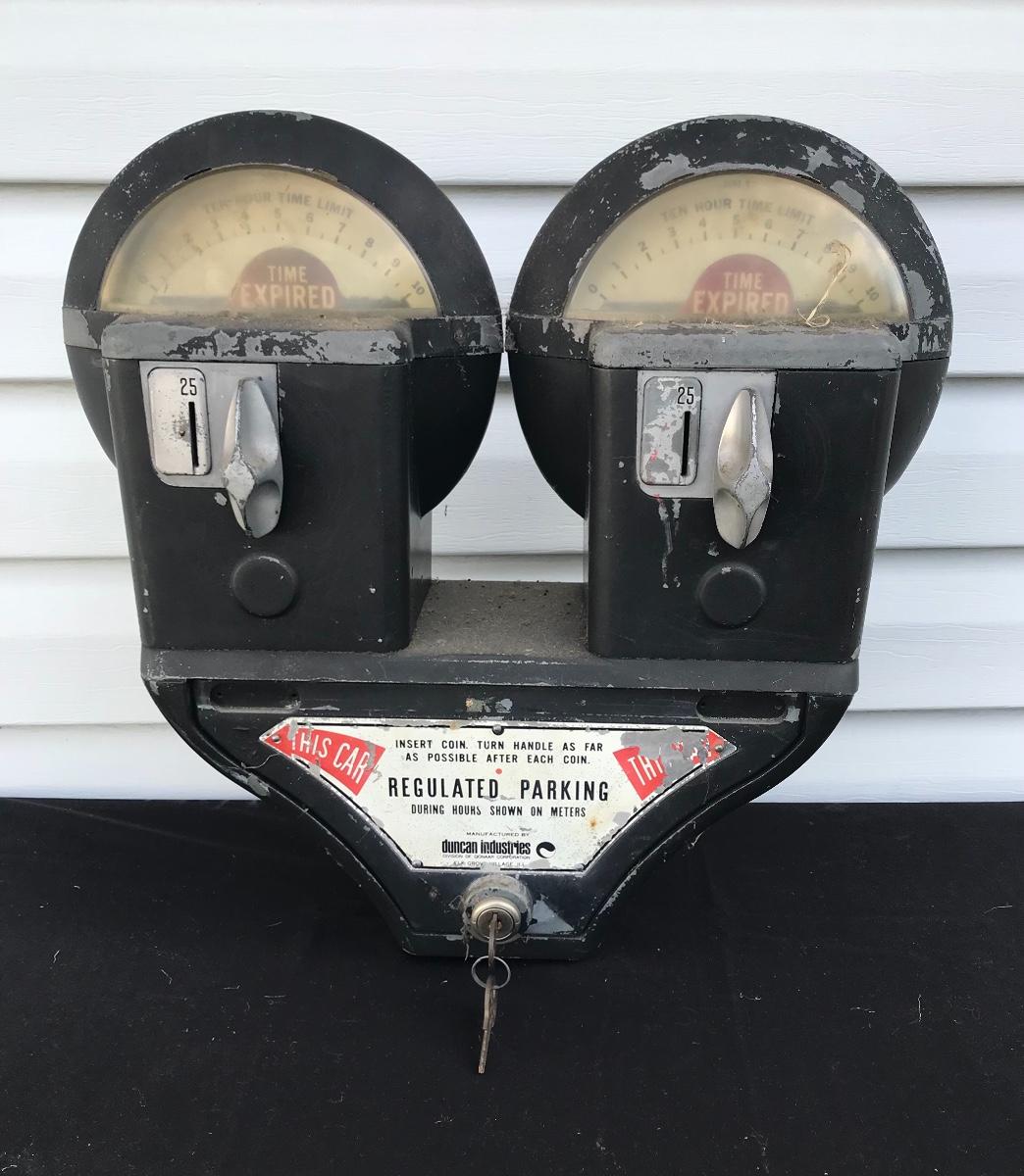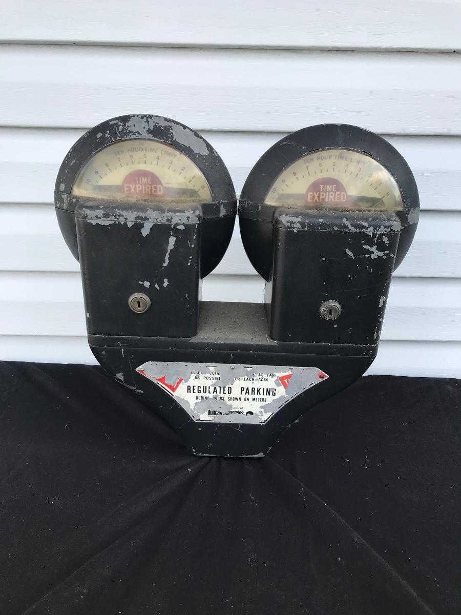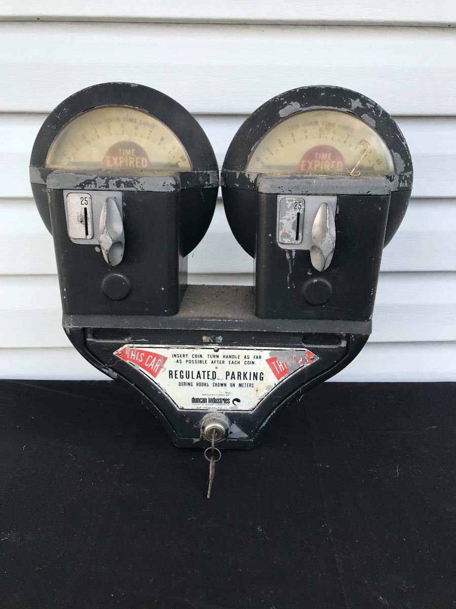 Vintage cast iron double headed parking meter by Duncan Industries - with key. The pictures show condition, measurements if taken, and what is included in the lot. Due to the large amount that we photograph and the time frame, we are not always able to take measurements. All items unless noted, are pre-owned and have been used. If you purchased furniture, you must bring help. We do not allow one person to carry large furniture out on their own. Bring help, tools and a truck for the safety of our client’s homes, and your personal safety. Company policy. Thank you.