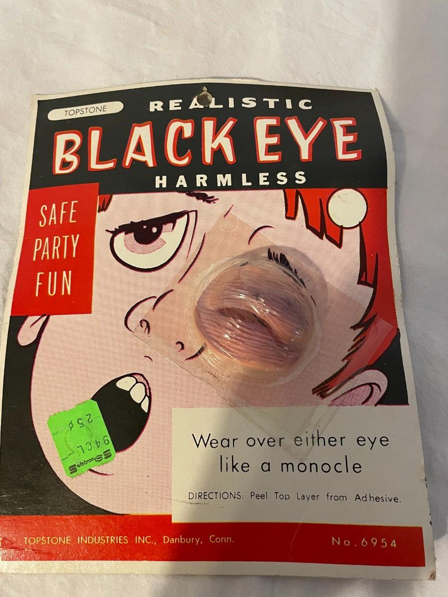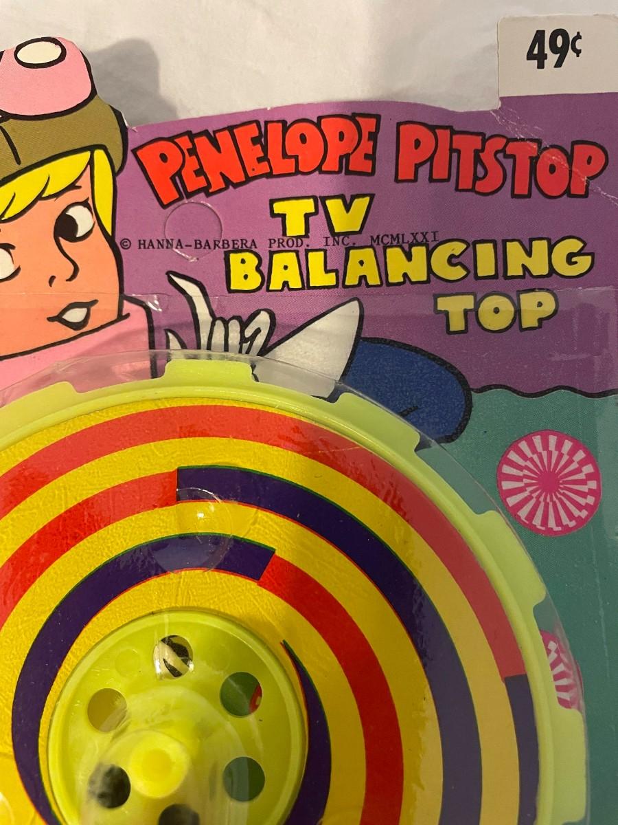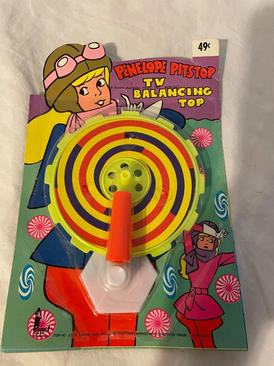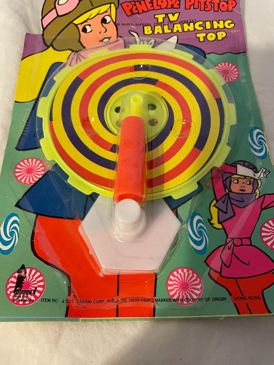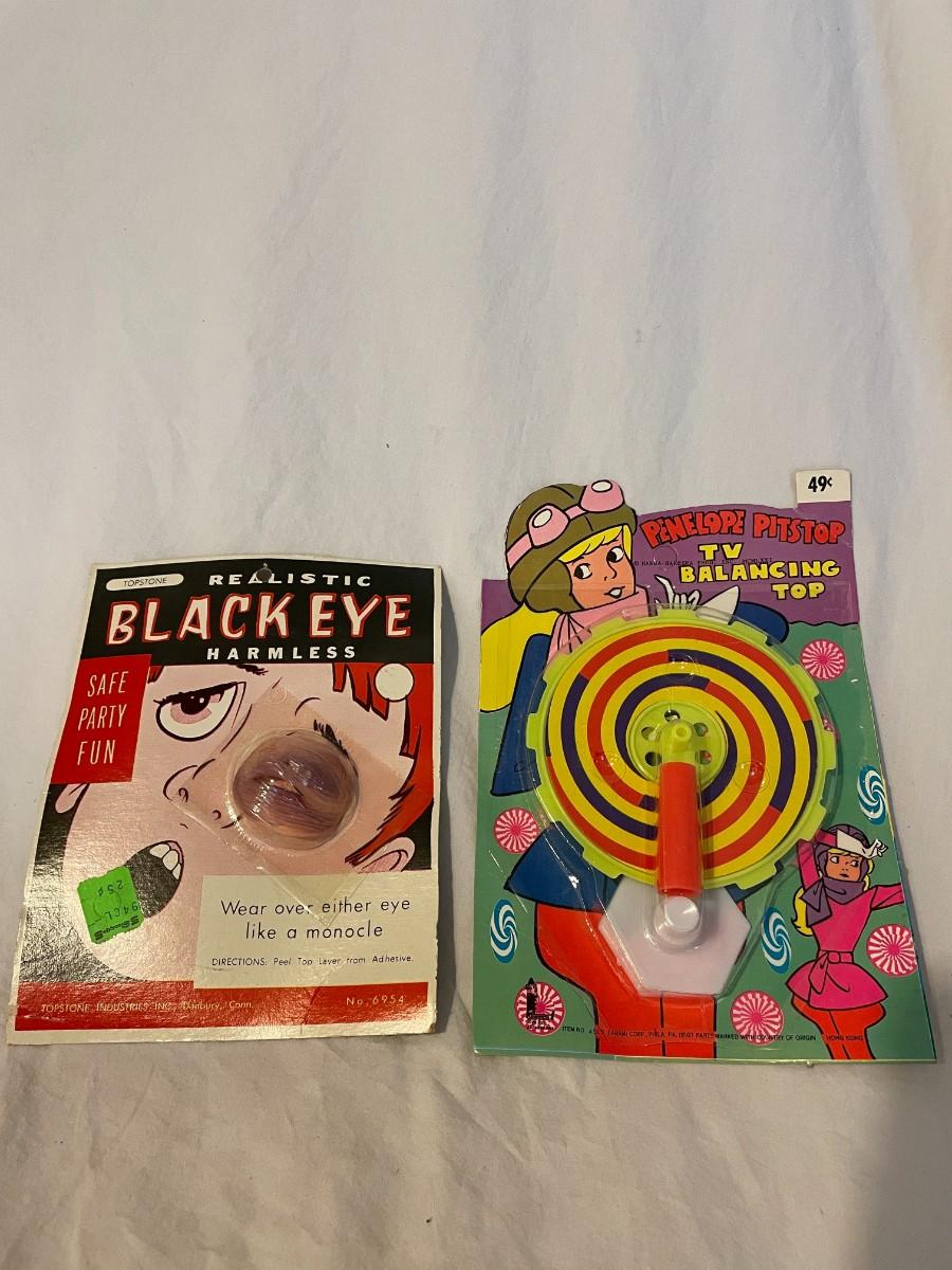 VINTAGE KIDS TOYS. THERES A PENELOPE PITSTOP TV BALANCING TOP, OR A REALISTIC BLACK EYE HARMLESS! SAFE PARTY FUN.