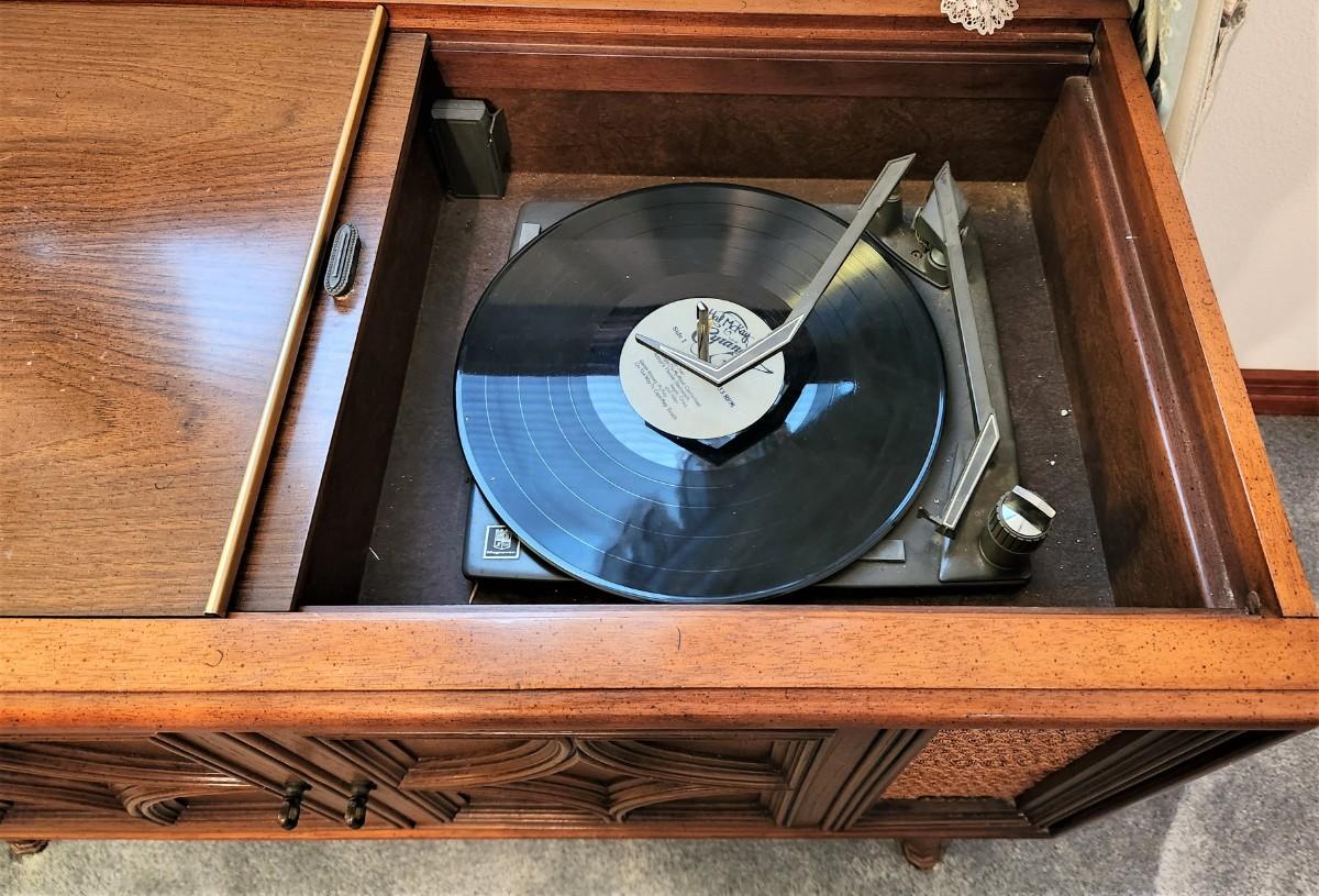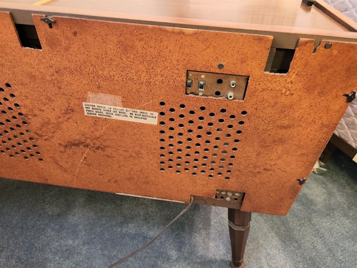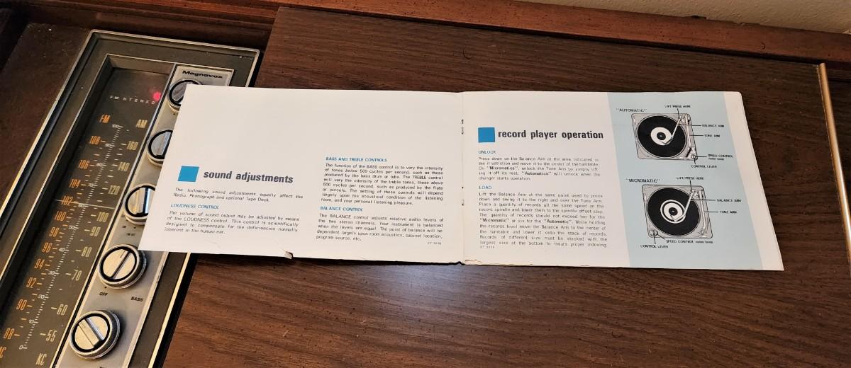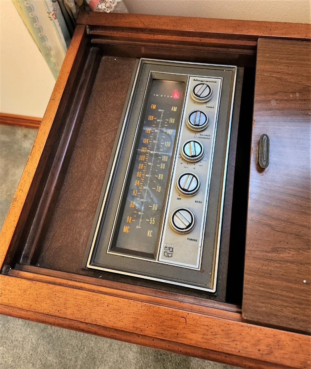 Vintage Magnavox Stereo am/fm radio with turntable - pecan finish, model #1P3319 - has original instruction book - works. Powers up, radio works, speakers are both working, turntable plays - note: STILL a project piece and will likely need some adjustment after moving. This piece is upstairs and buyer will have to move it.
