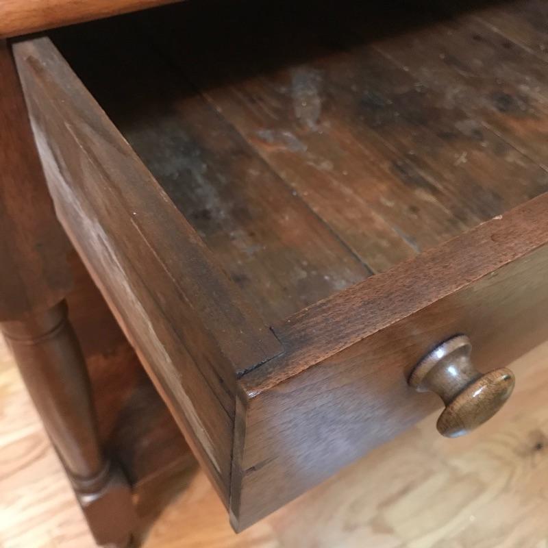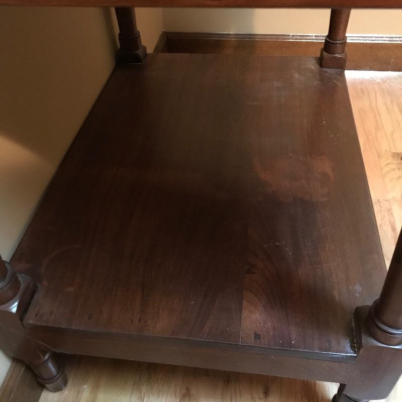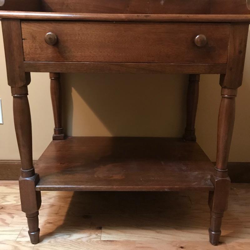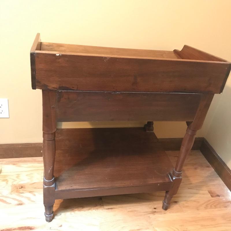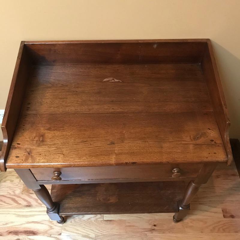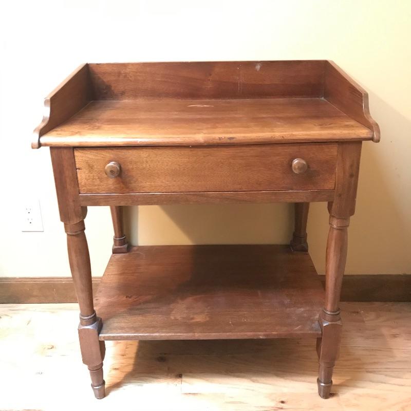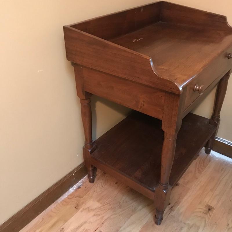 What a stunning versatile piece we have just for you! This piece is very sturdy, but lightweight, making us assume it is solid wood throughout. The inside of the drawer is a darker stained wood, also leaving us to assume it has been refinished at some point. This stand has one drawer with wooden pulls, it’s fantastic simple elegant design will stand out no matter what purpose you choose for it. There are a couple blemishes shown in photos. Piece measures 29.5” x 19.75” x 34.25”. Local pick up only.