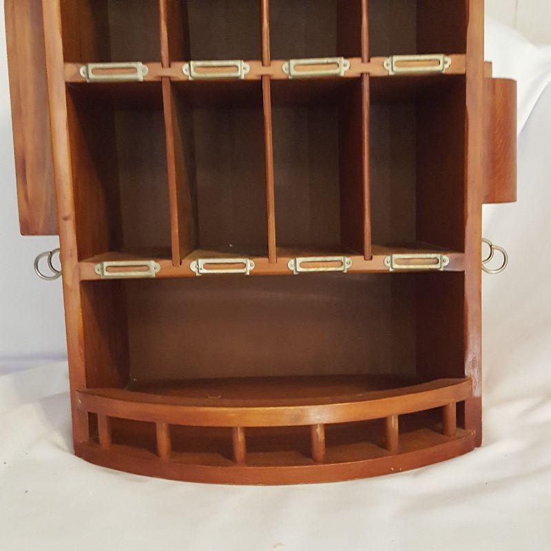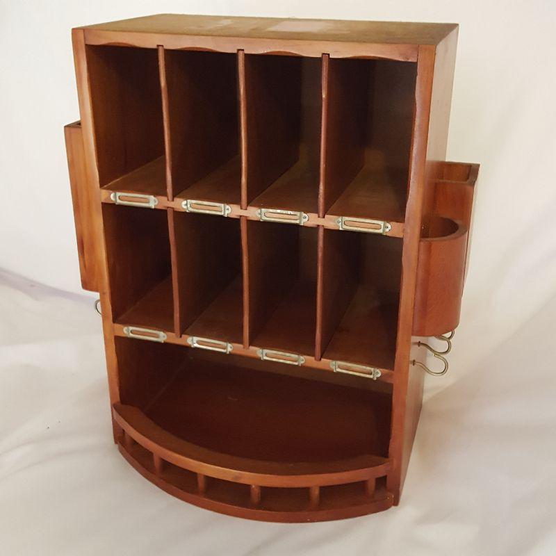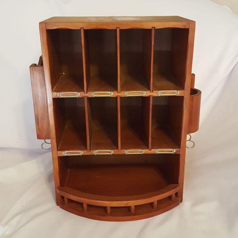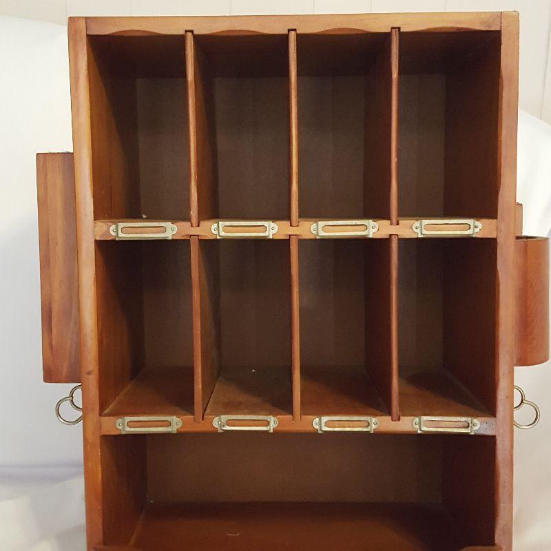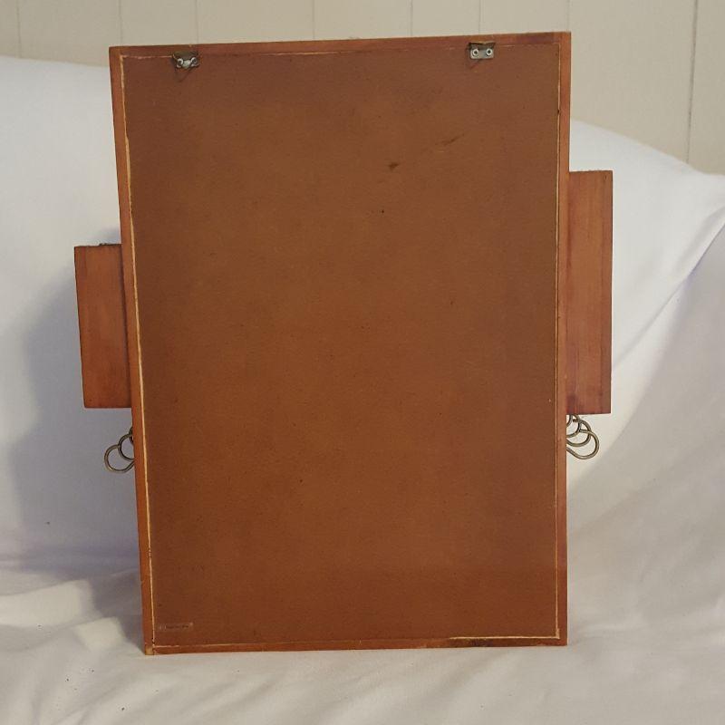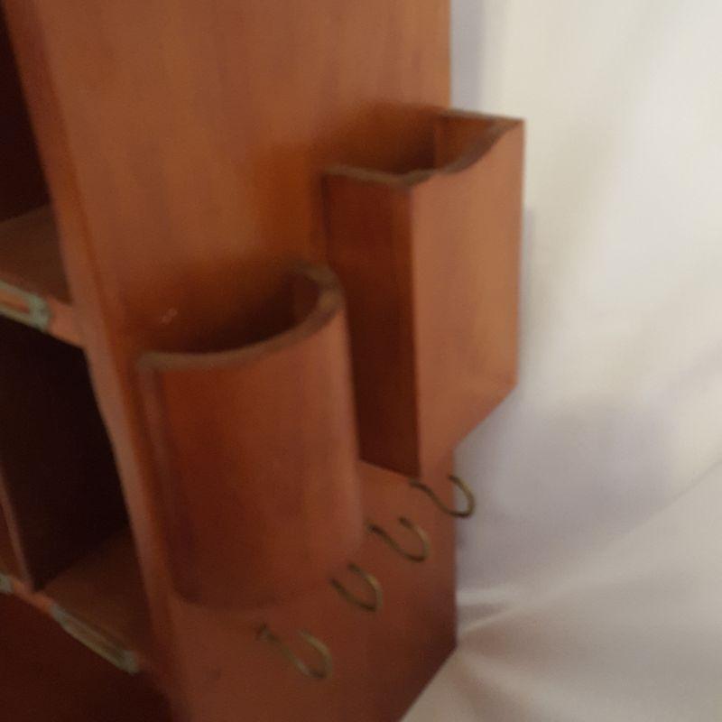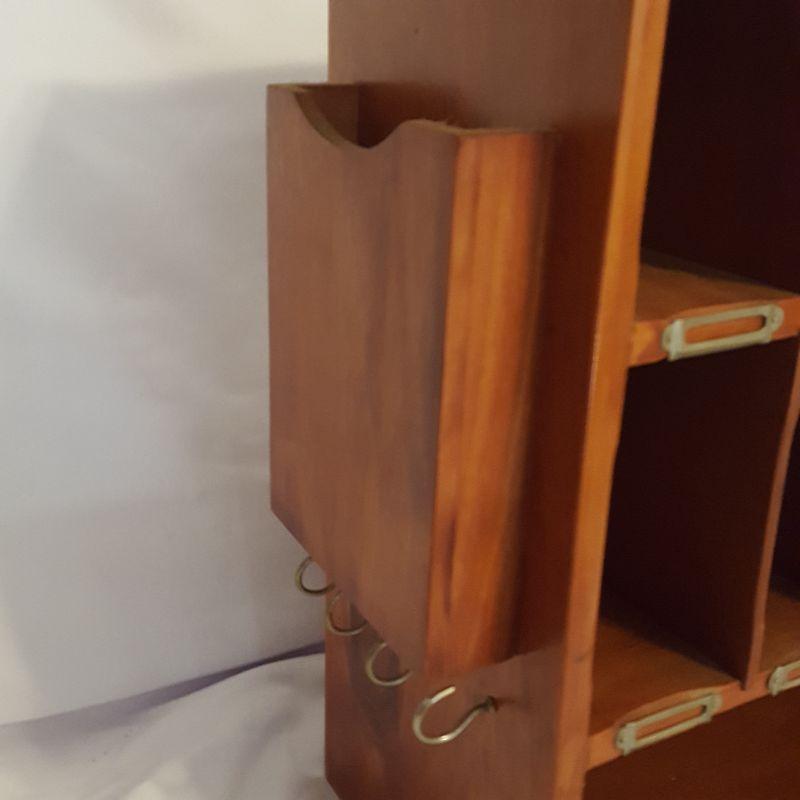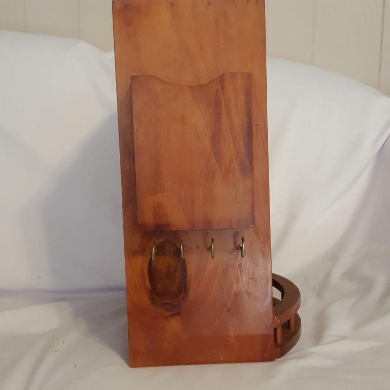 Get organized for the new year! This wooden mail organizer would be a great piece mounted on a wall or as a desk organizer. This wooden piece measures 10x15x18 inches and has hooks on the back ready to hang. There are slots for mail, envelopes, key holders and anything else you want to keep in a safe spot. This piece appears to be in good condition. Shipping available.