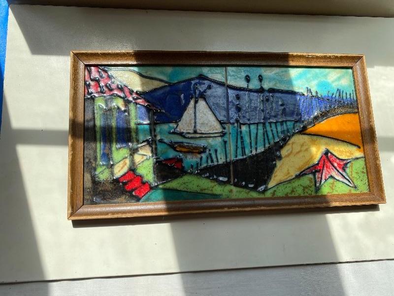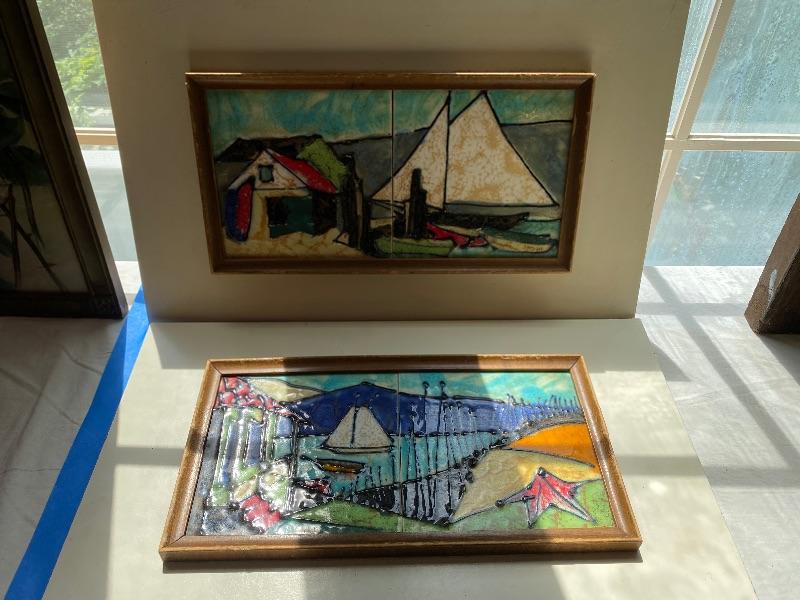 Pair of framed handpainted tile artwork With a nautical seem measuring 12 1/2” x 6 1/2”