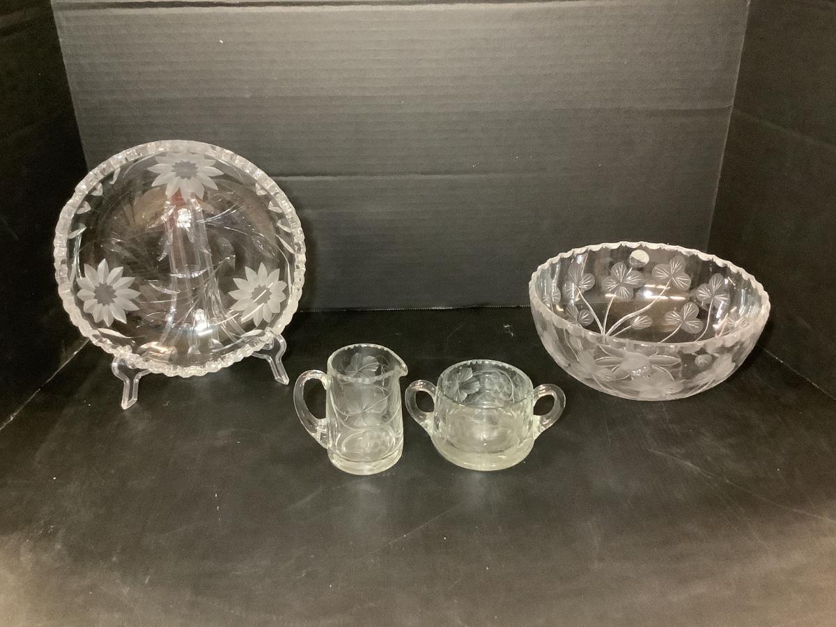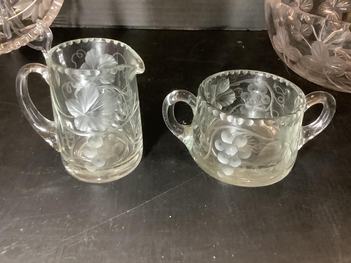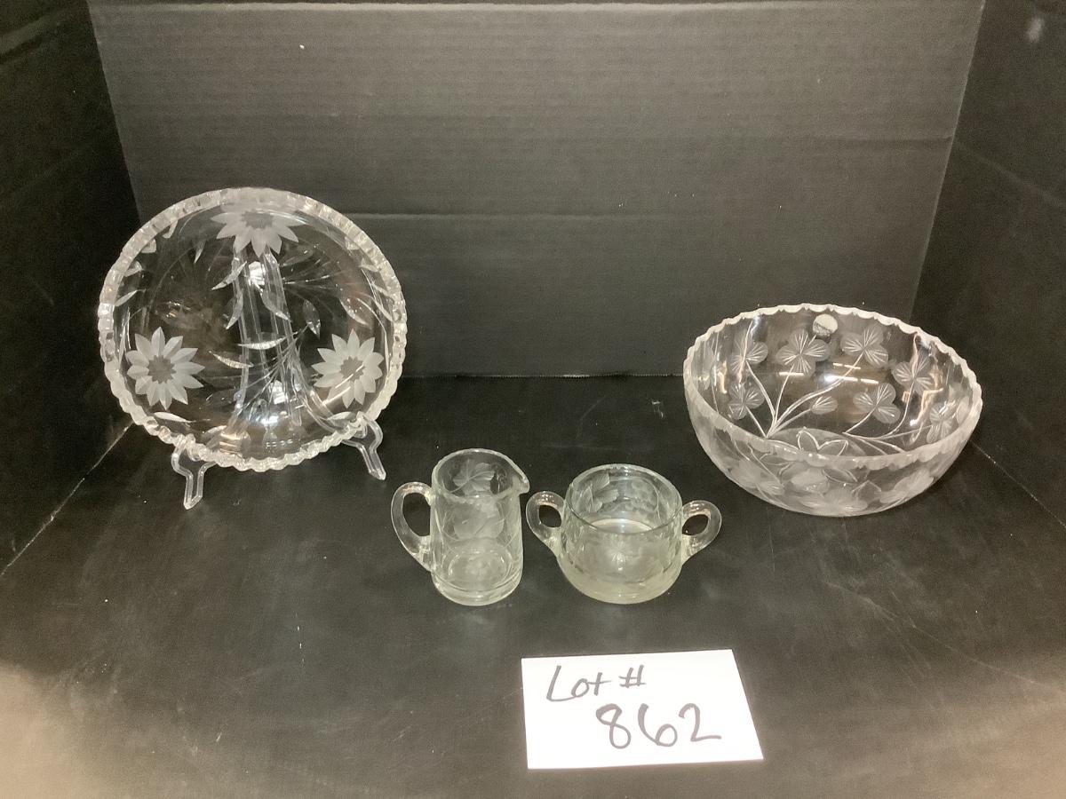 Lot 862. Pressed Glass Cream/Sugar, Etched Press Glass Bowls