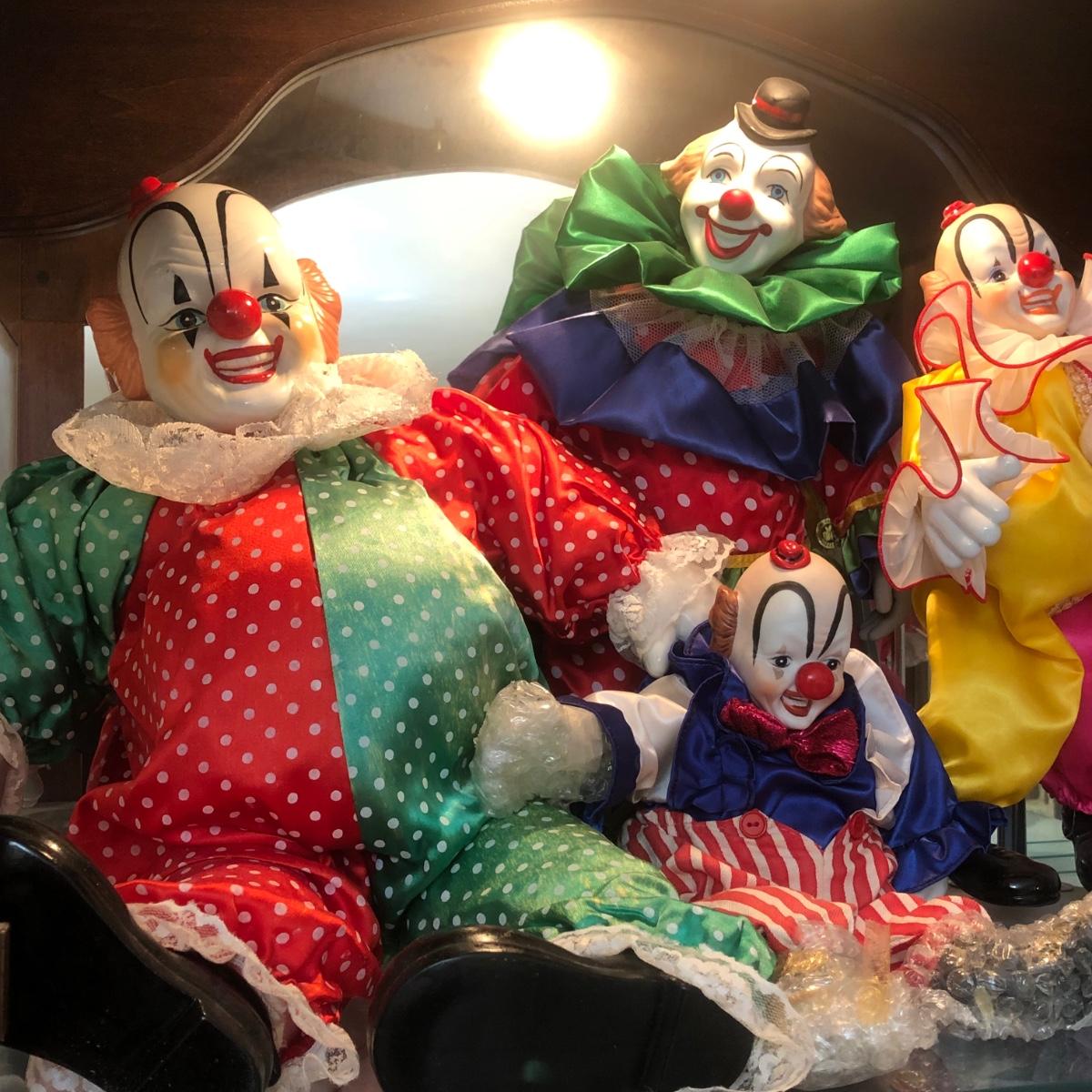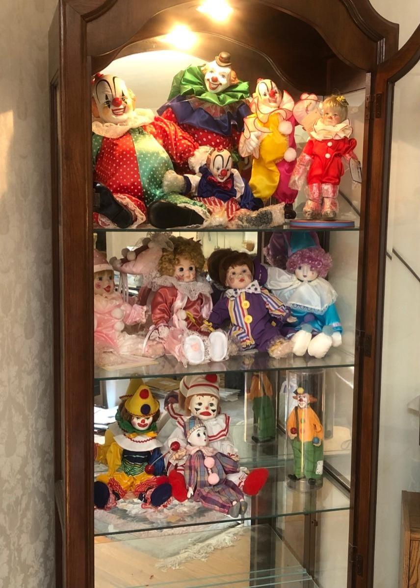 Includes three shelves of clown dolls. Cabinet not included.