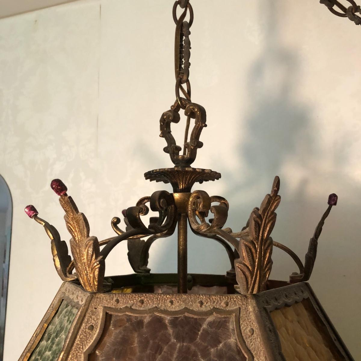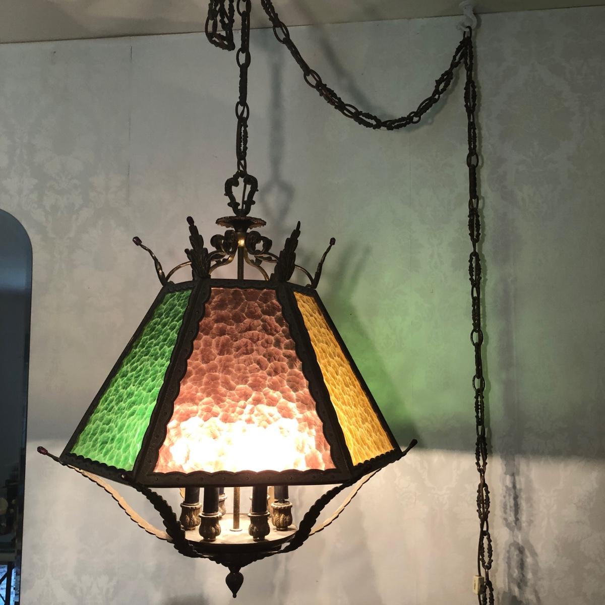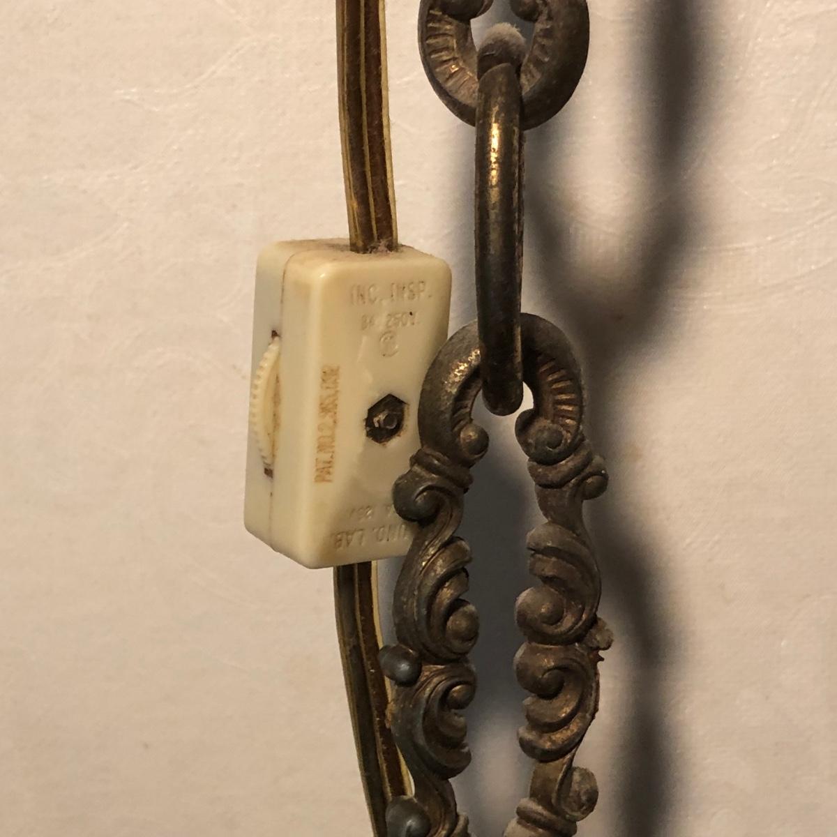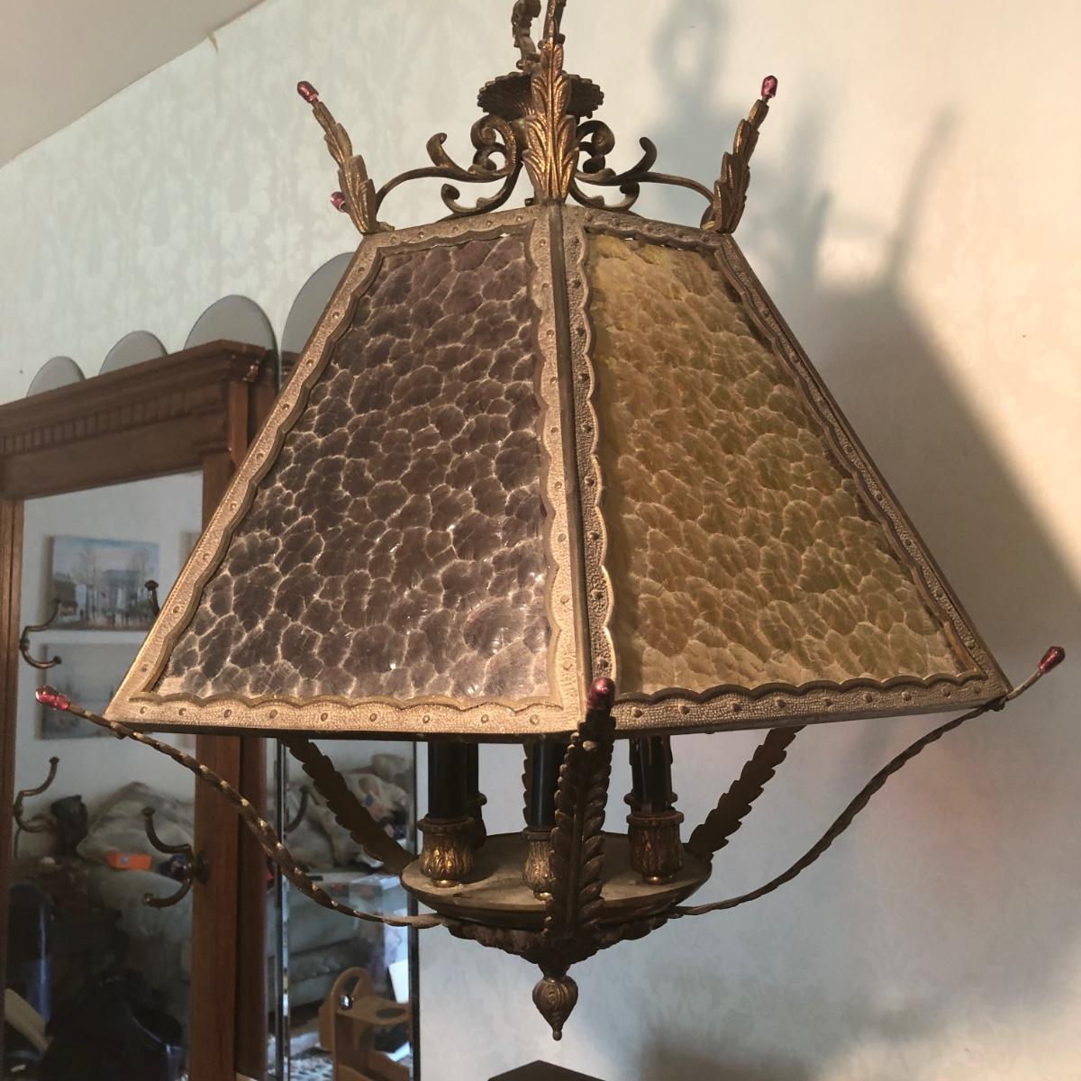 Lamp is in working order. Measures 20W x 25H, not including the chain.