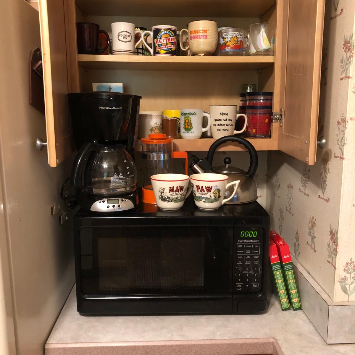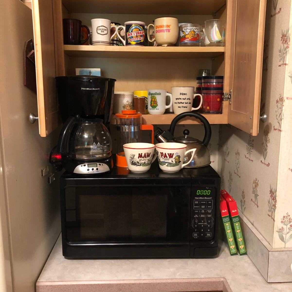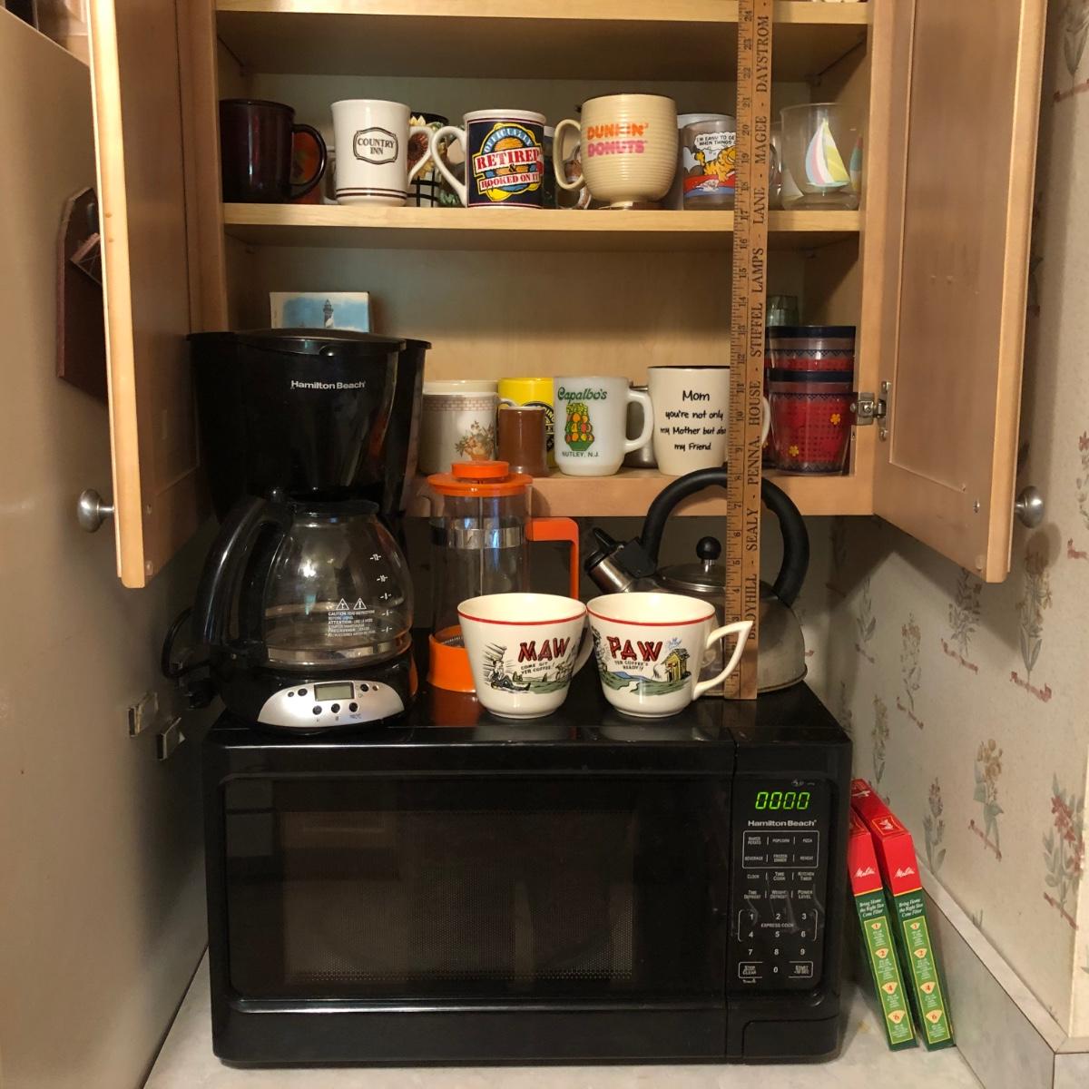 Microwave is clean and in working condition. Includes two shelves of mugs, a coffee maker, orange french press, and tea kettle.