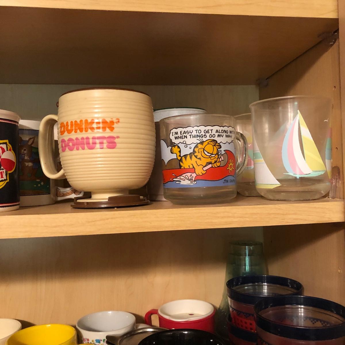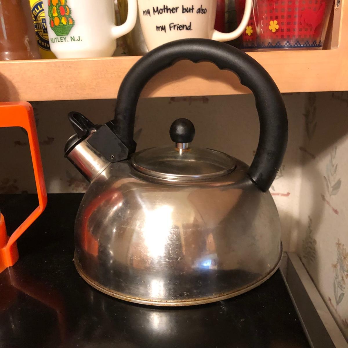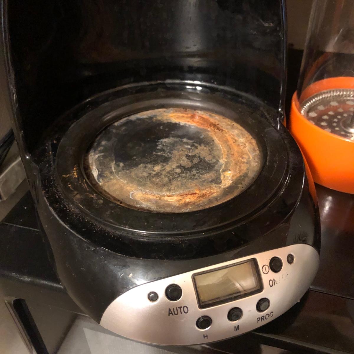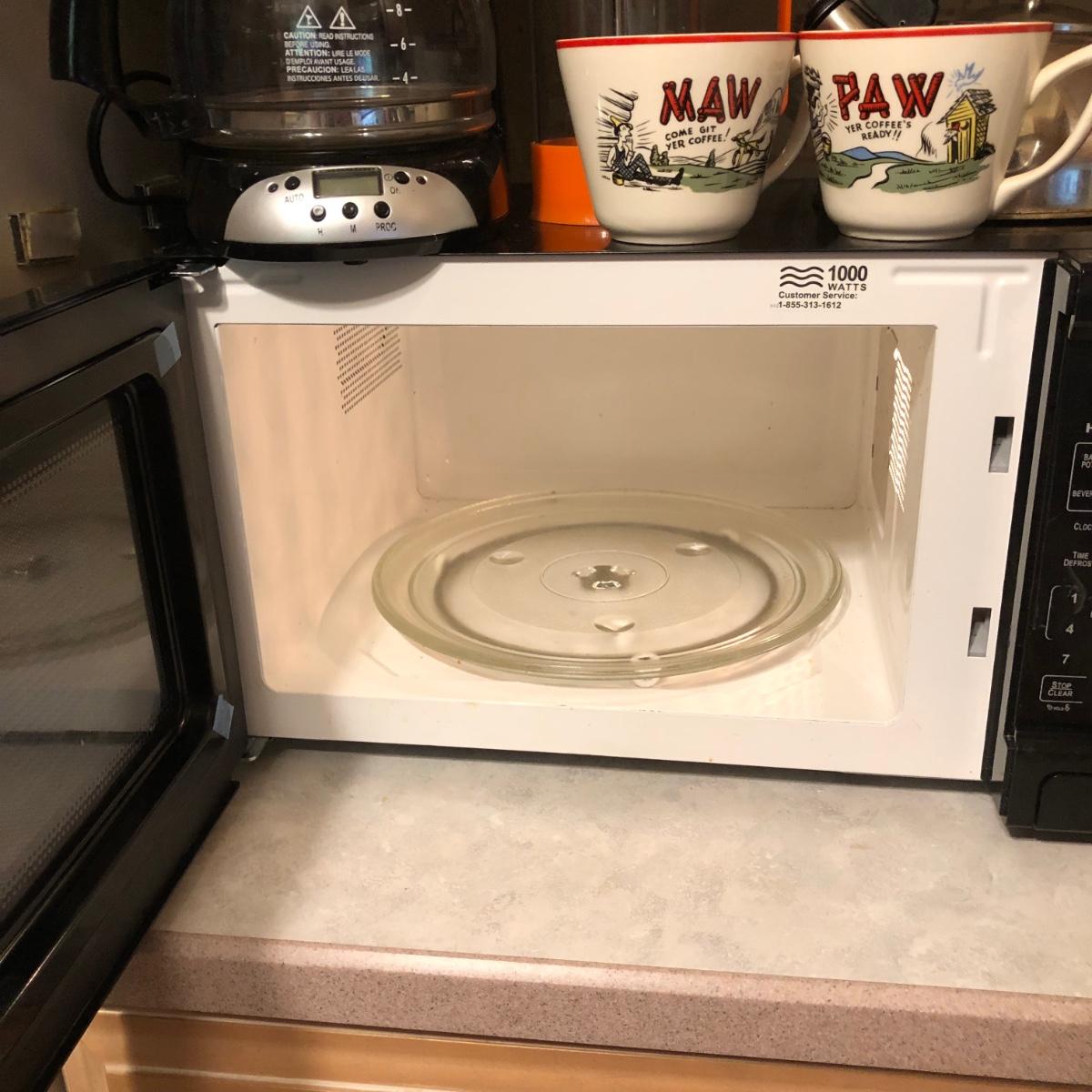 Microwave is clean and in working condition. Includes two shelves of mugs, a coffee maker, orange french press, and tea kettle.