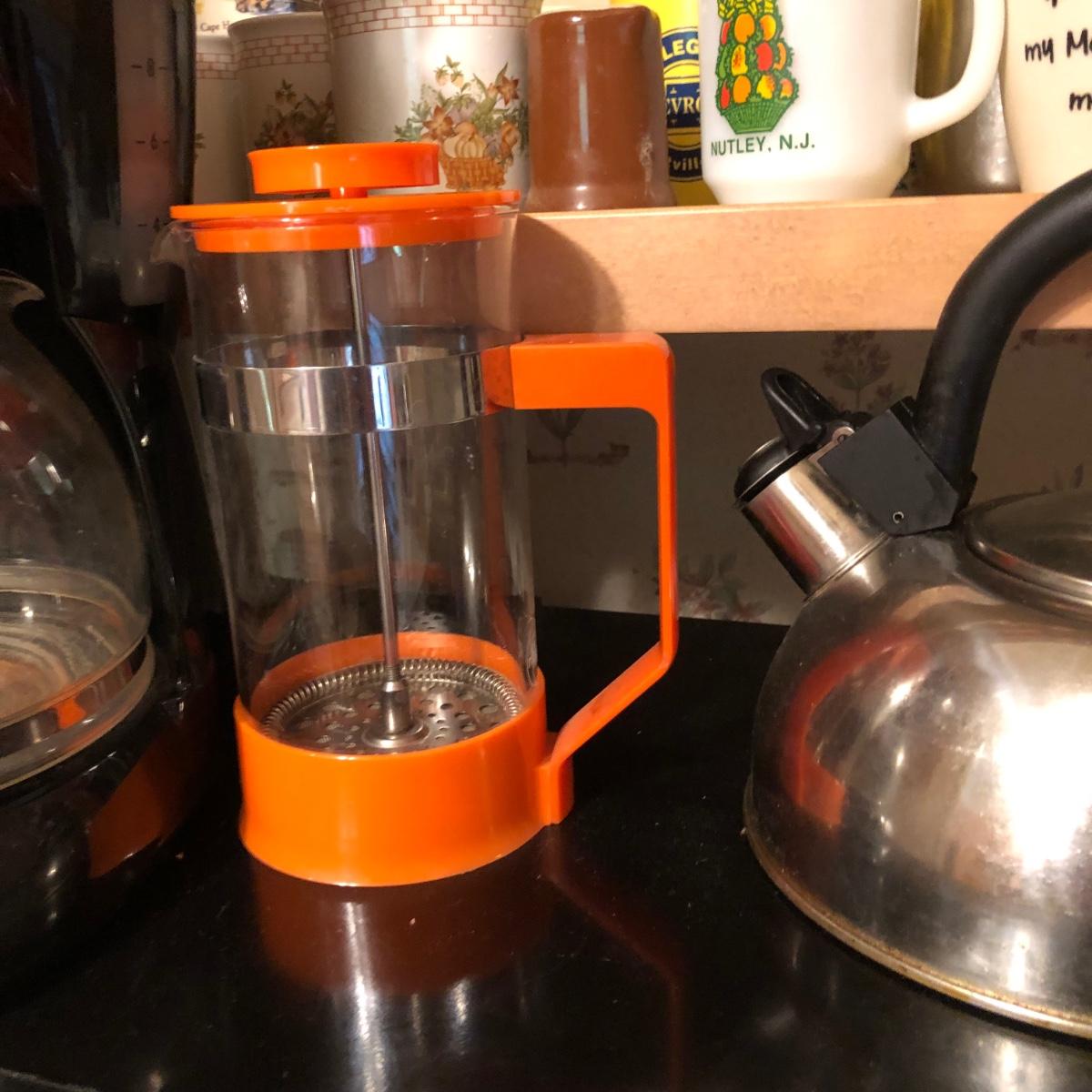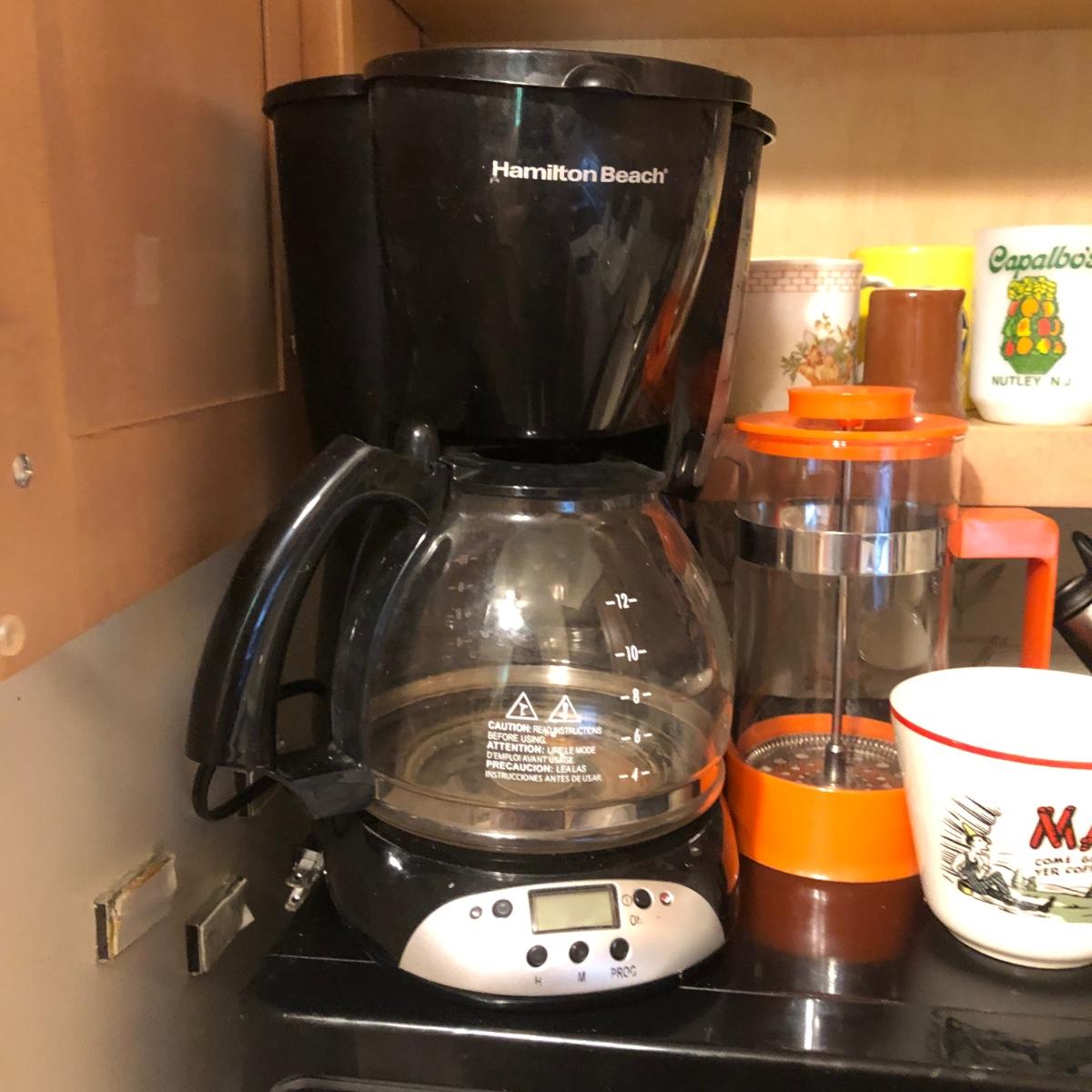 LOT 14M: Hamilton Beach Microwave, Hamilton Beach Coffee Maker Model 49465R, Orange French Press, Tea Kettle & Mug Collection