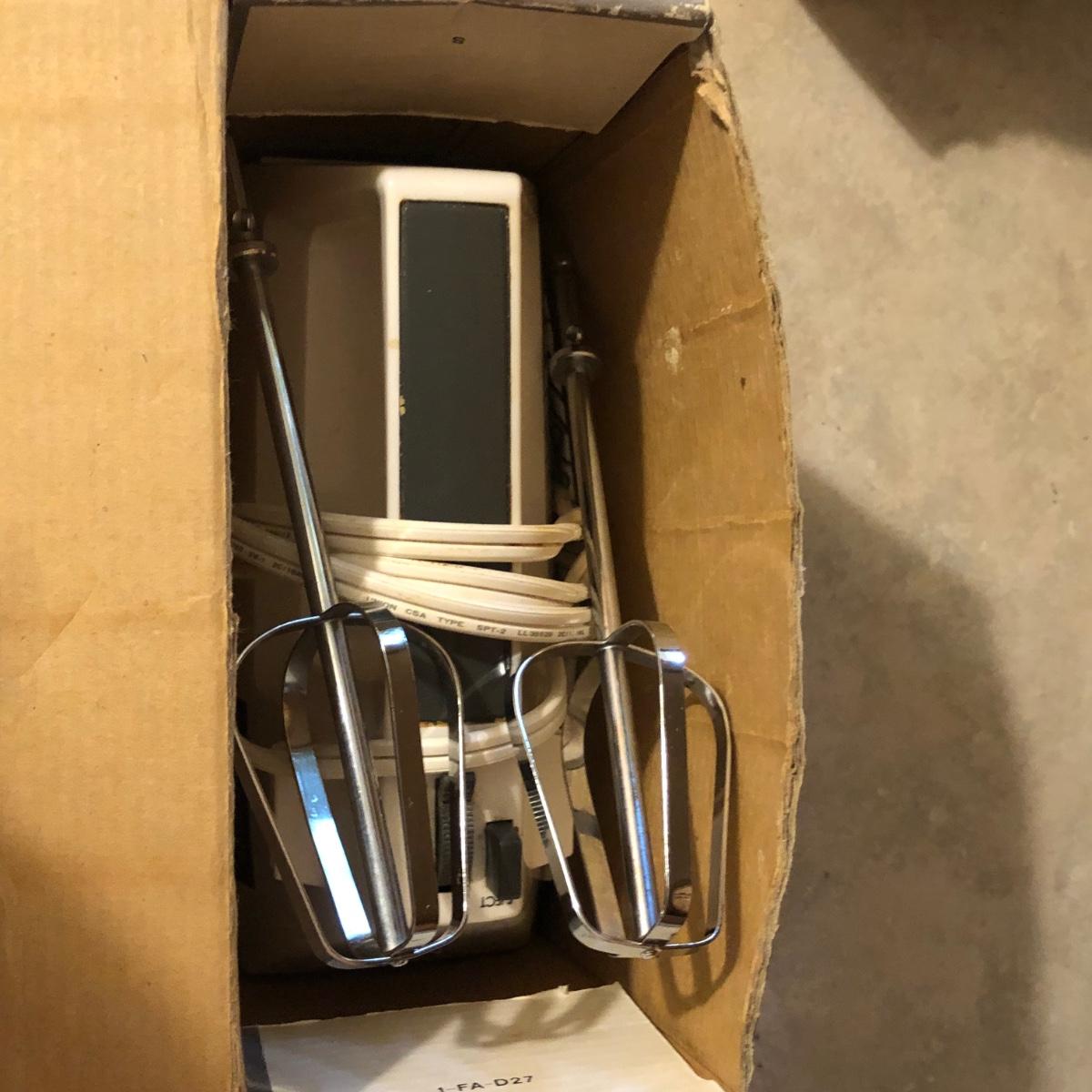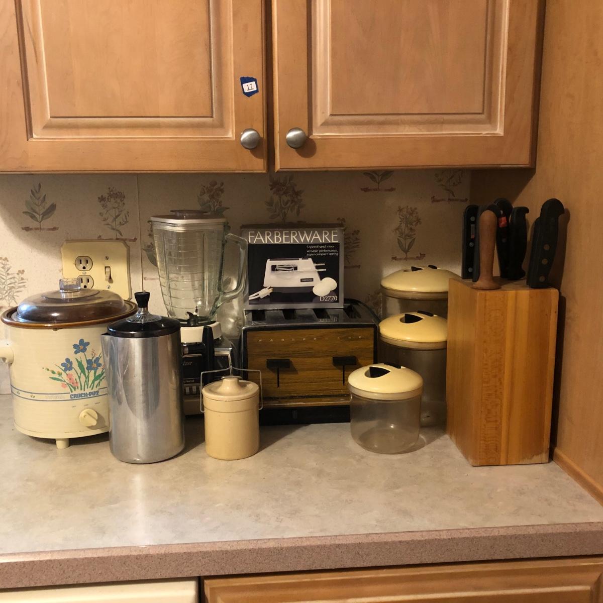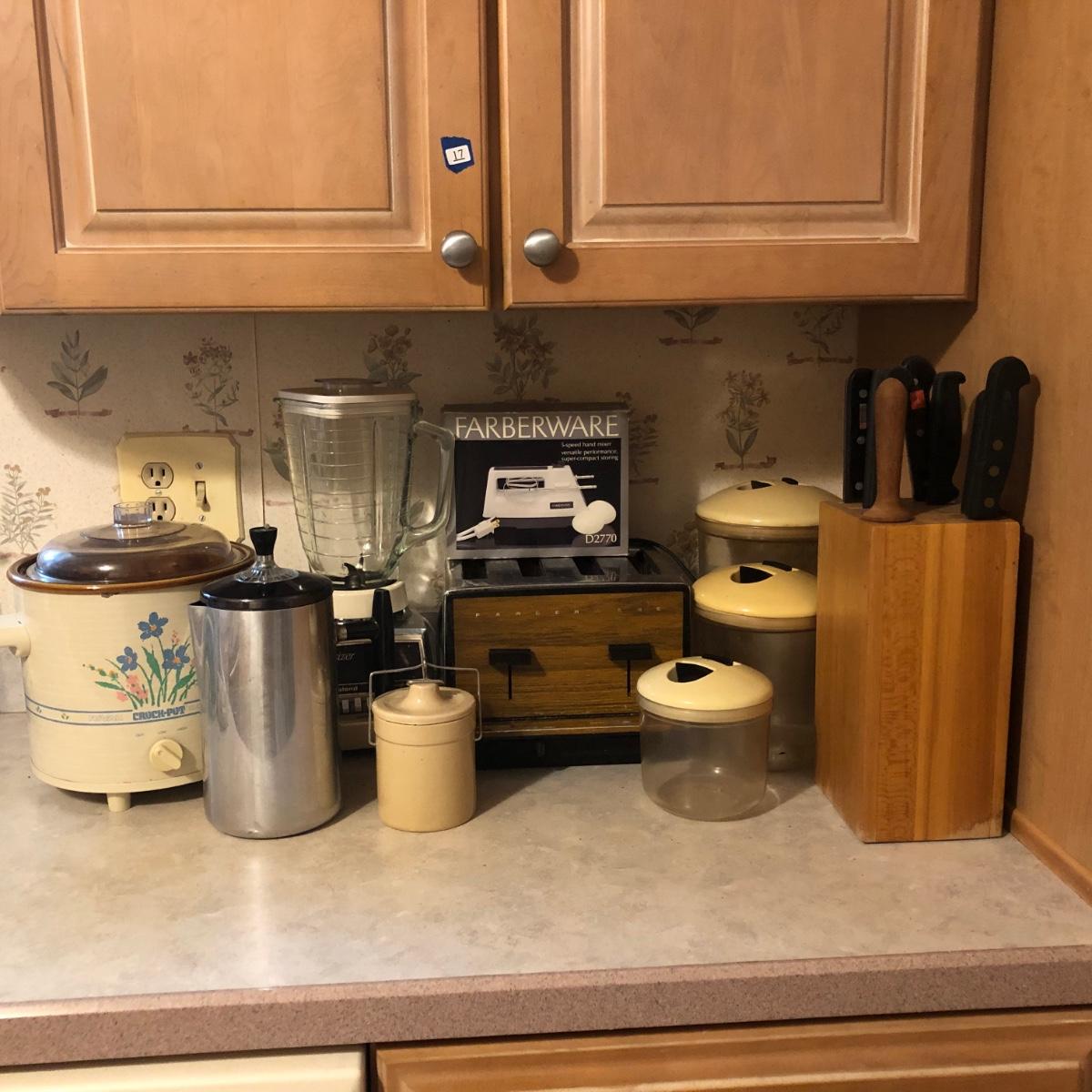 Also includes Farberware 5-speed hand mixer in box, a Wear Ever percolator, plastic canisters, a small crock, a knife block with knives & a sharpener.