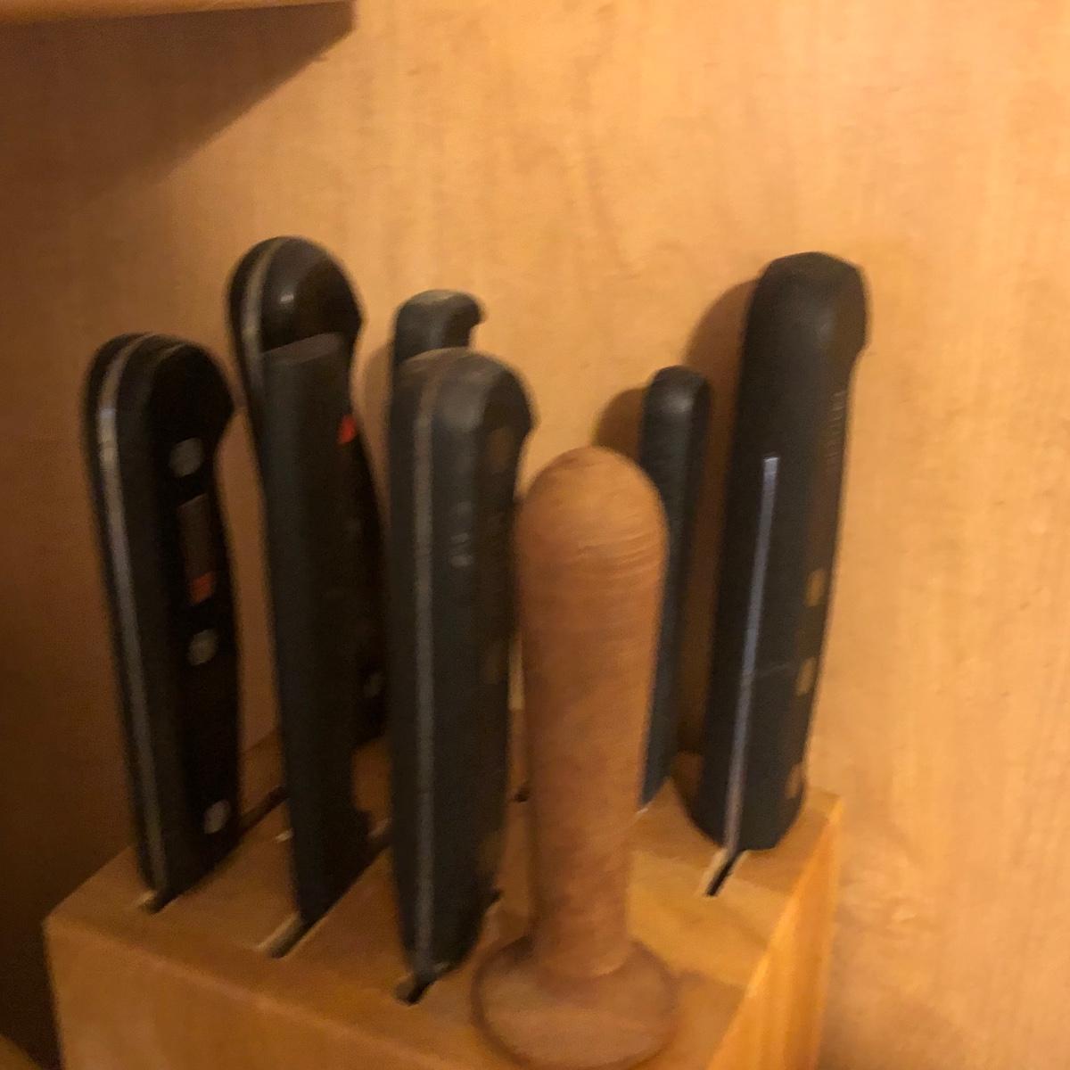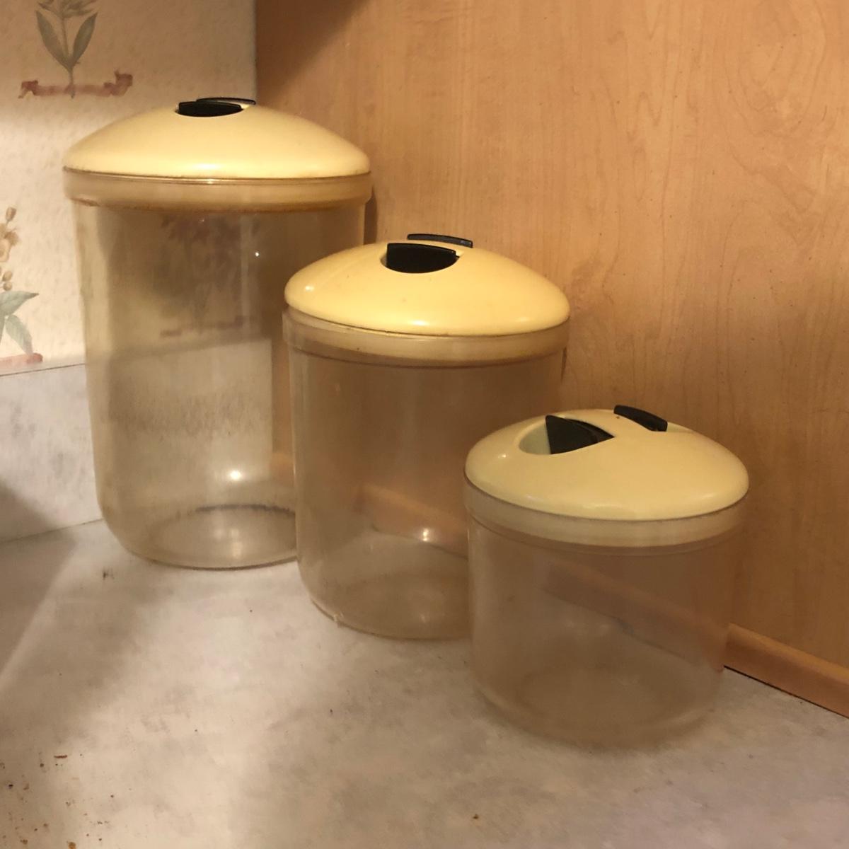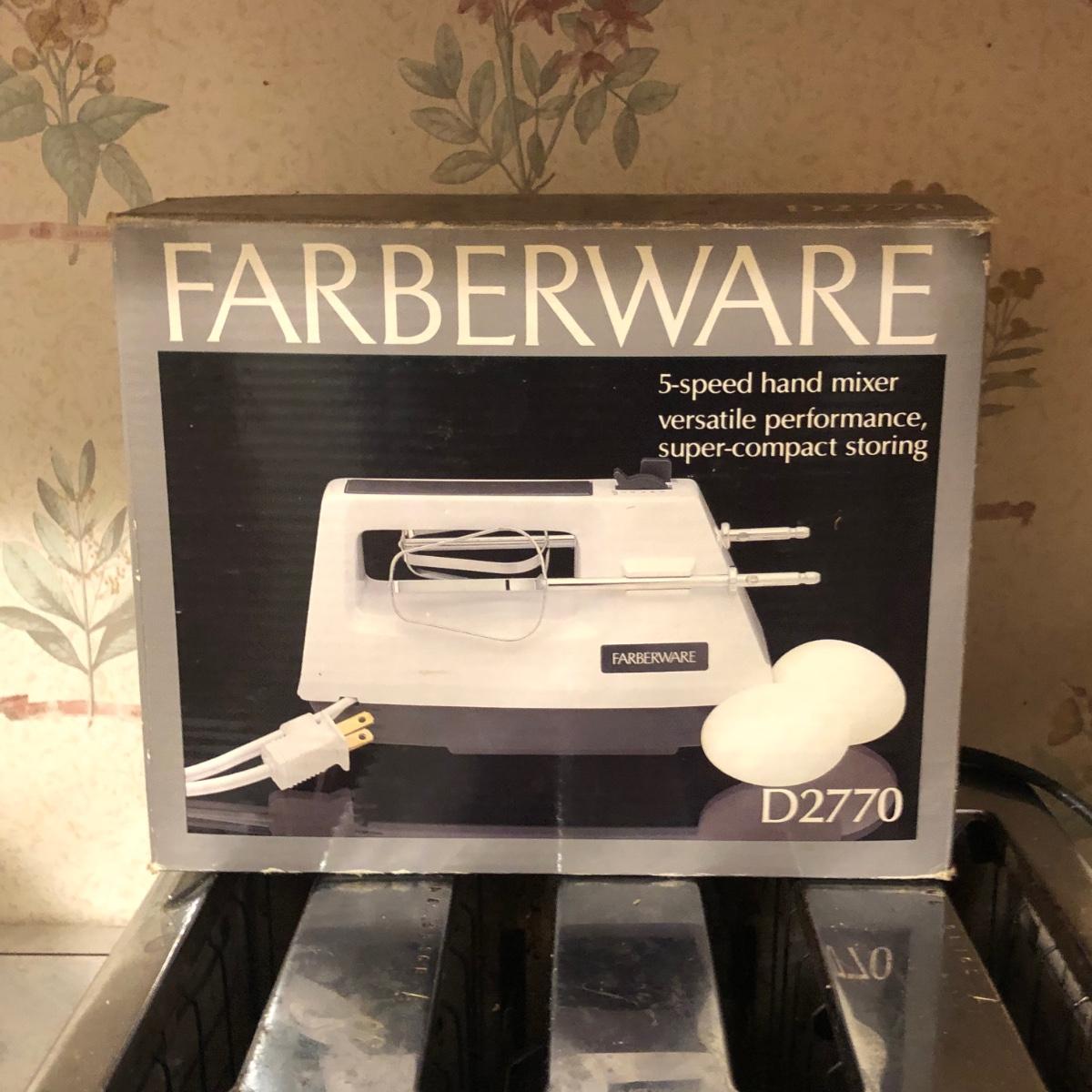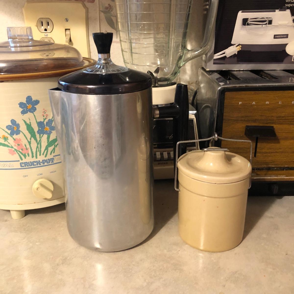 Also includes Farberware 5-speed hand mixer in box, a Wear Ever percolator, plastic canisters, a small crock, a knife block with knives & a sharpener.
