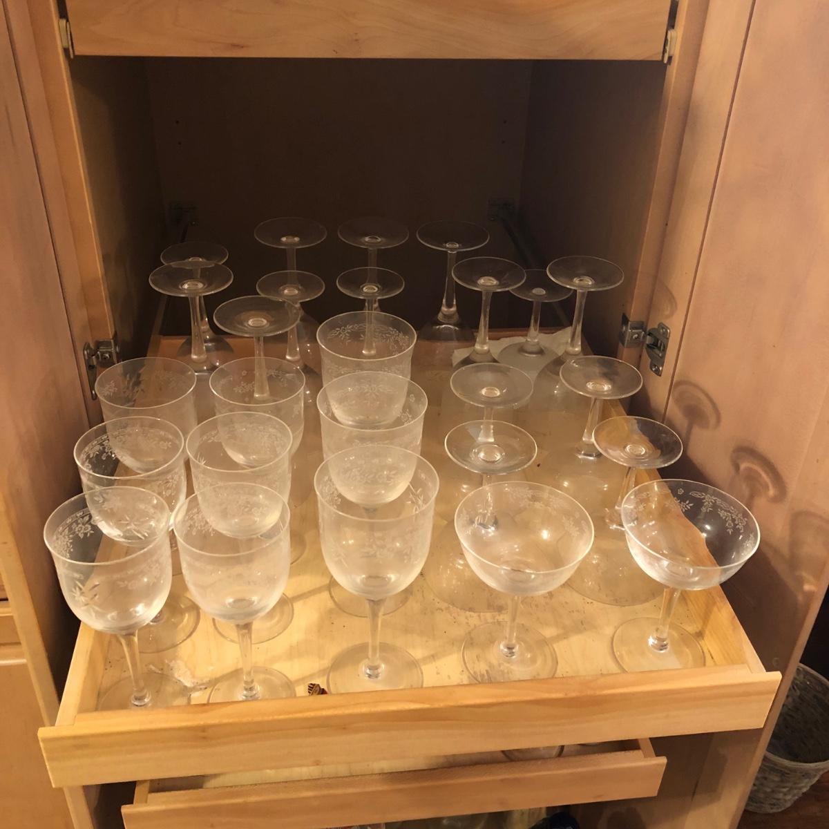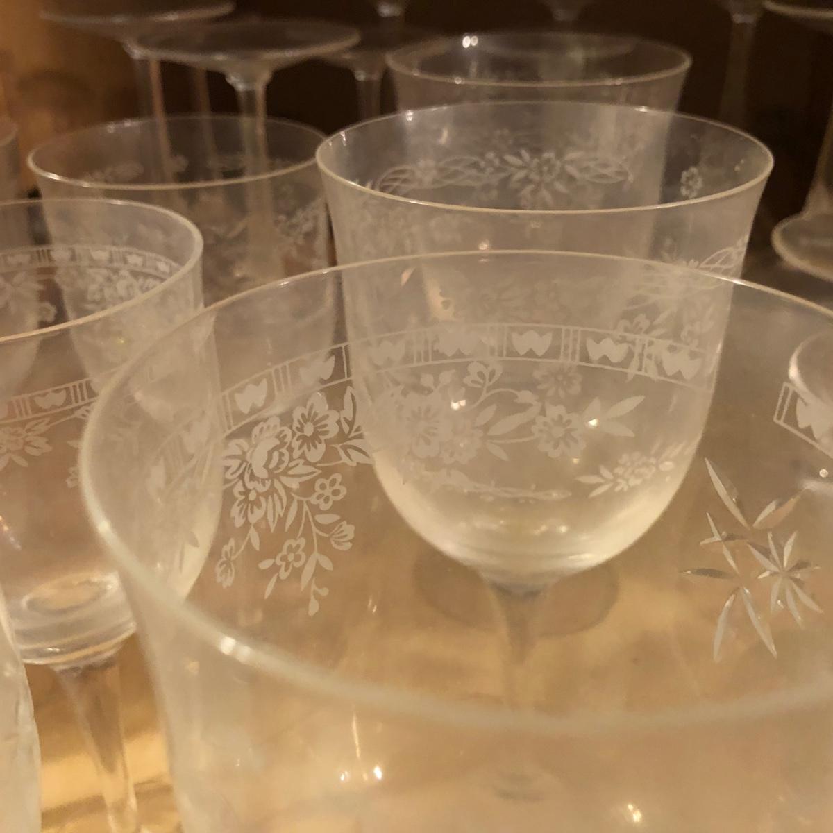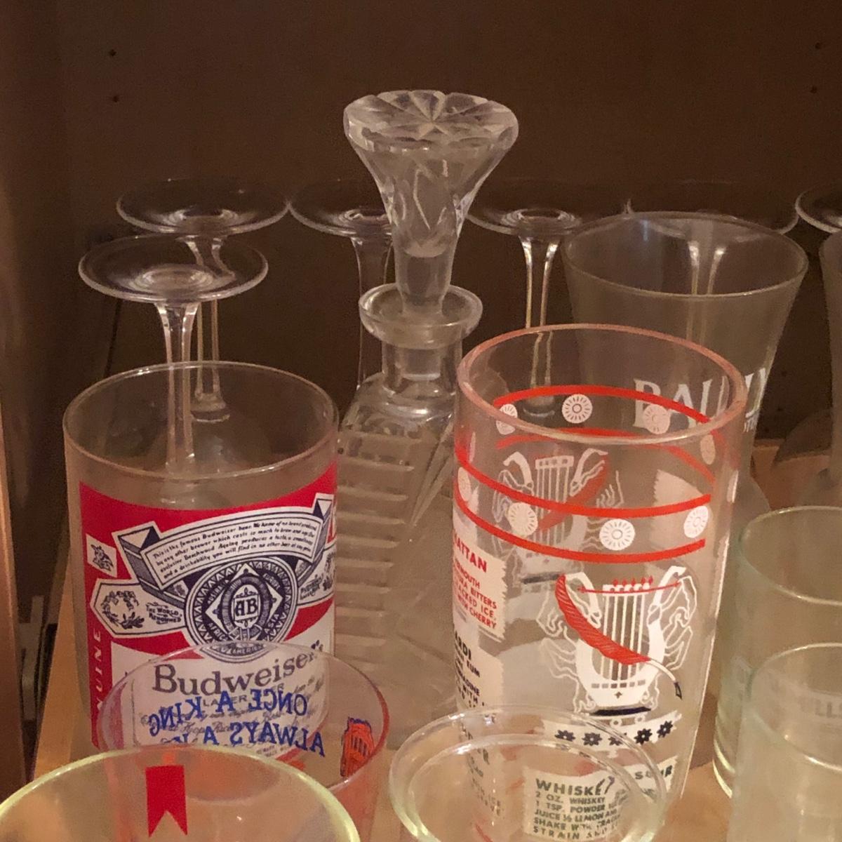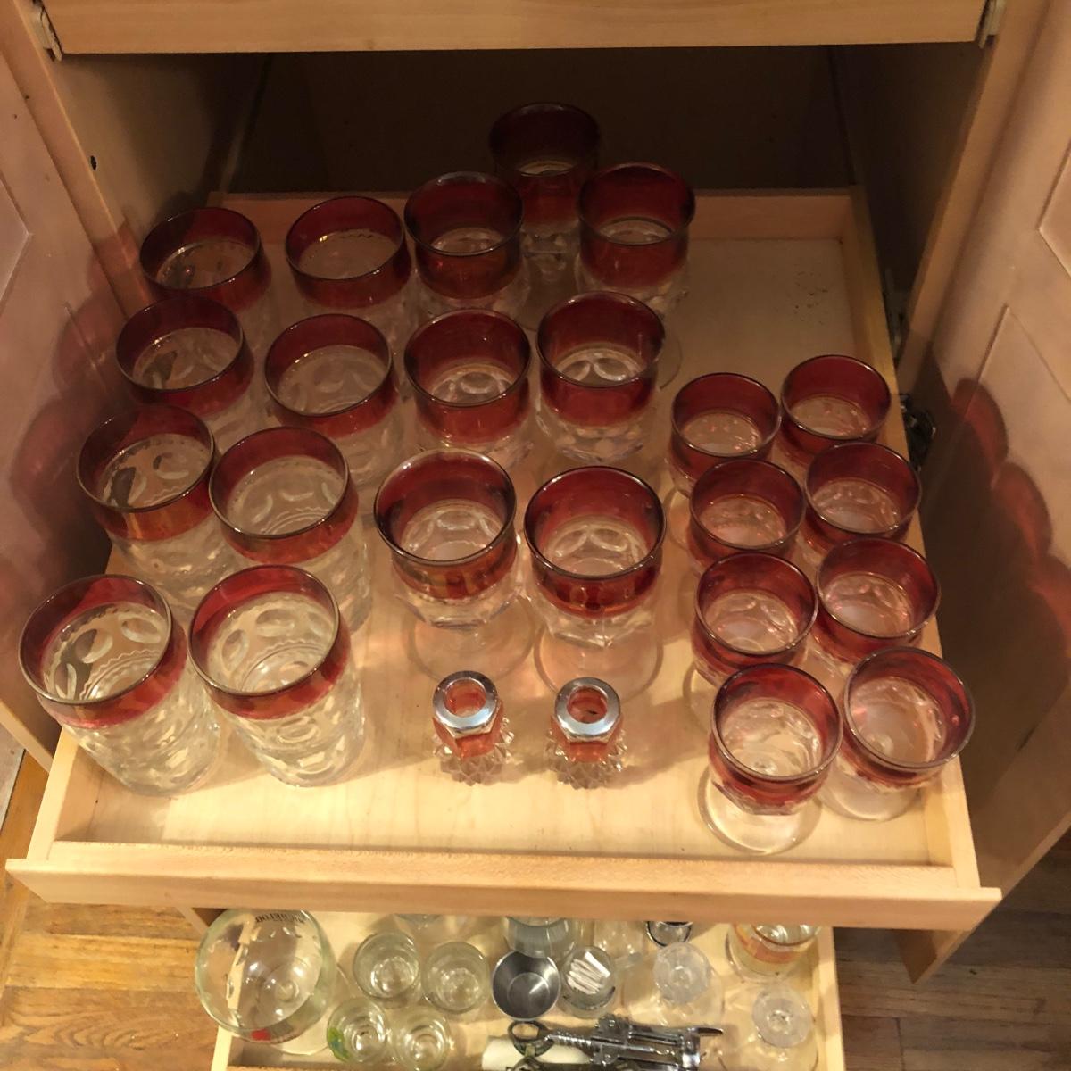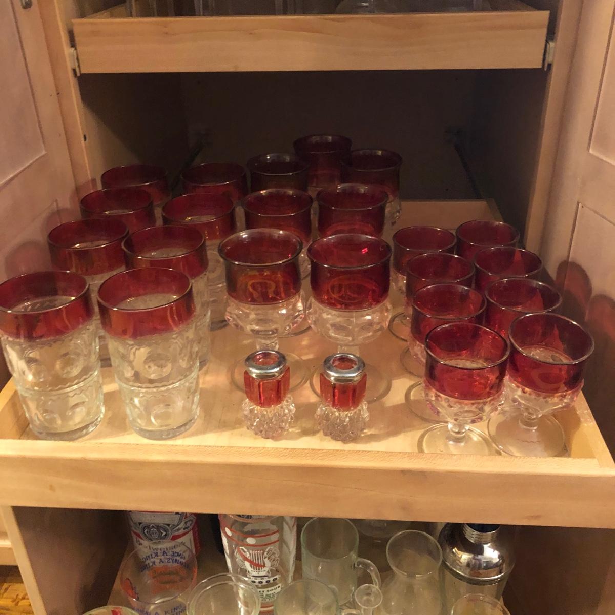 LOT 19M: Ruby Rimmed Glassware, Etched Stemware, Bar Glasses & More