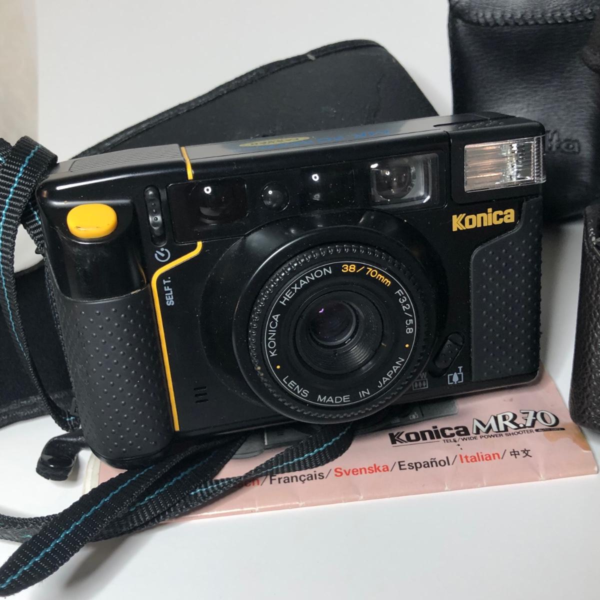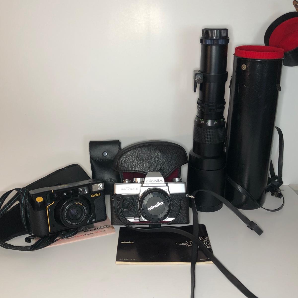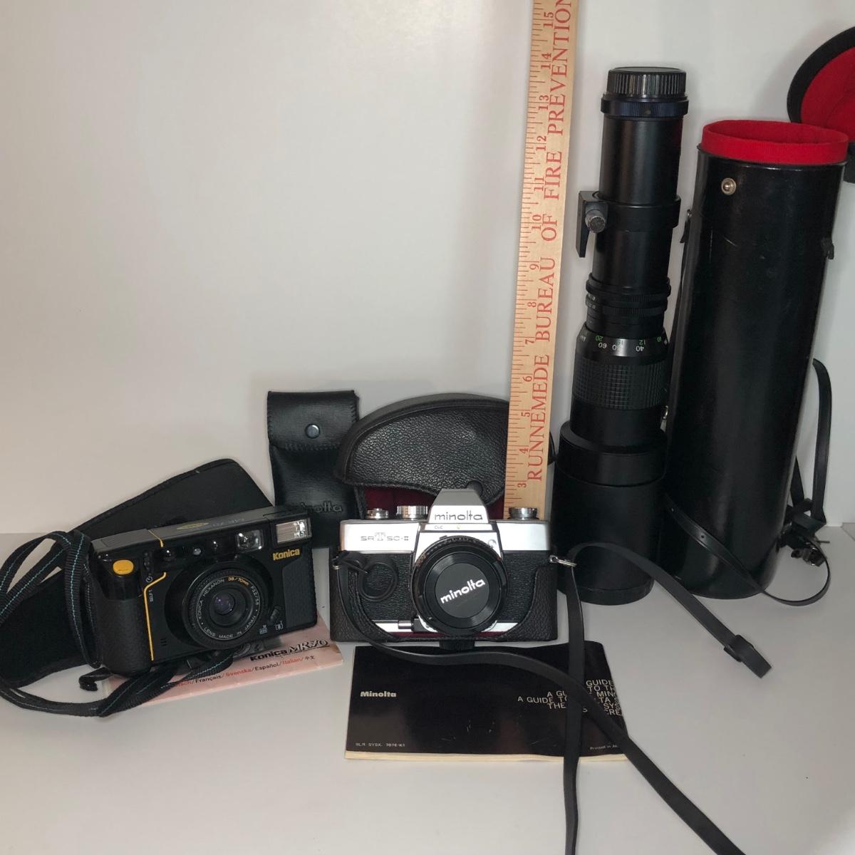 Minolta includes travel case and instruction manual, flash includes case, telephoto lens includes large case however one of the straps is broken. Konica also includes case and manual.