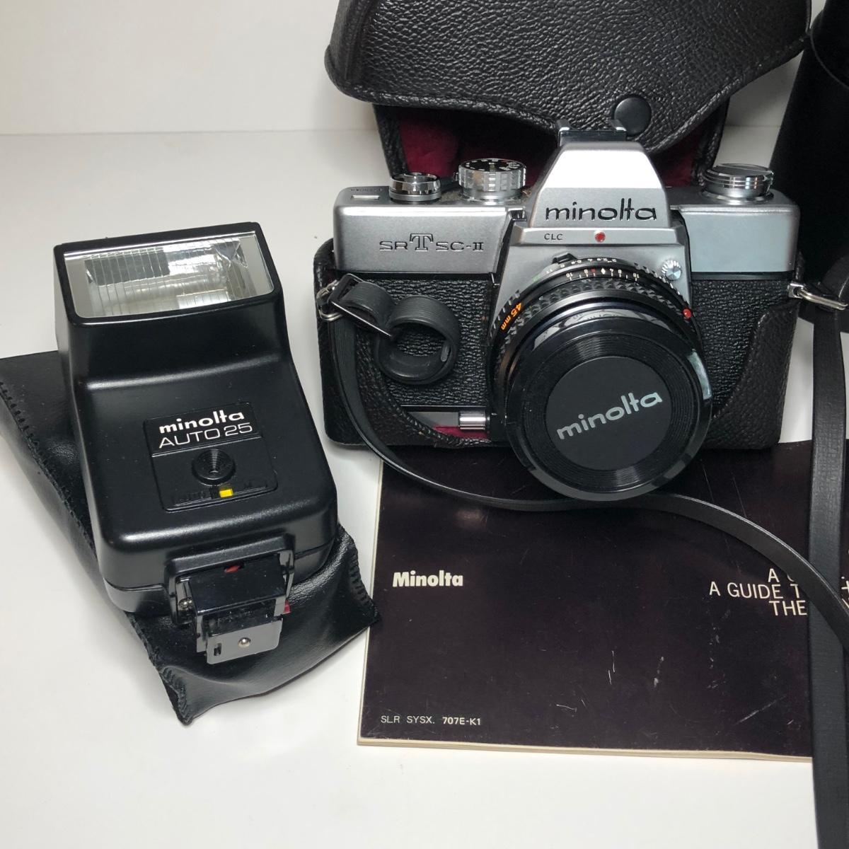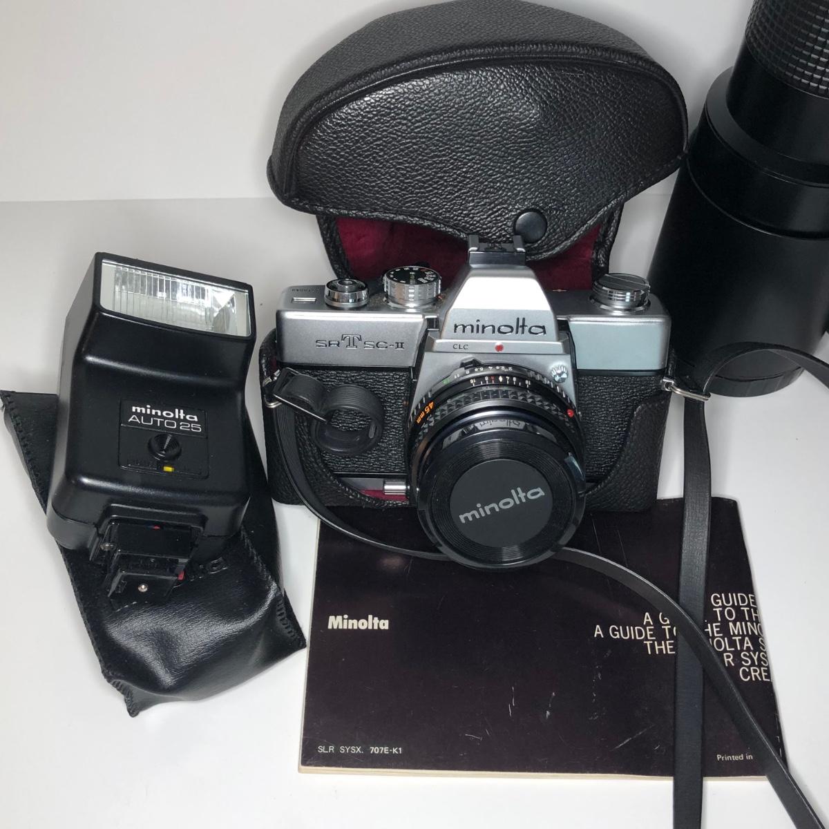 LOT 22M: Minolta SRTSC-II 35mm Manual Film Camera w/ External Flash, Spiratone Telephoto Lens & Konica MR. 70 35mm Camera