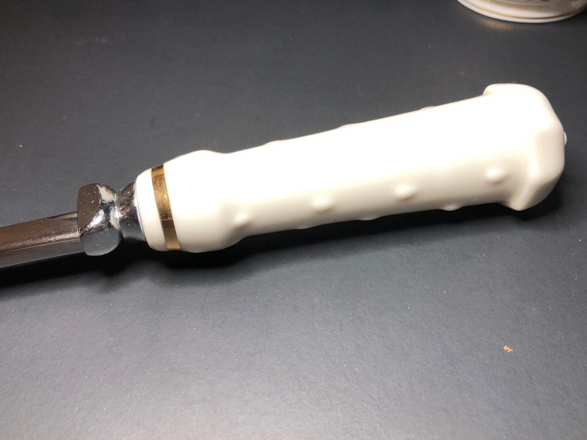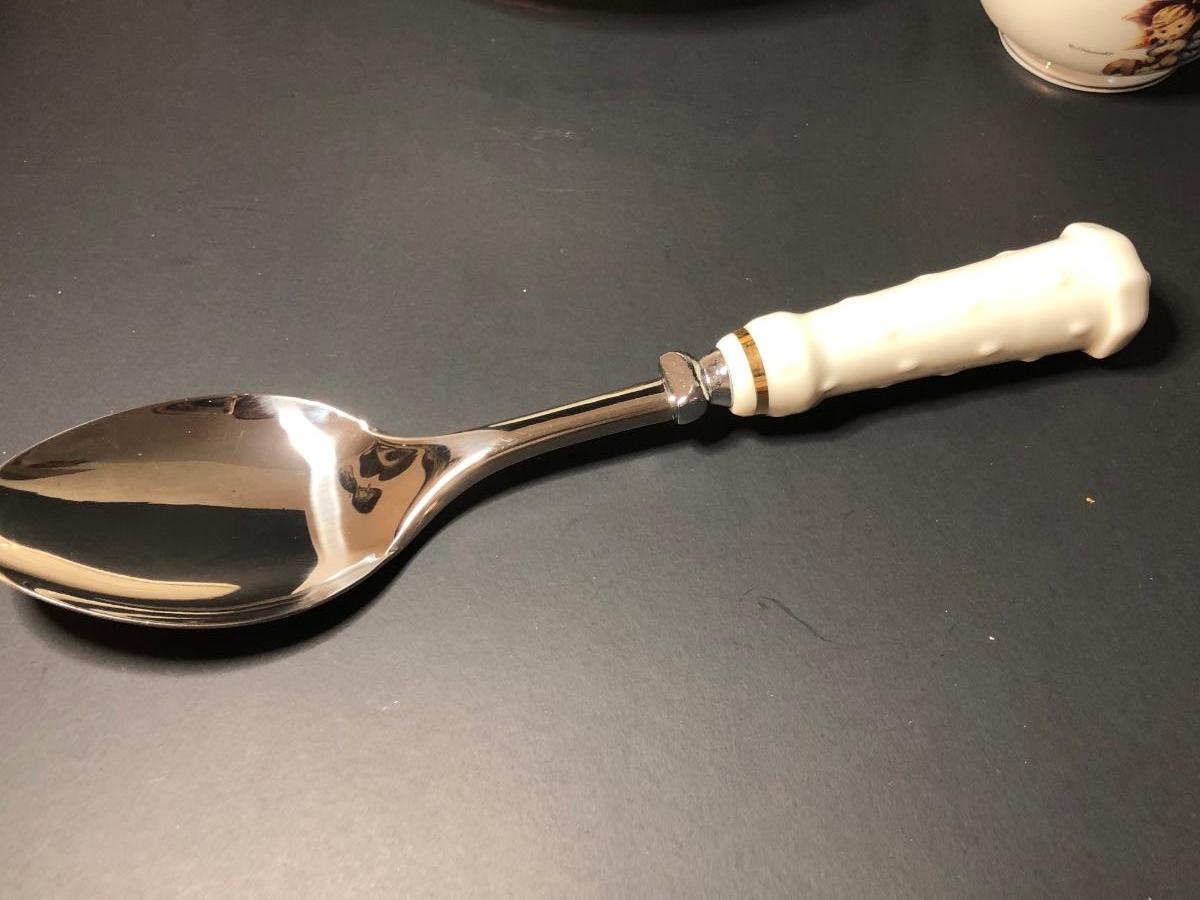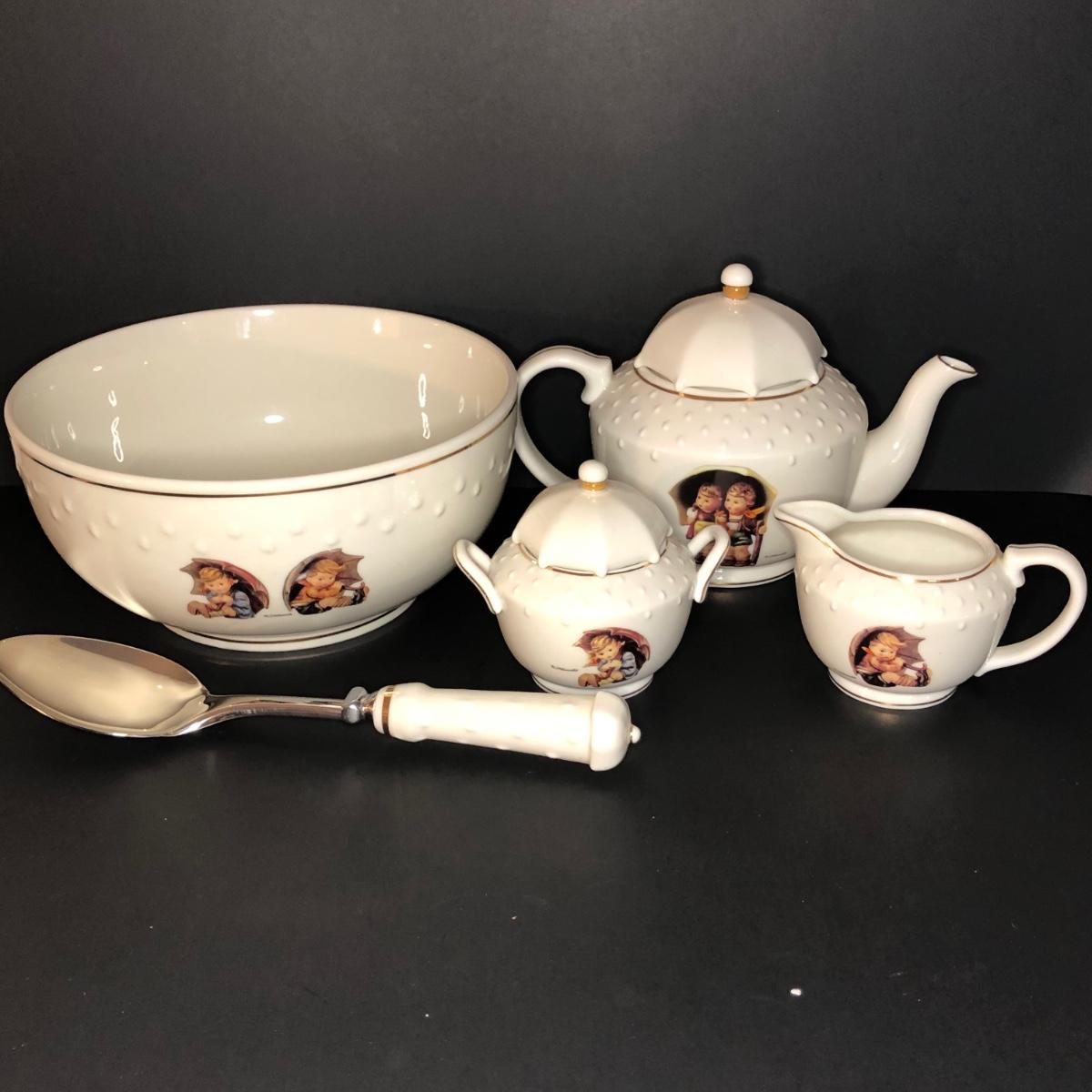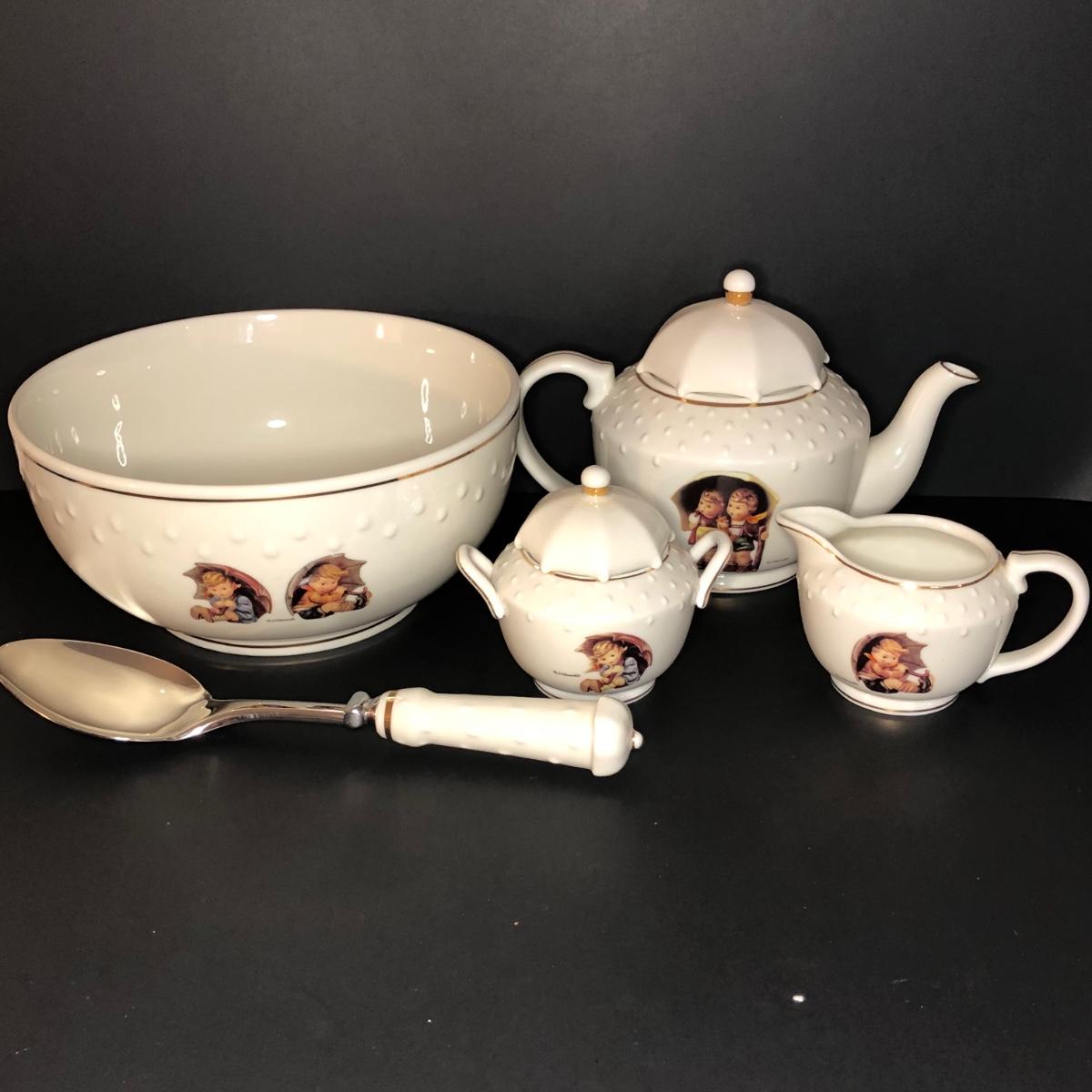 Includes a bowl, serving spoon, tea pot, sugar bowl and creamer.