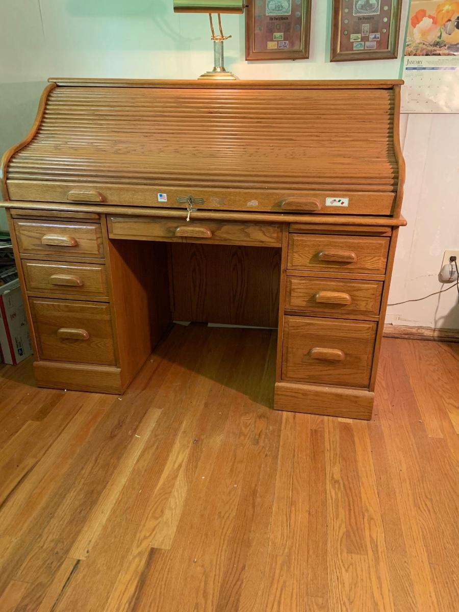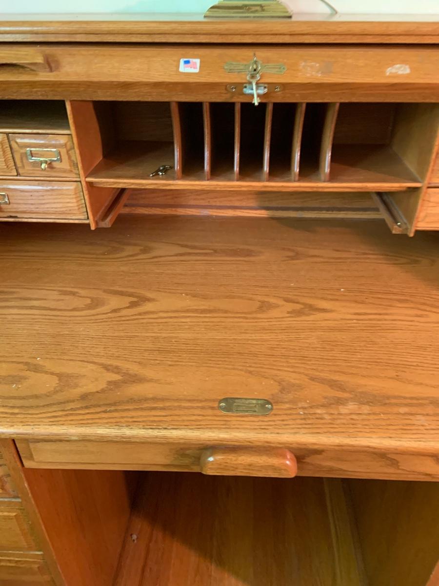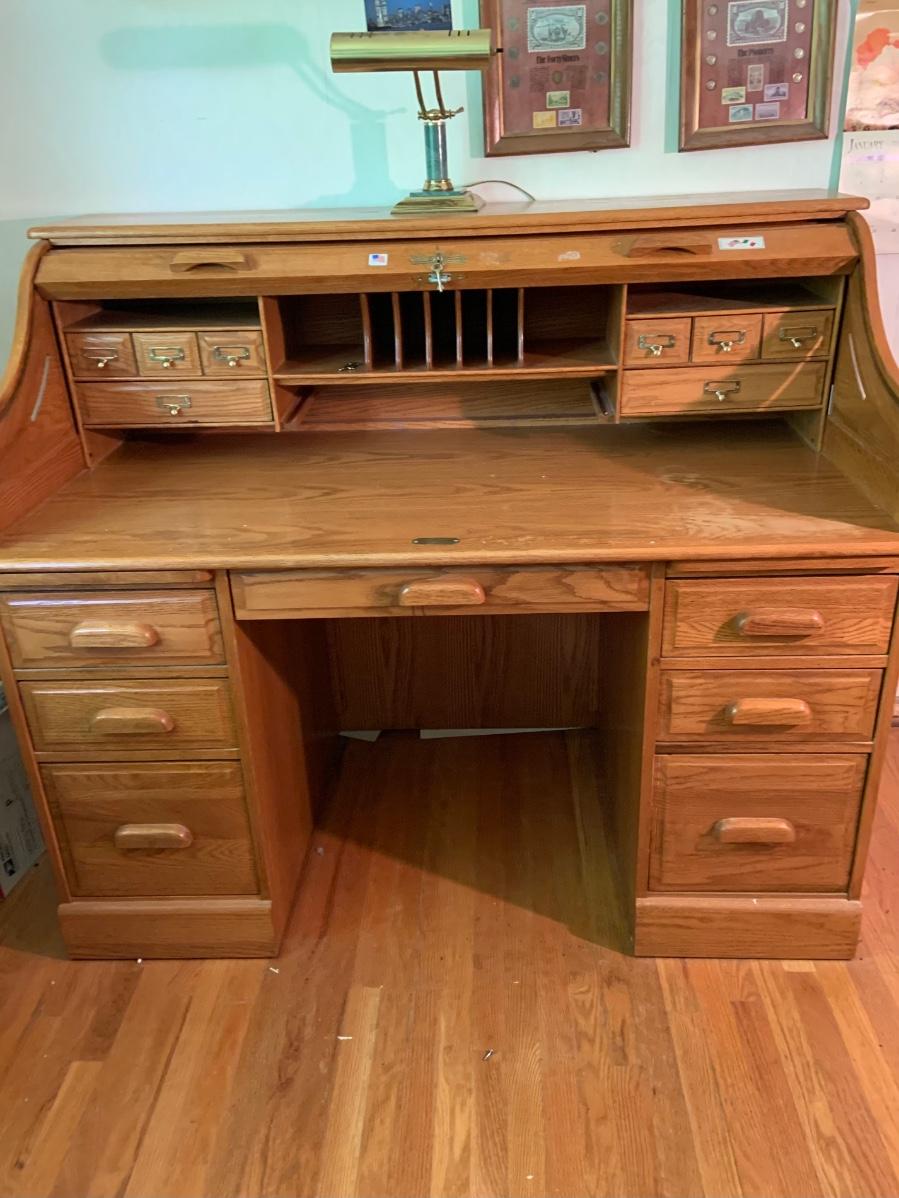 LOT:30G: Beautiful Oak Roll-top Office Desk with Desk Lamp