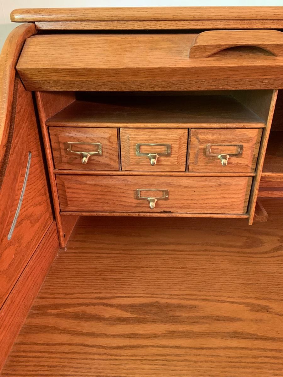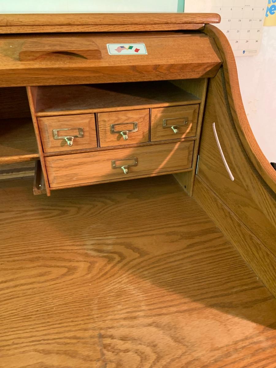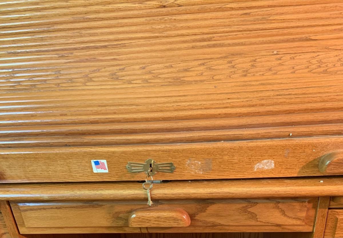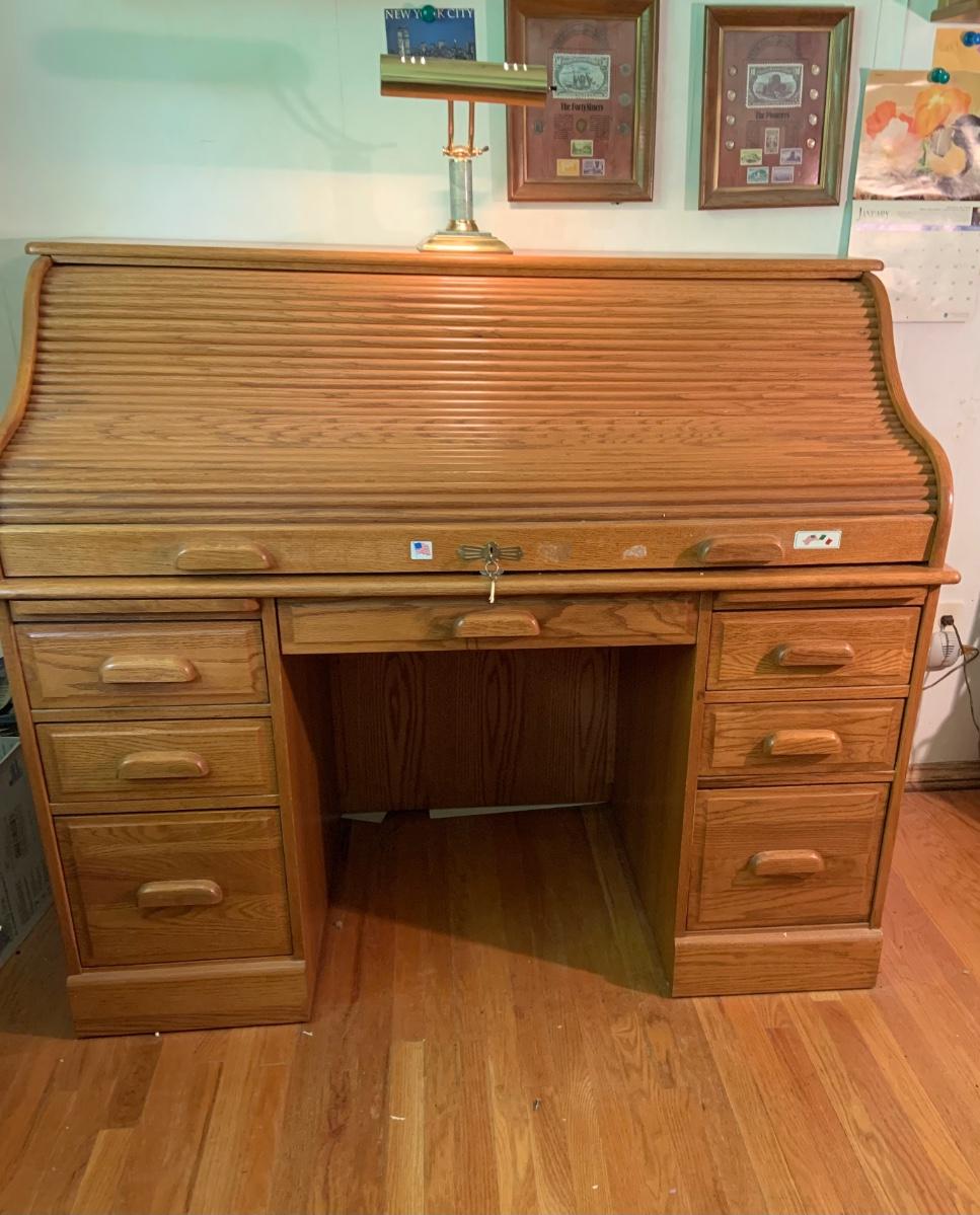 LOT:30G: Beautiful Oak Roll-top Office Desk with Desk Lamp