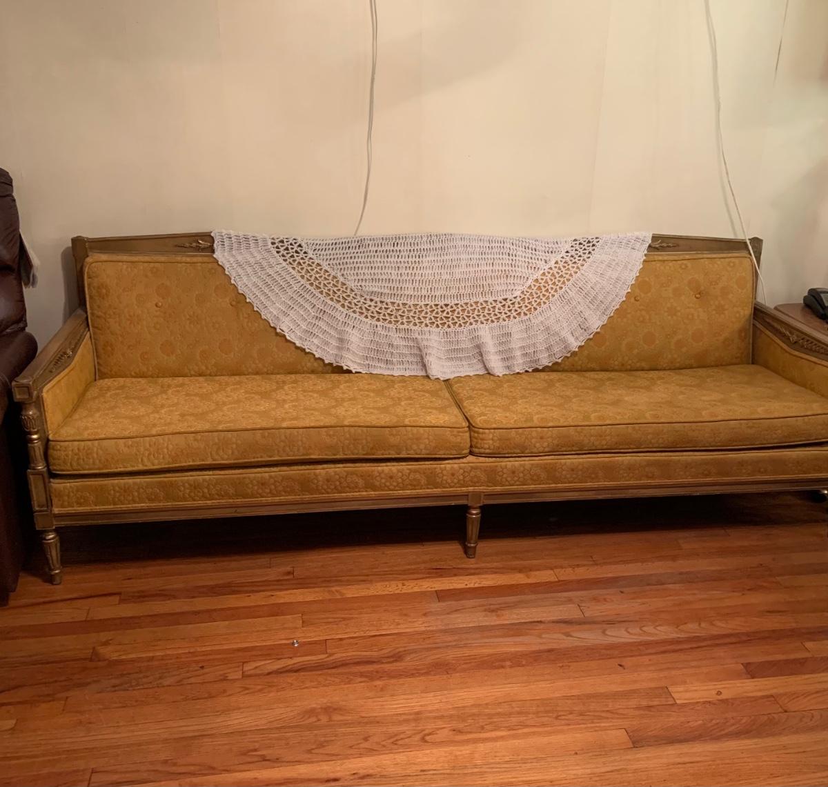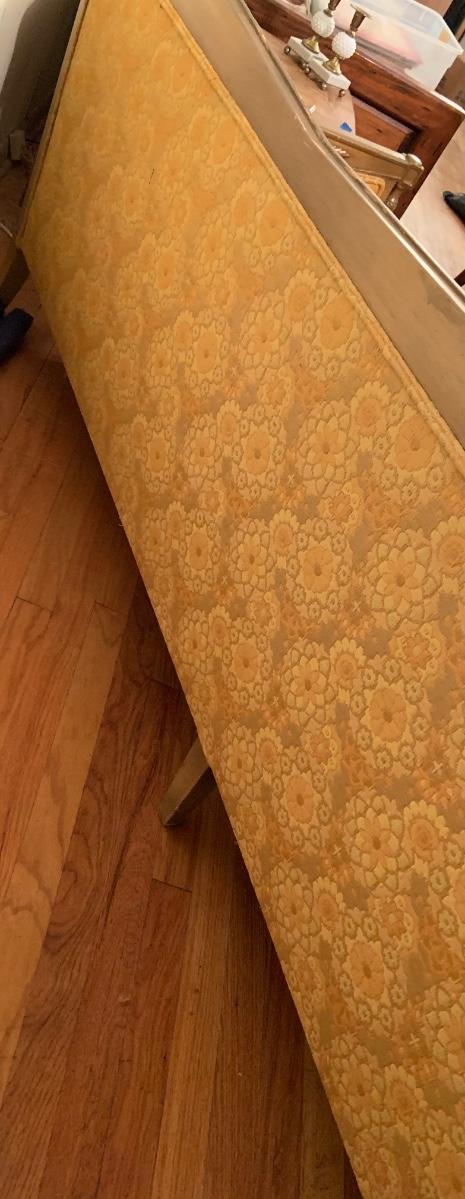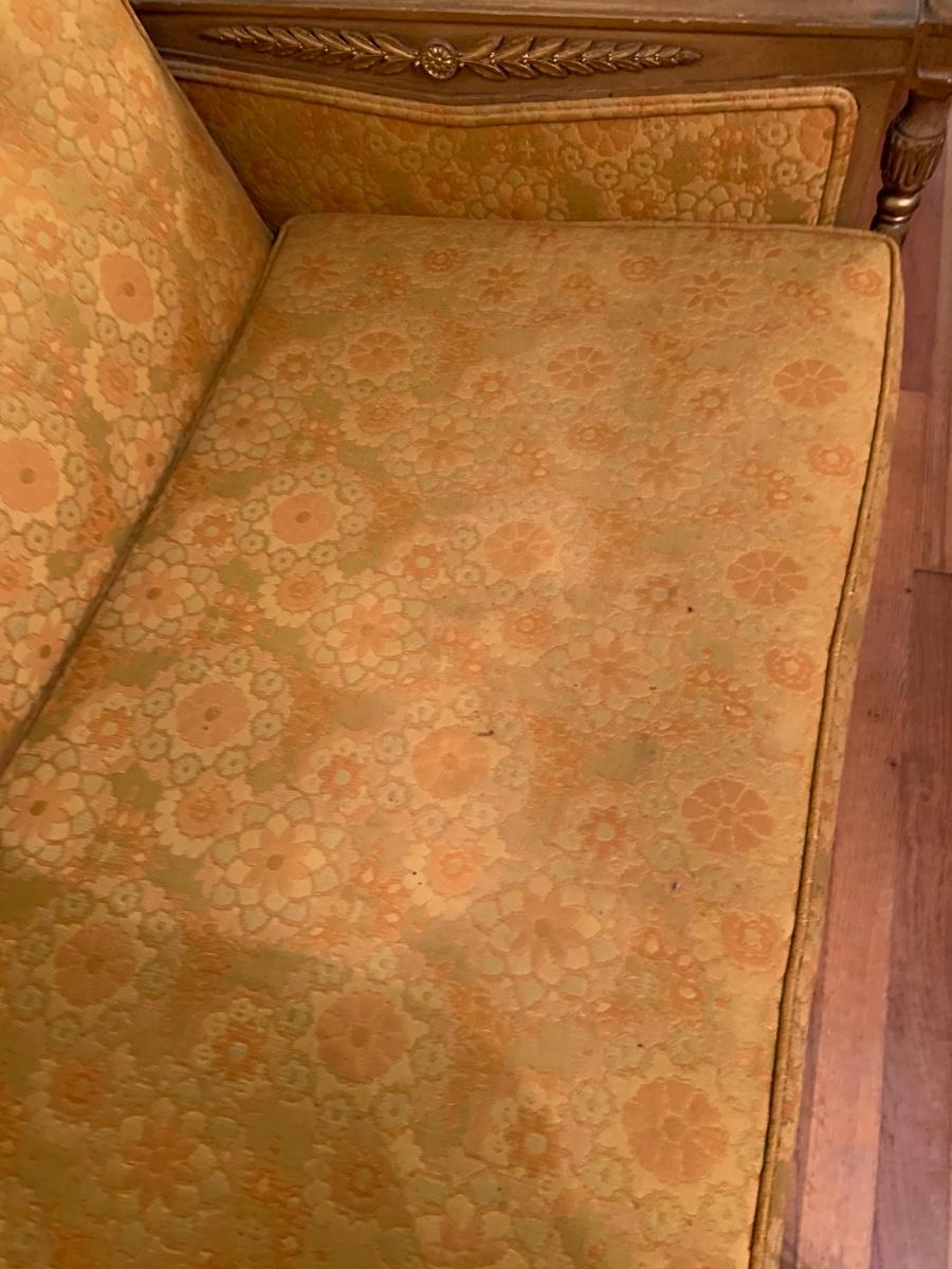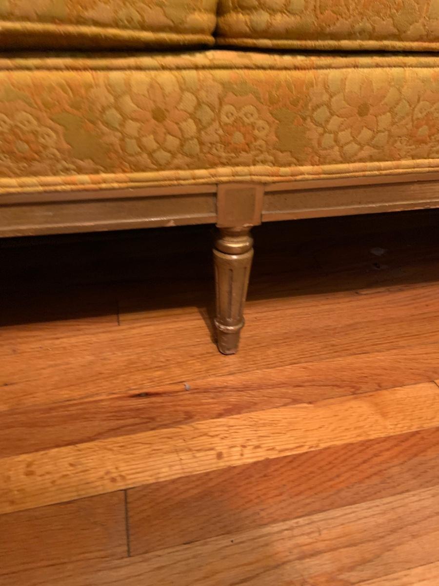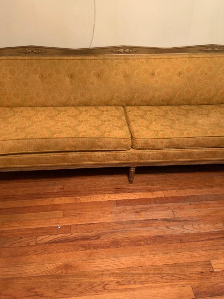 LOT:33G; Vintage Extra Long Gold Colored Sofa with Wood Legs and Trim.
