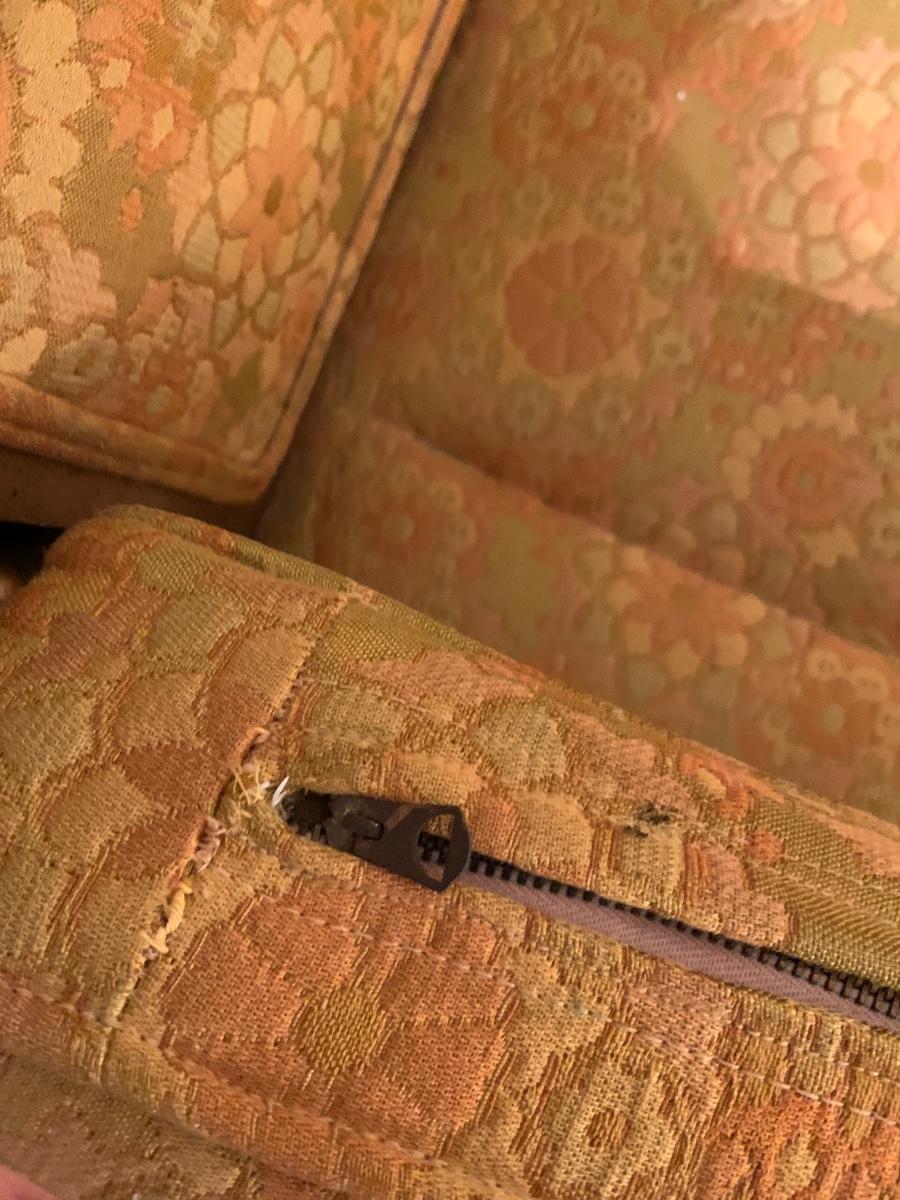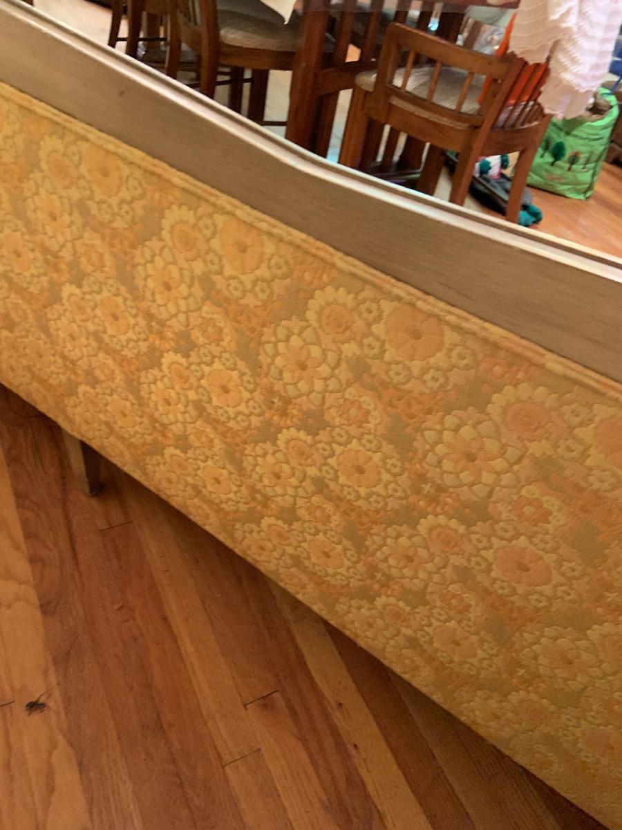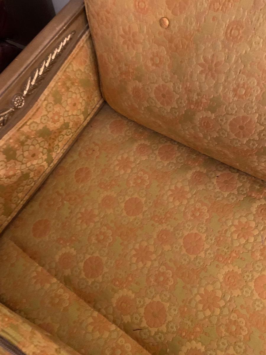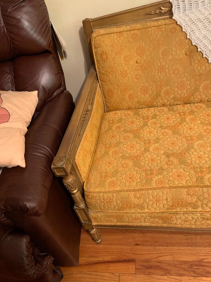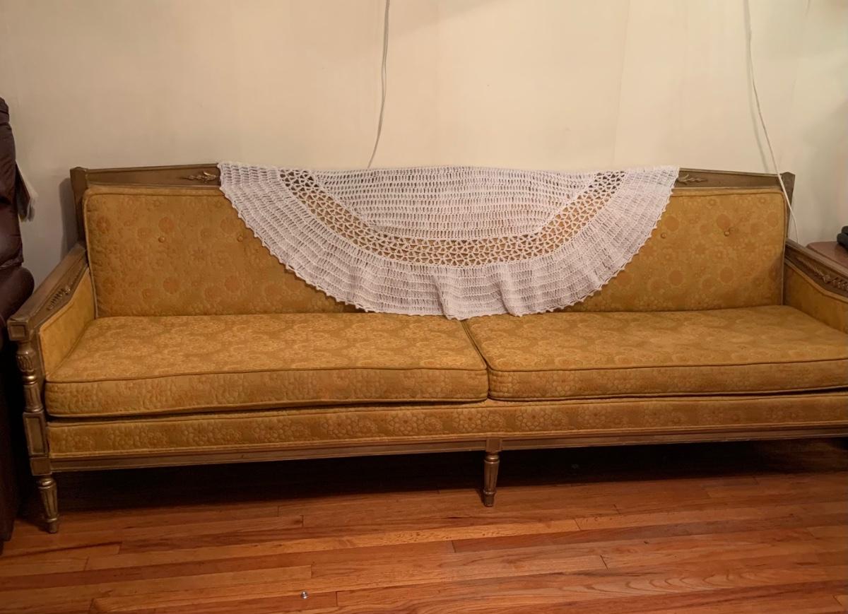 LOT:33G; Vintage Extra Long Gold Colored Sofa with Wood Legs and Trim.