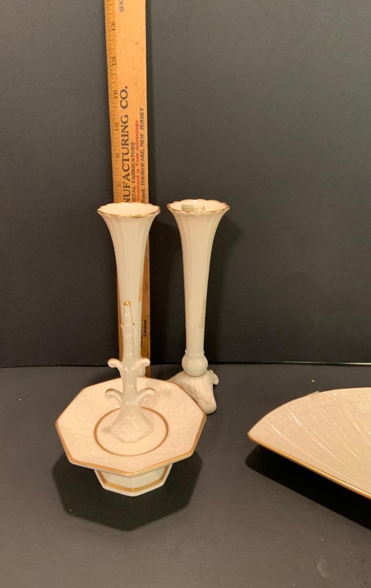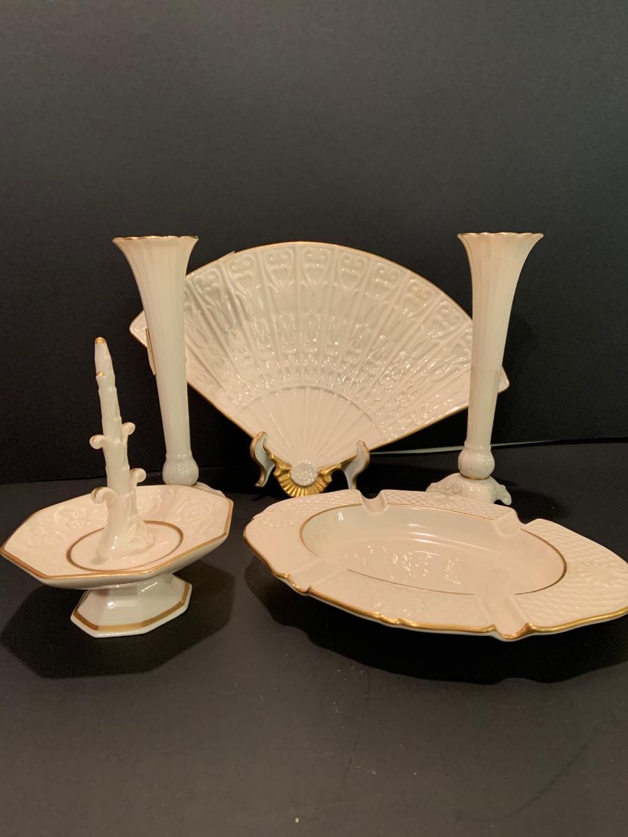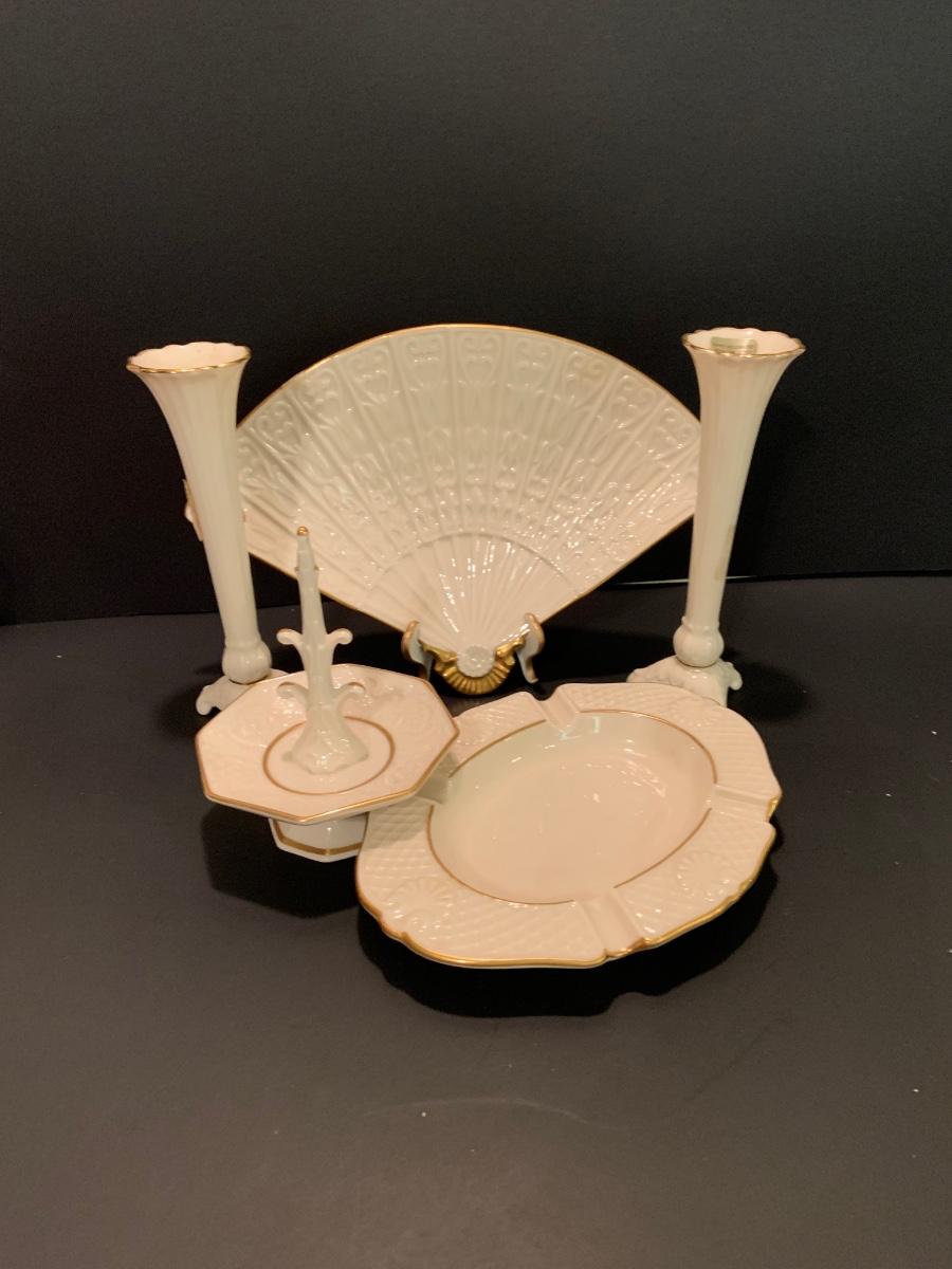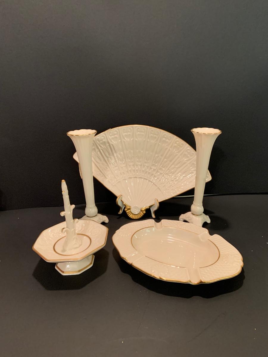 LOT:36G: Lenox China Gold Trimmed Fan Plate, Ashtray, Bud Vases and Ring Holder