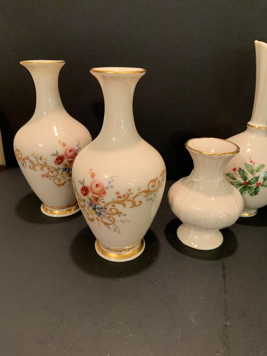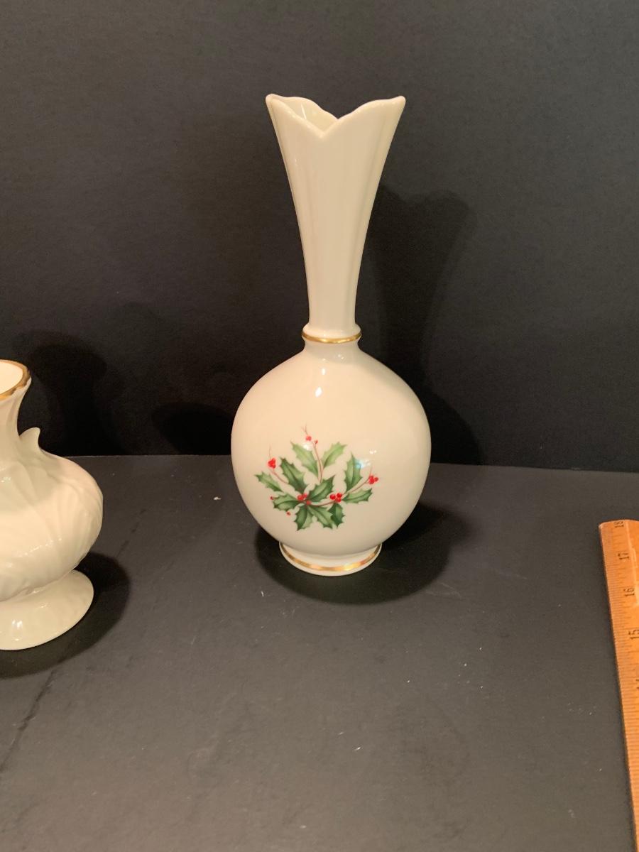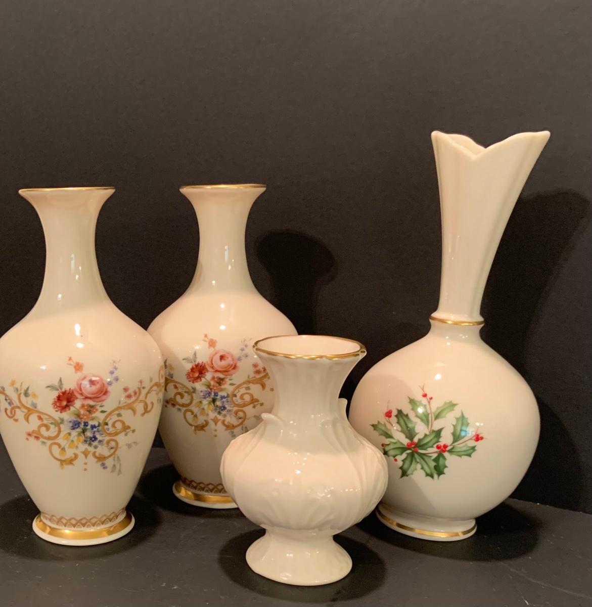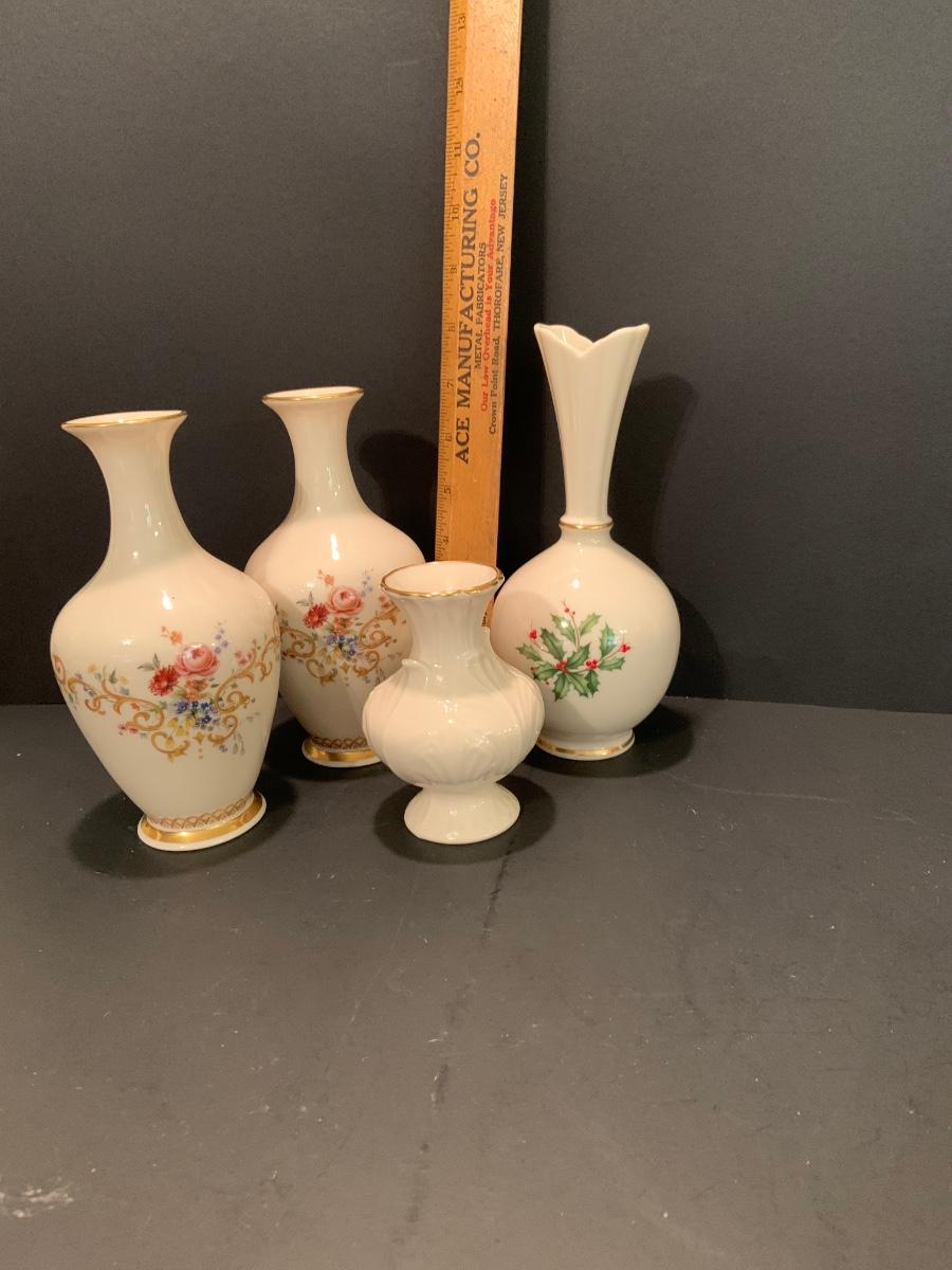 LOT:44G: Four Lenox Bud Vases, 2 Queens Garden, a Holly Berry and Elfin Patterns.