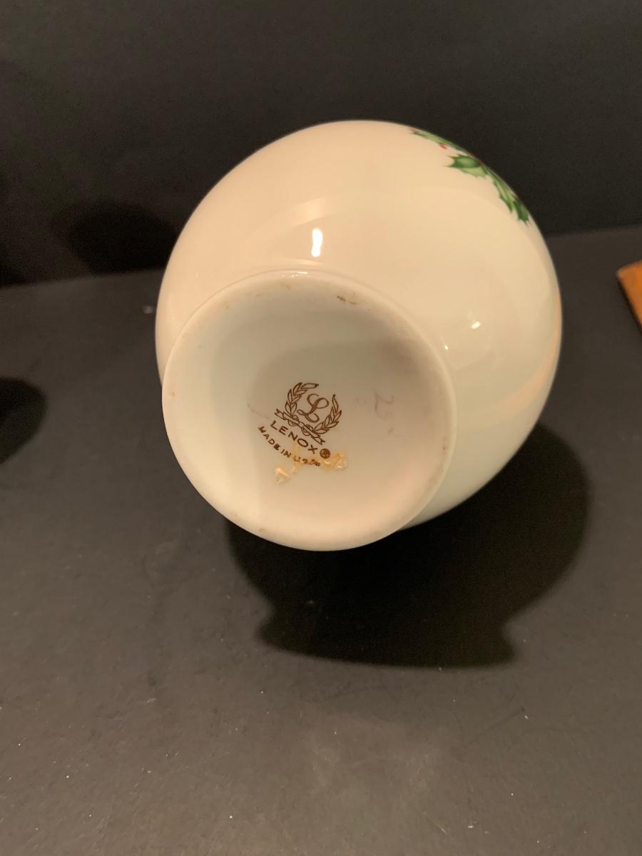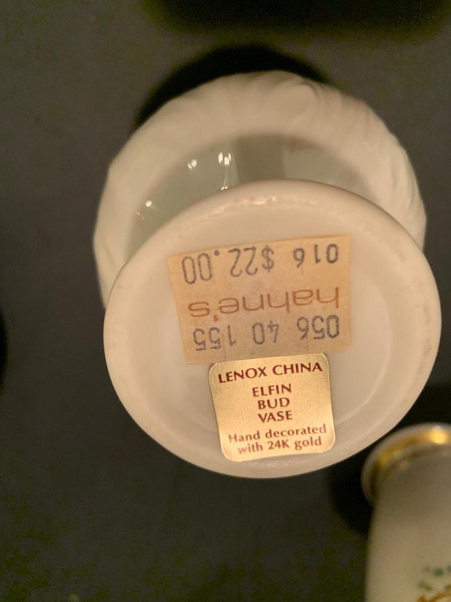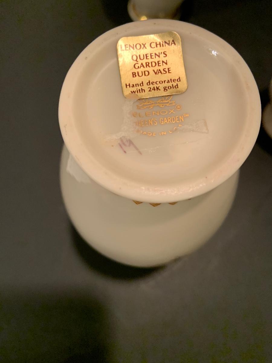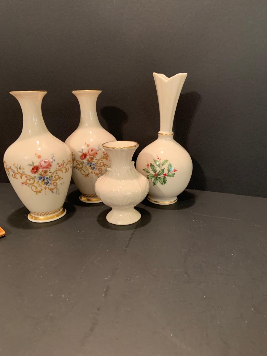 LOT:44G: Four Lenox Bud Vases, 2 Queens Garden, a Holly Berry and Elfin Patterns.