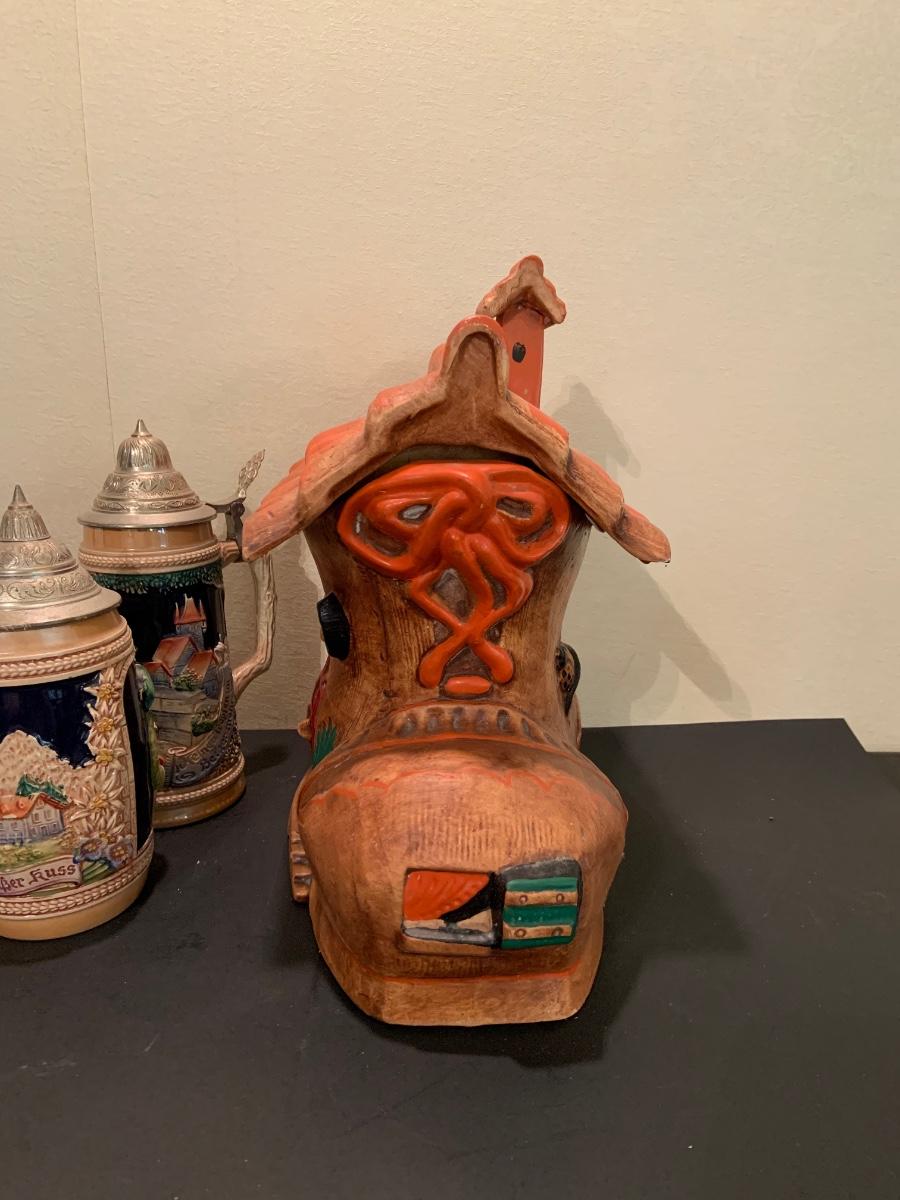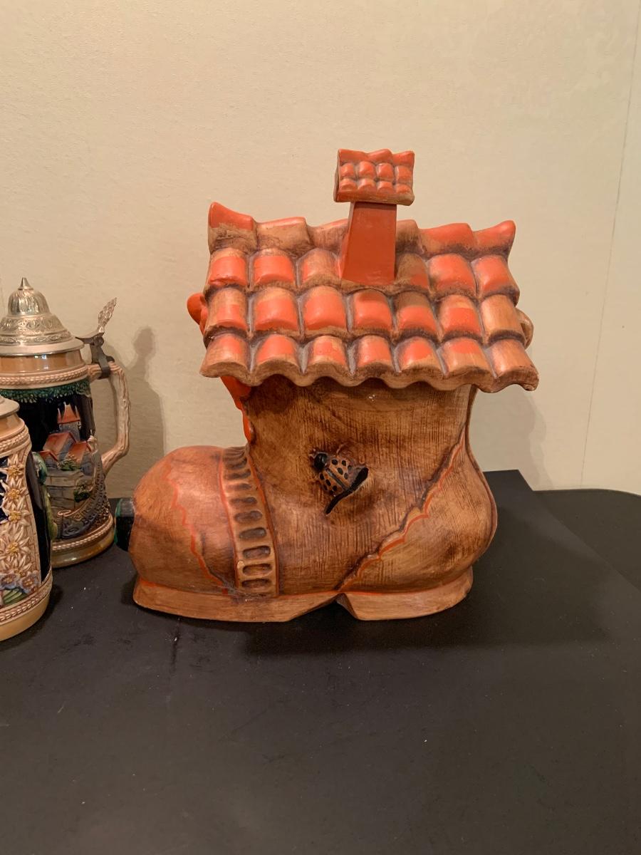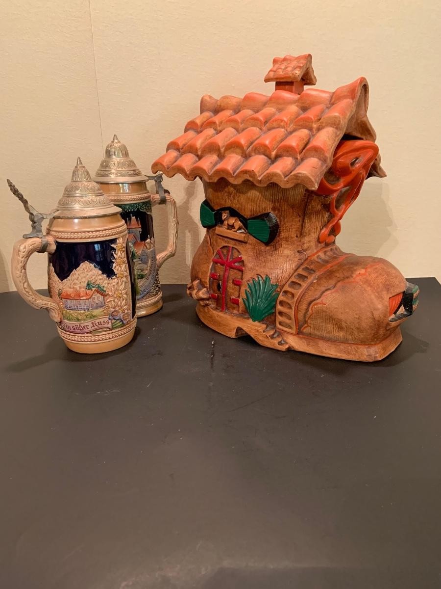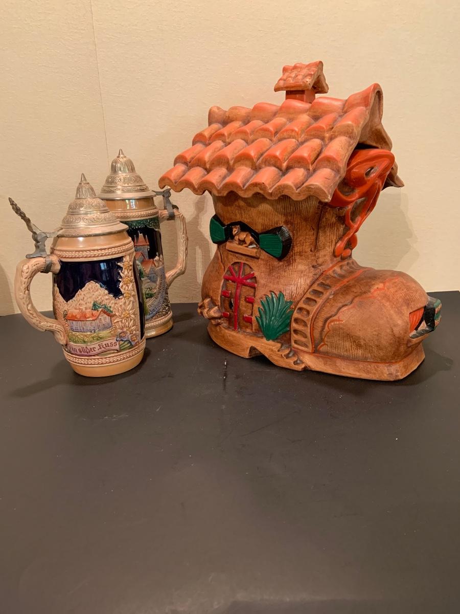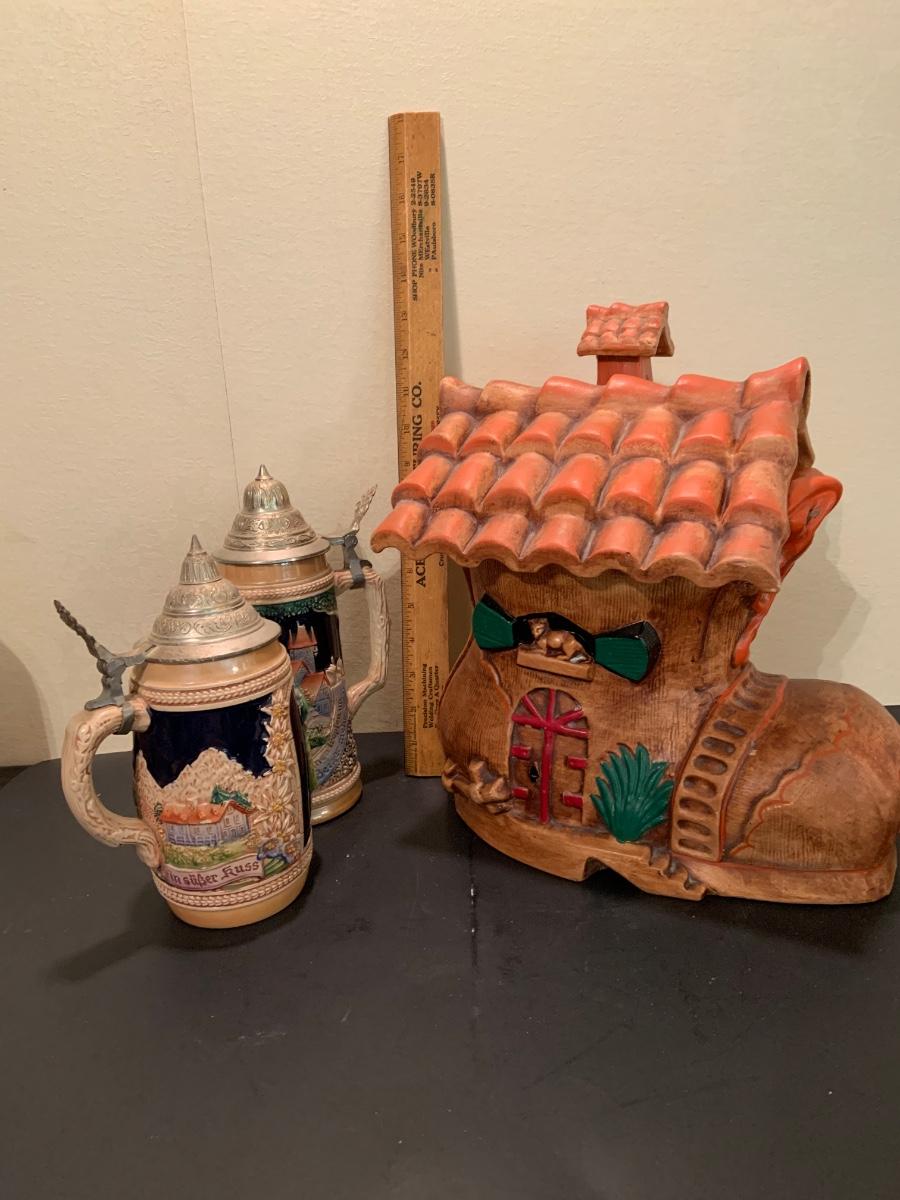 LOT:48G: Vintage Folk Style Old Lady Who Lived in a Shoe Ceramic Cookie Jar and 2 German Beer Steins