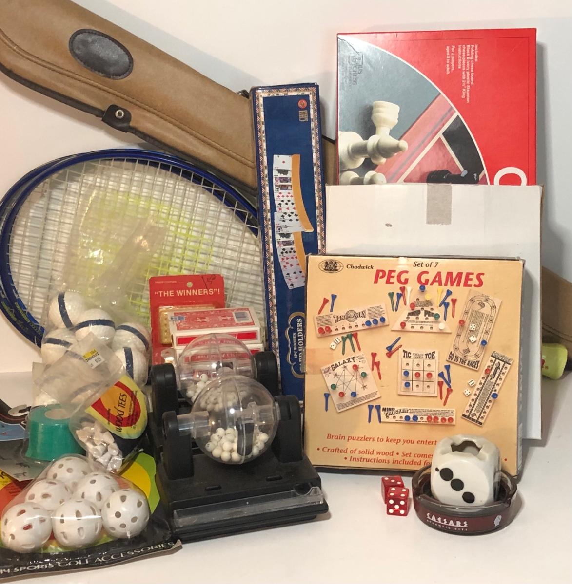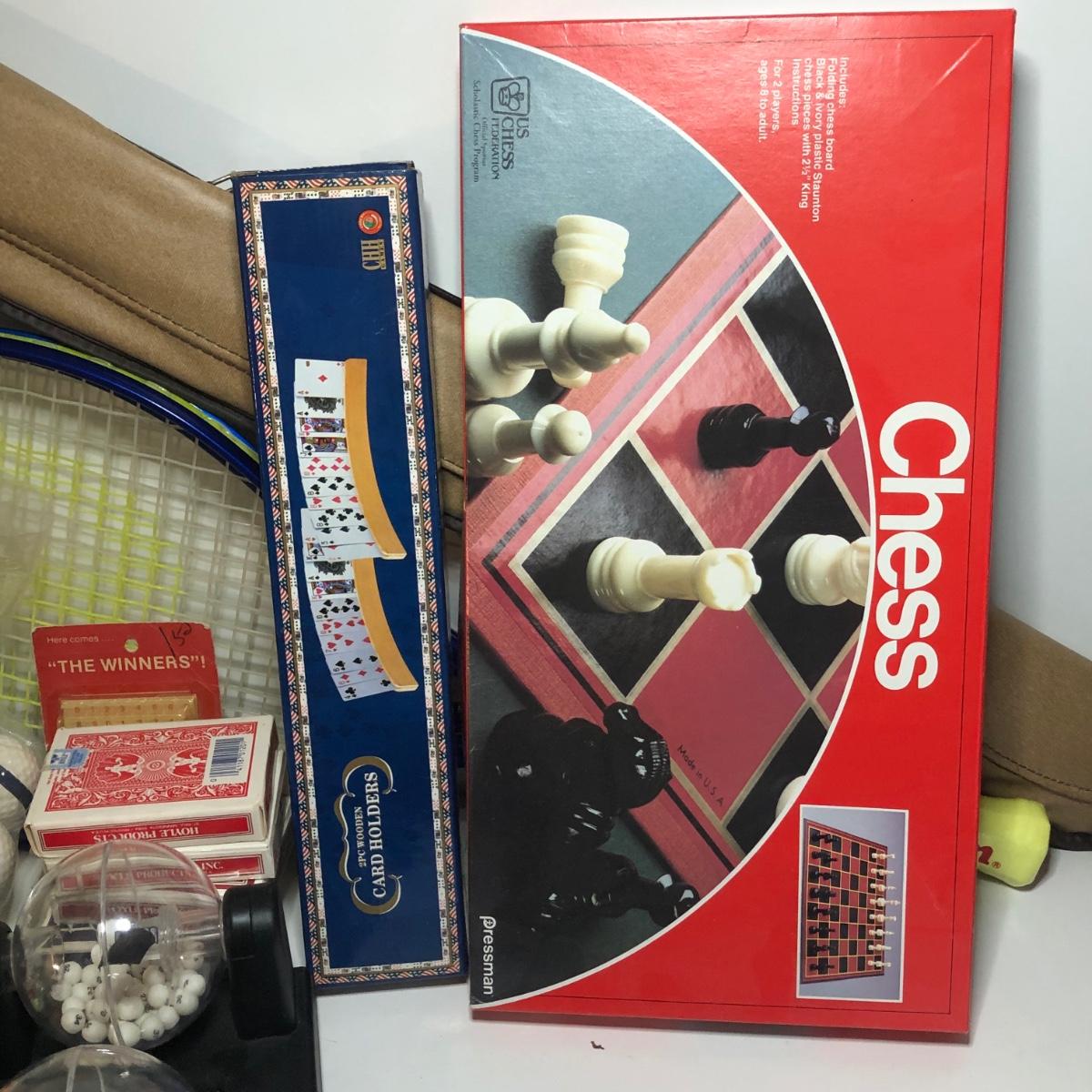 LOT 69M: Sports & Games - Wilson Tennis Rackets, Multiple Chess Sets, Collapsible Pool Cue w/ Case, Cards, & More