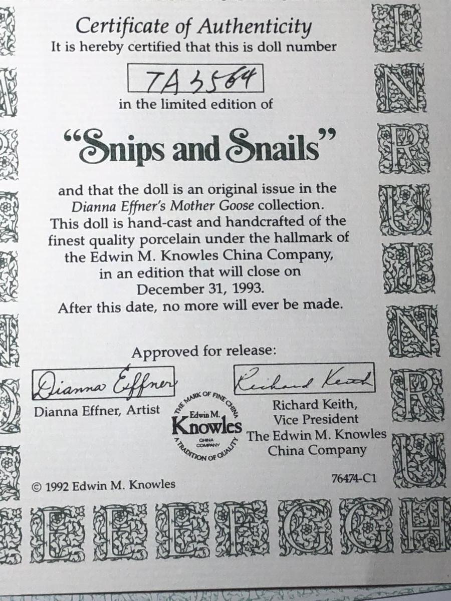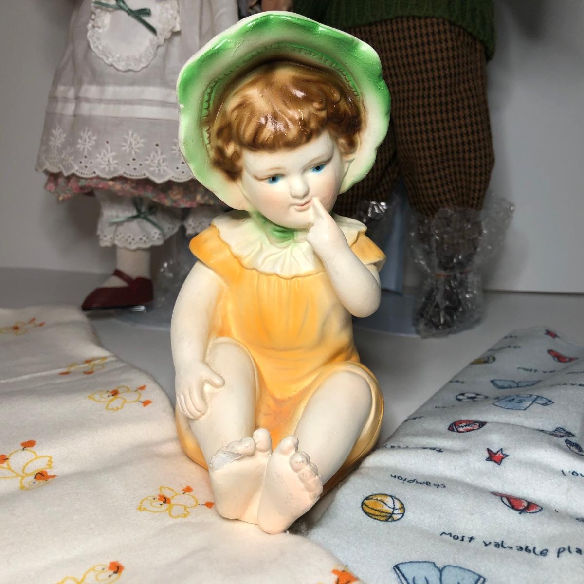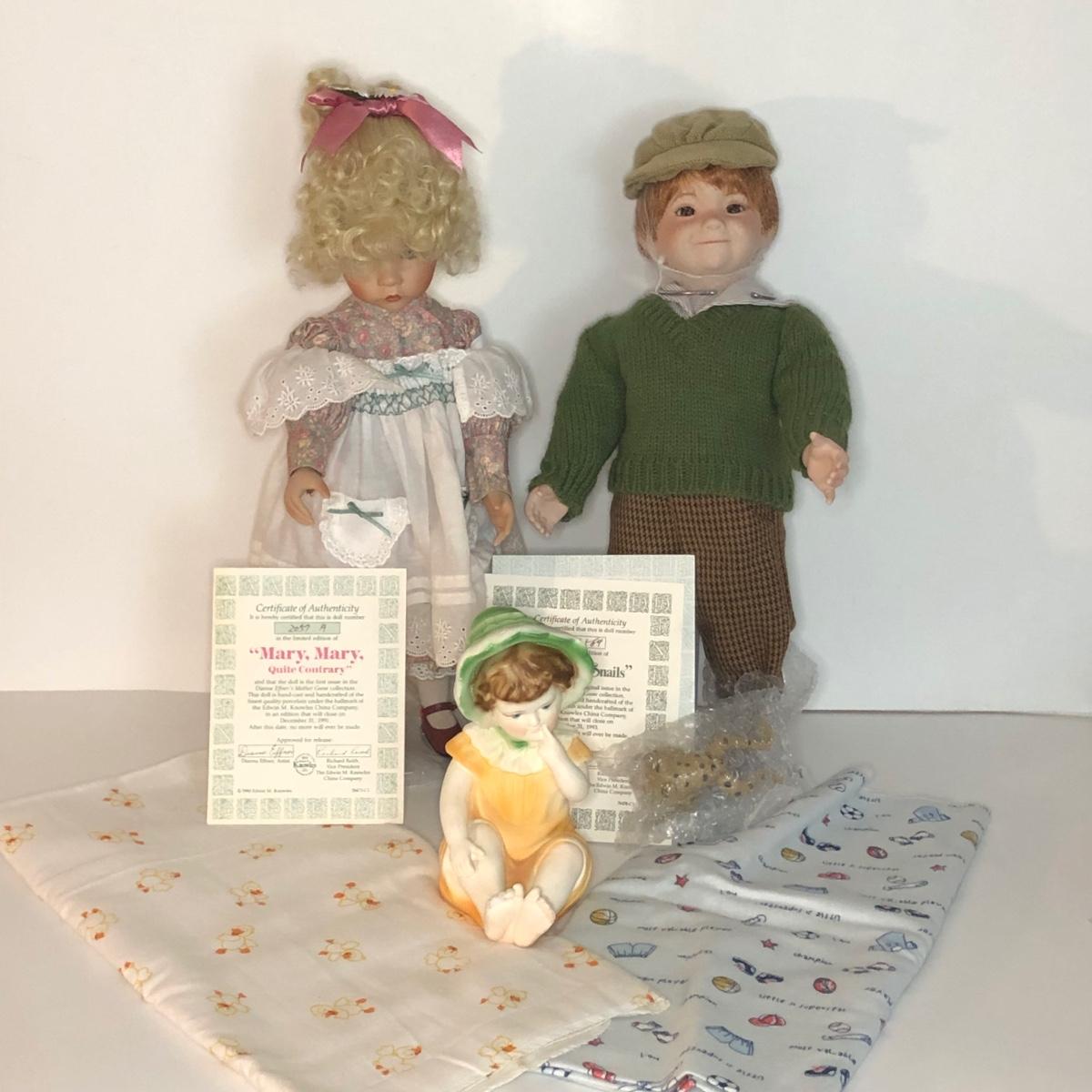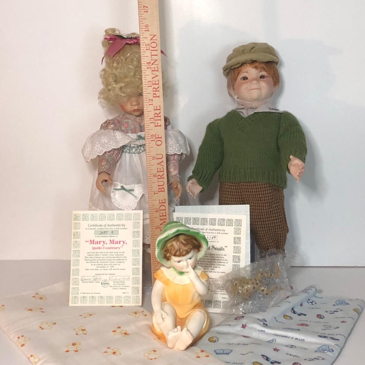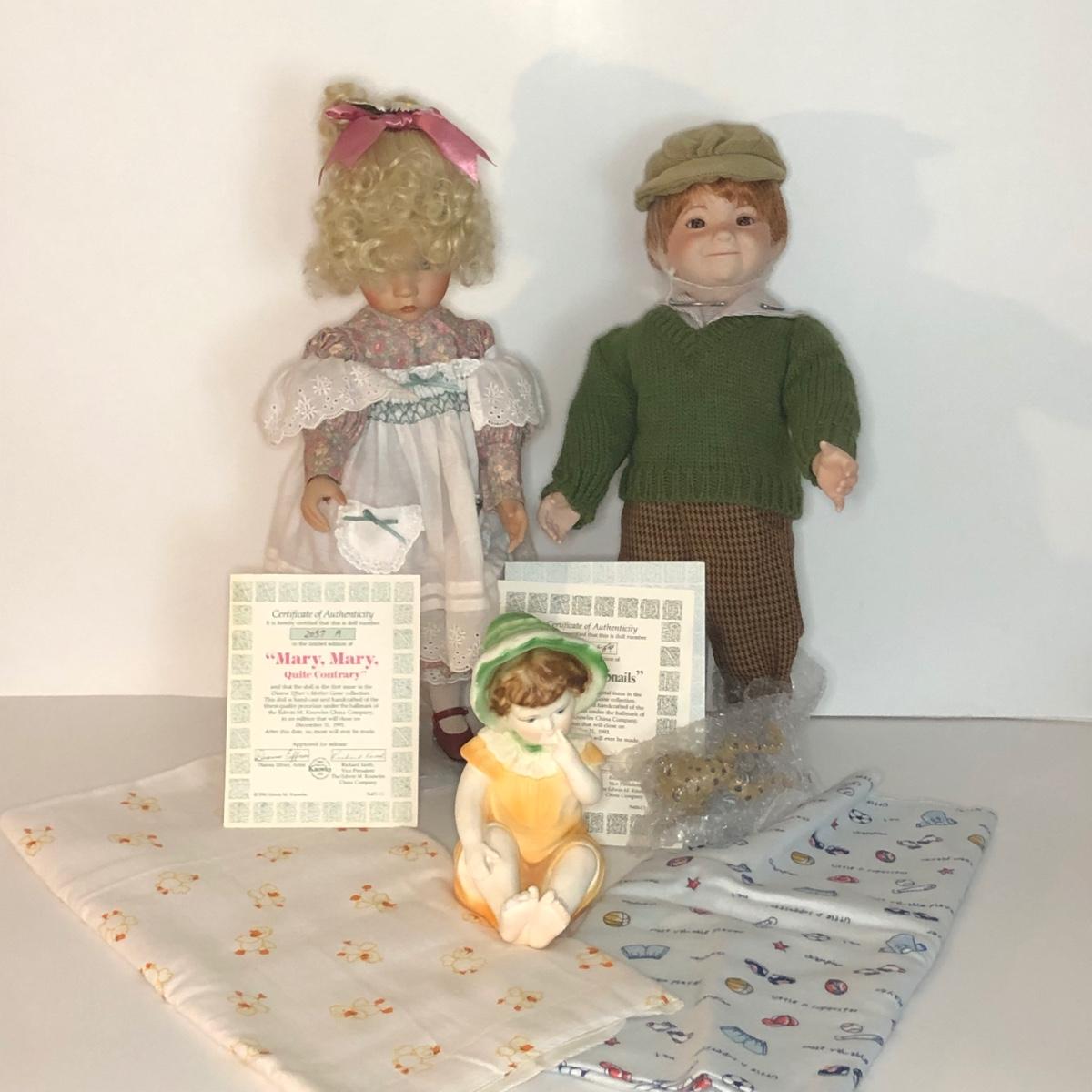 LOT 74M: "Mary, Mary" Porcelain Doll, "Snips & Snails" Porcelain Doll, Girl Figure & Receiving Blankets