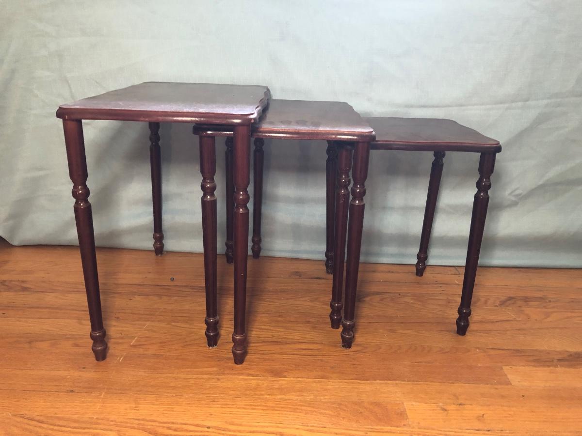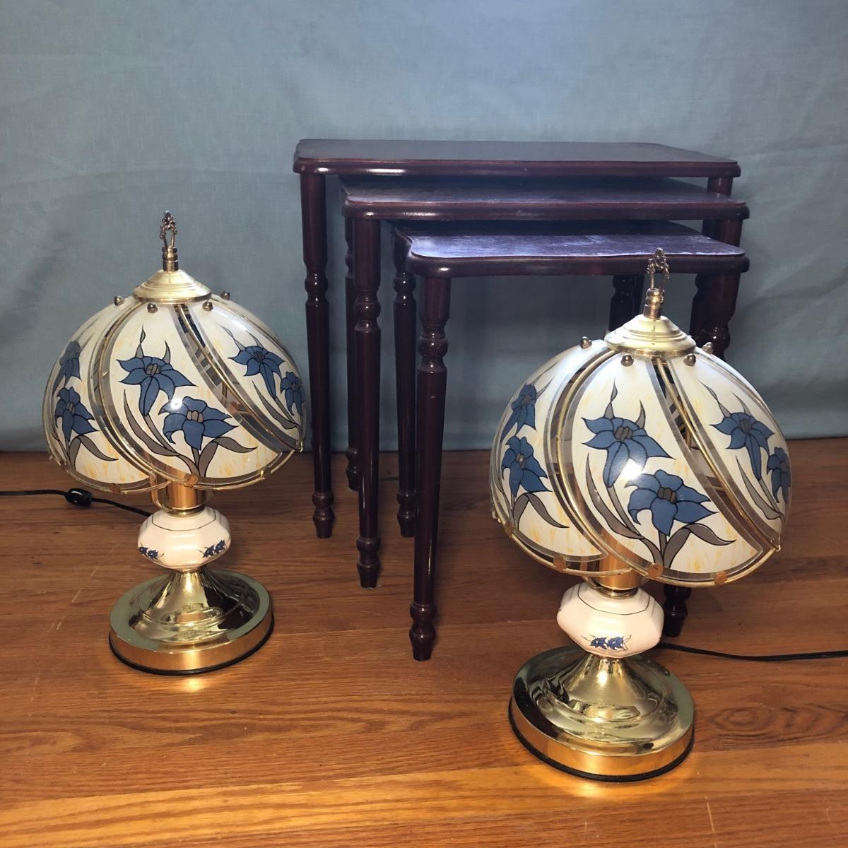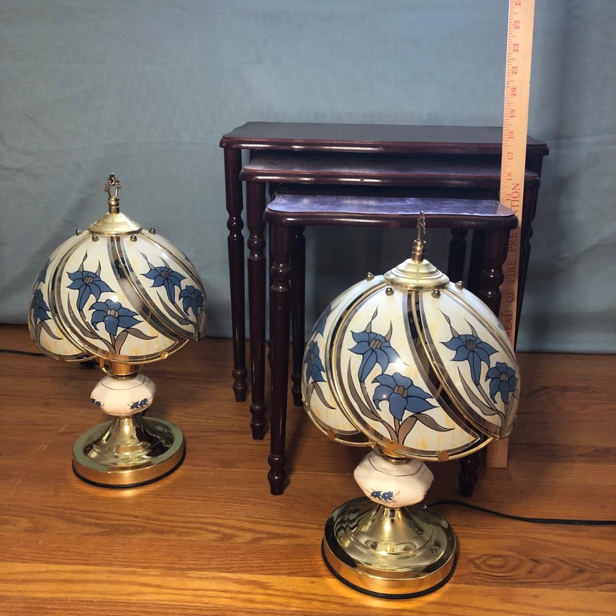 LOT 80M: Nesting Accent Tables & Blue Flower Glass Shade Lamps
