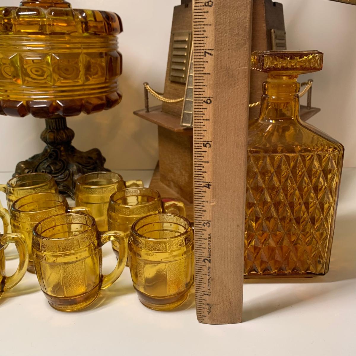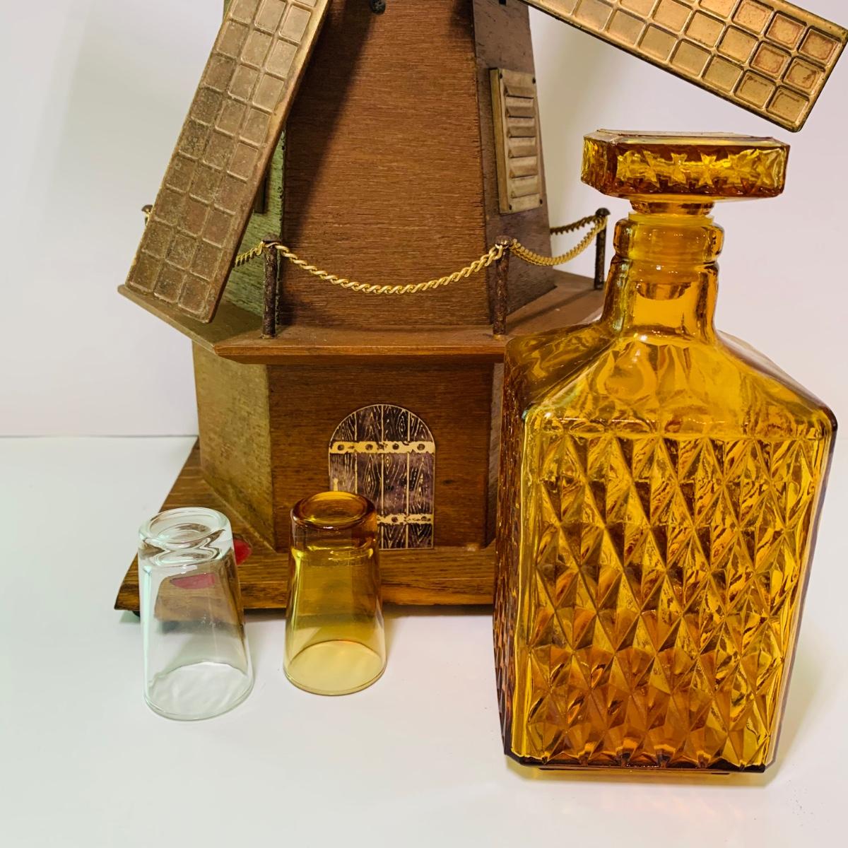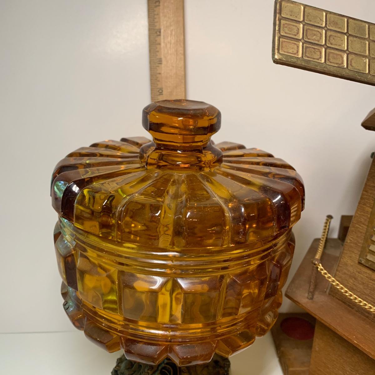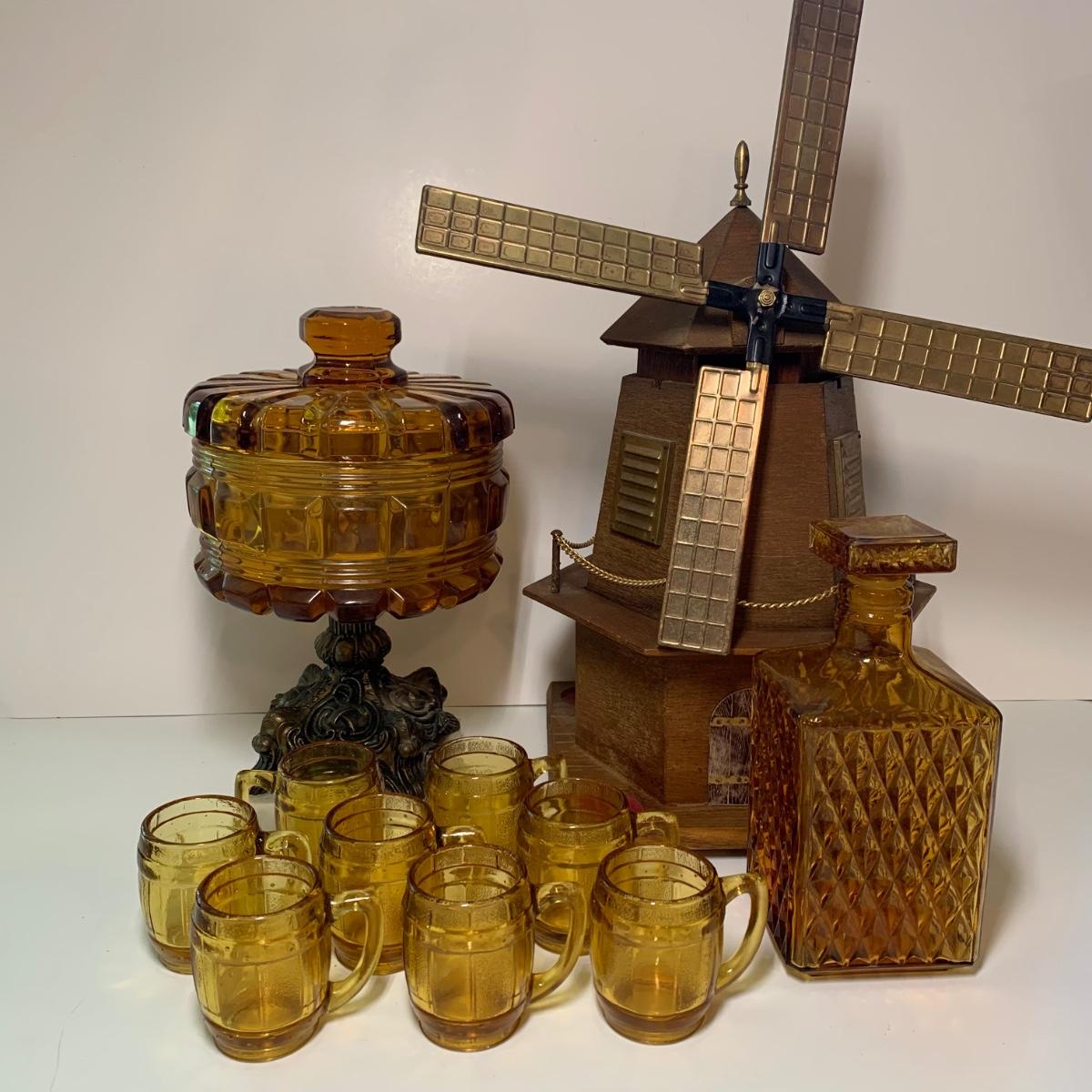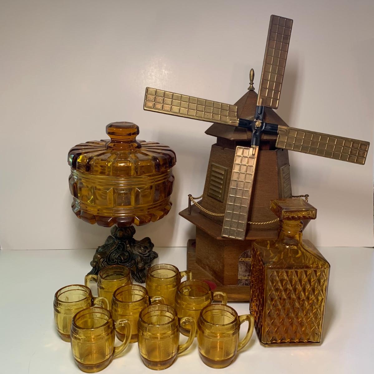 LOT 82: Vintage Windmill Decanter Set with Amber Glass Decanter & a Covered Candy Dish with a Metal & Marble Base and More