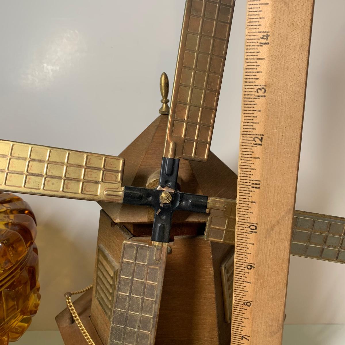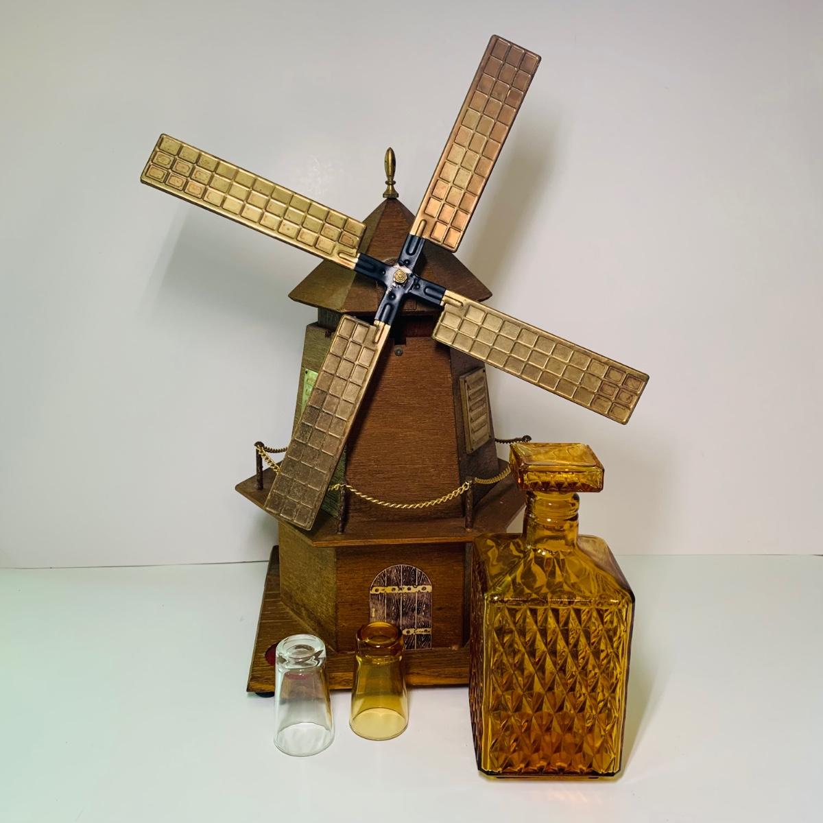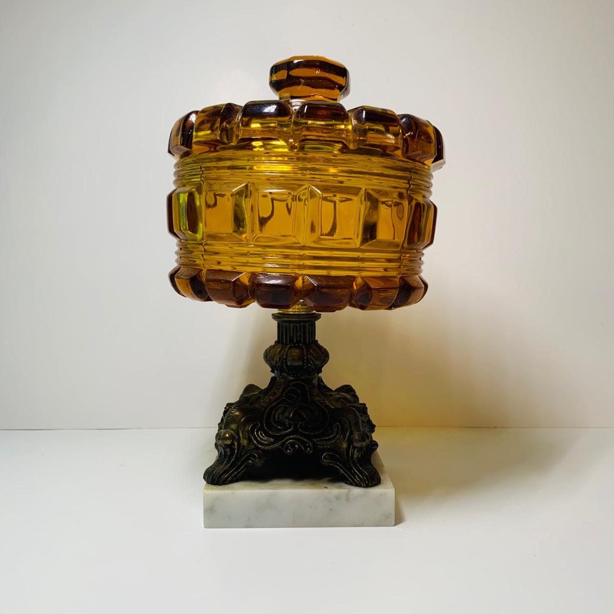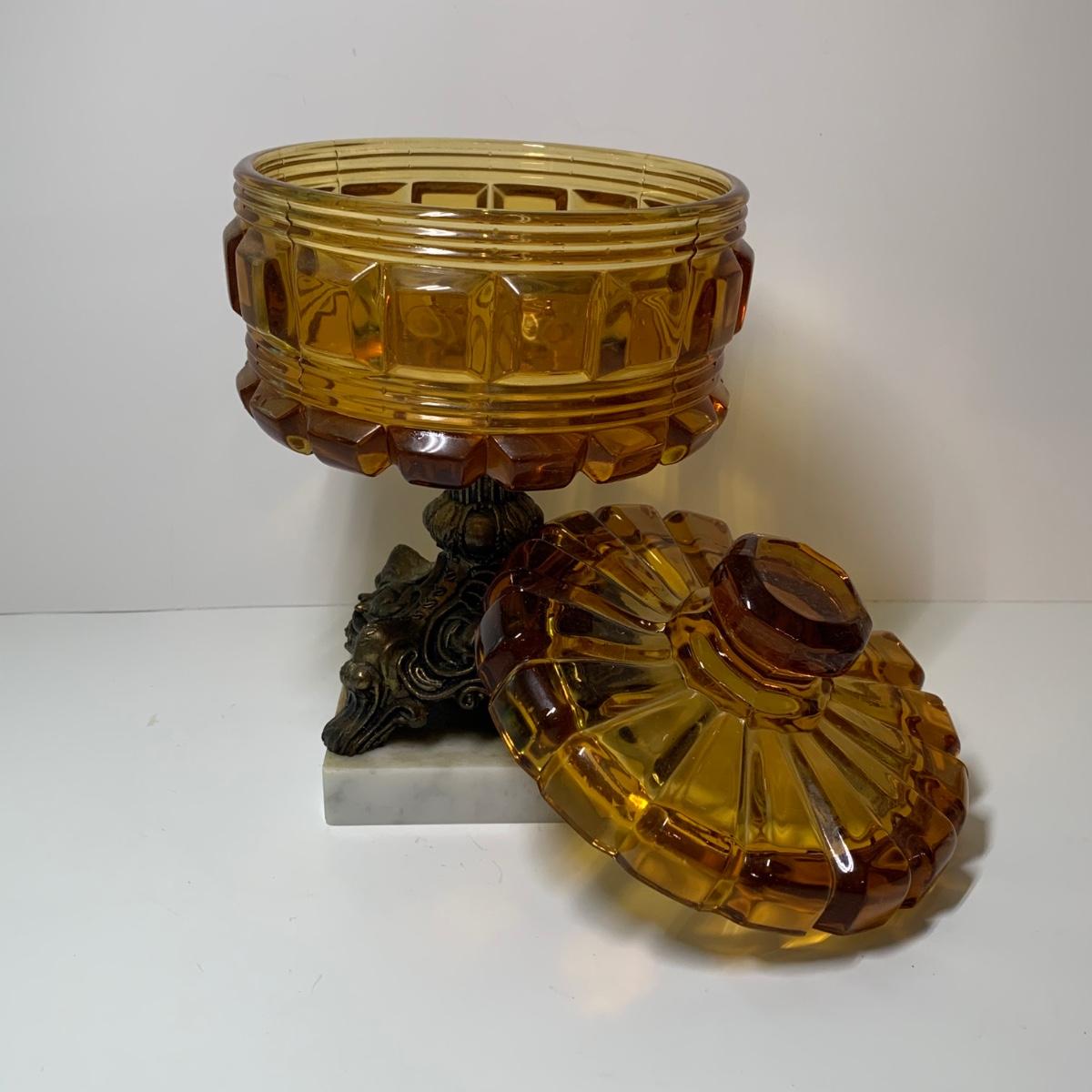 LOT 82: Vintage Windmill Decanter Set with Amber Glass Decanter & a Covered Candy Dish with a Metal & Marble Base and More