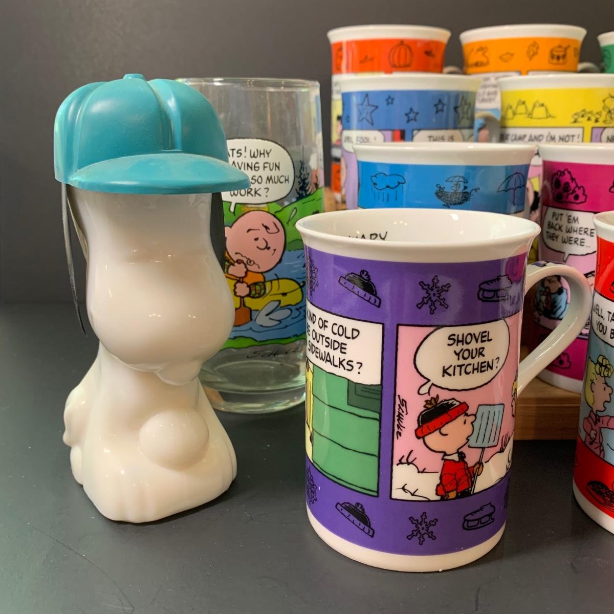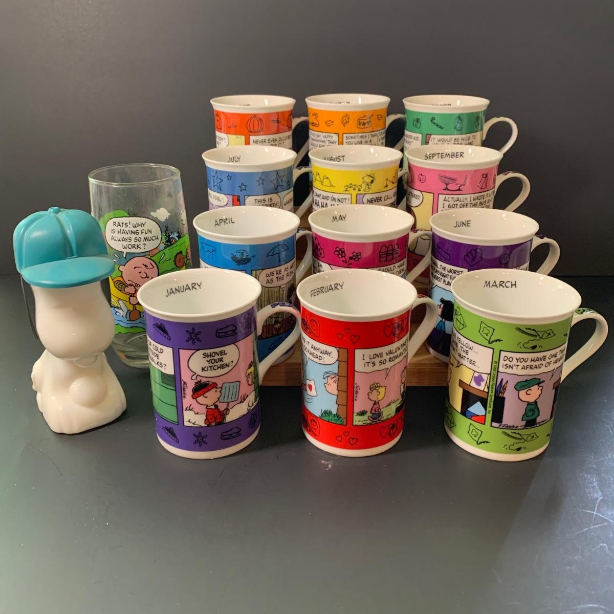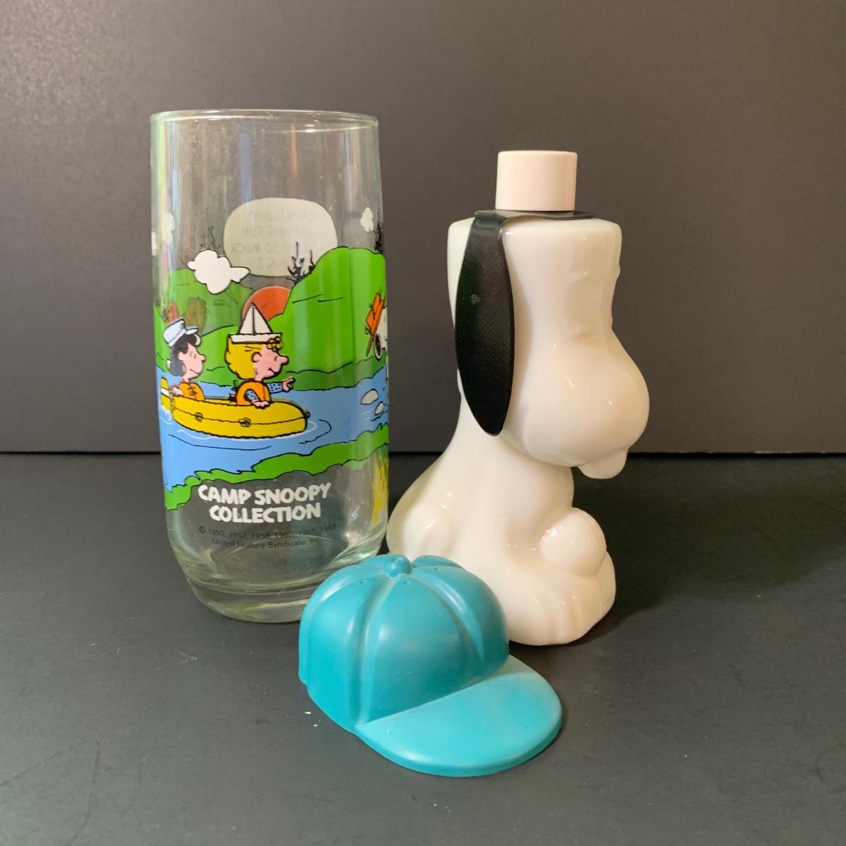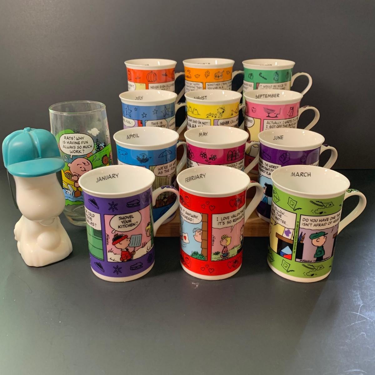 LOT 90: Charlie Brown, Snoopy and the Peanuts Gang Mug for Every Month, Snoopy Avon Bottle and a Camp Snoopy Glass