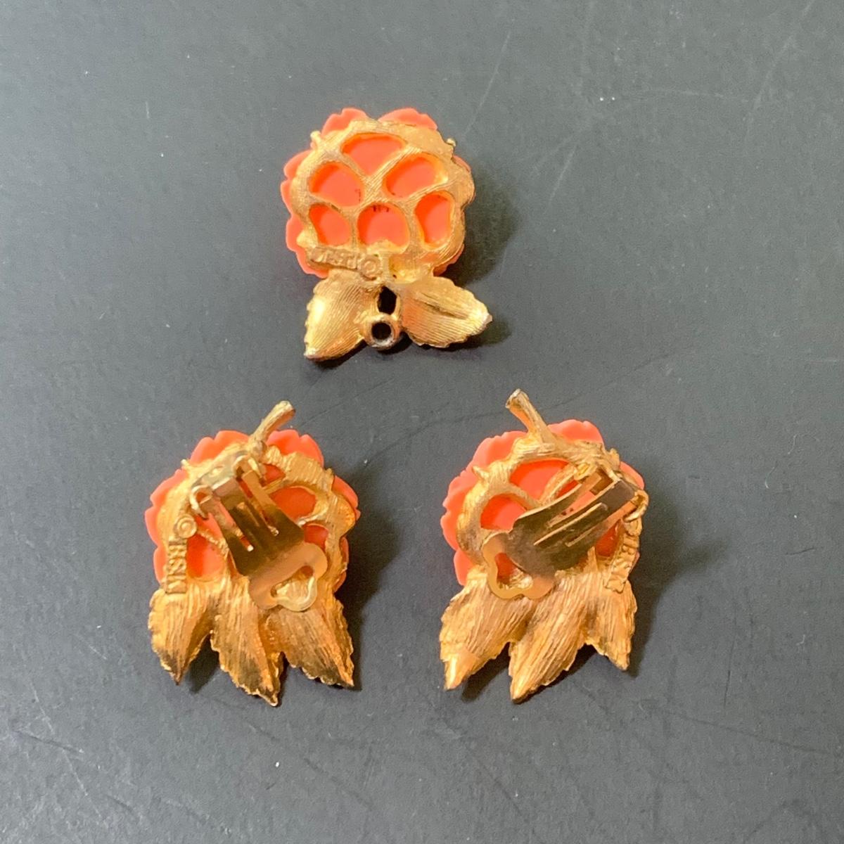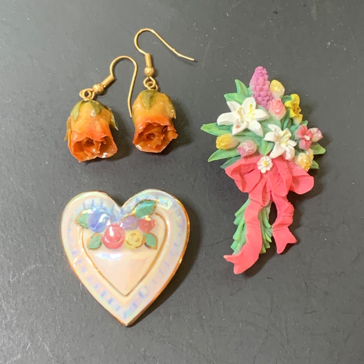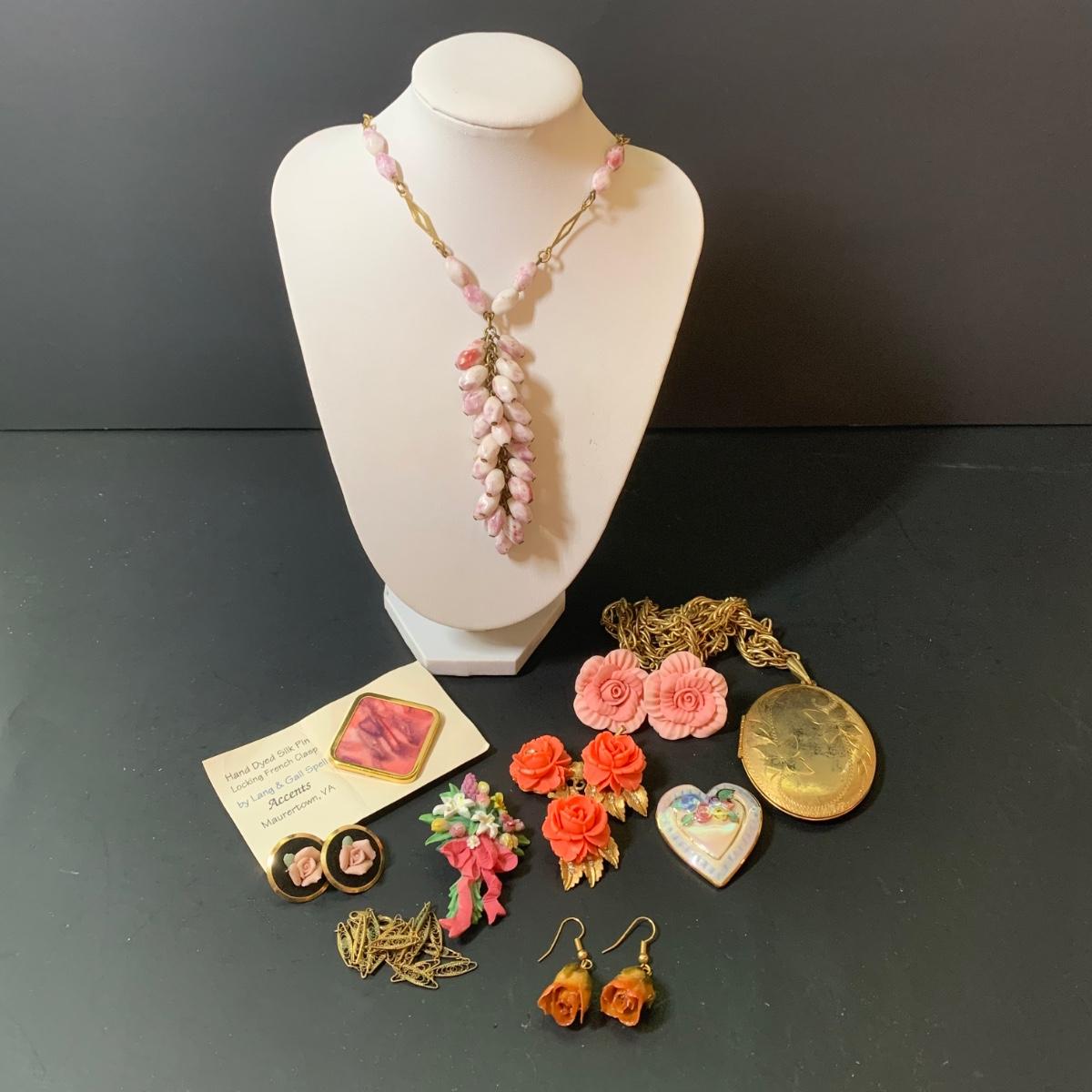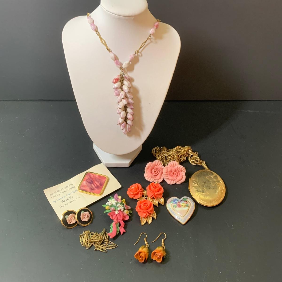 LOT 124: Floral Jewelry Collection & More: BSK Pendant & Clip Earrings, Crown Trifari Chain, Hand Dyed Silk Pin, Locket