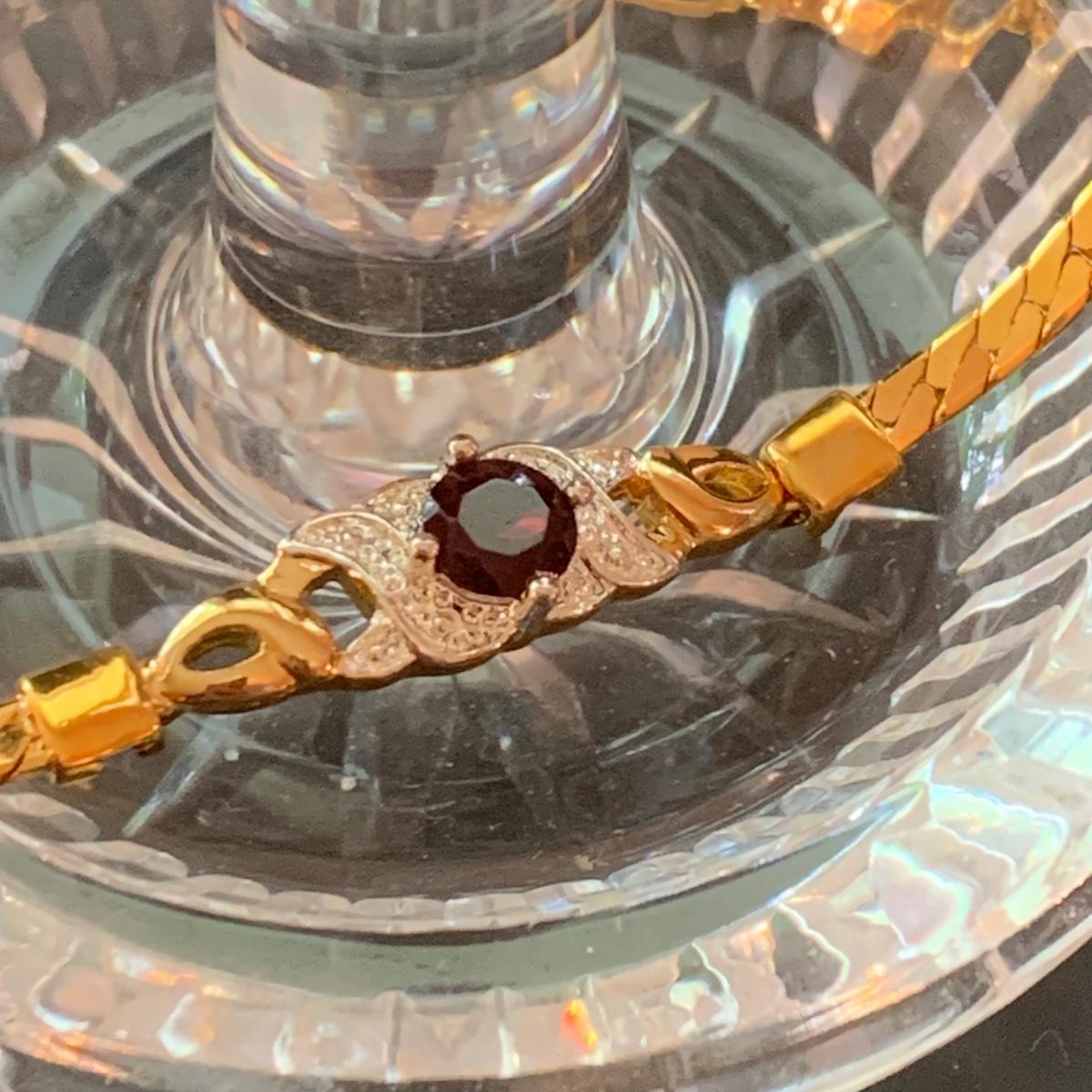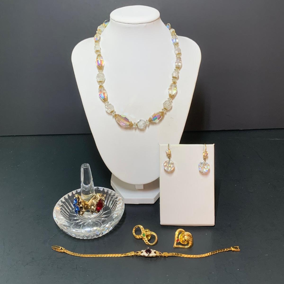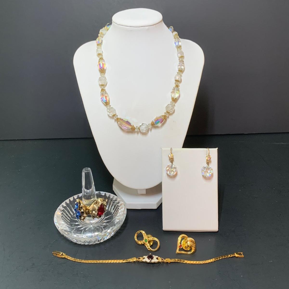 LOT 125: Crystal Aurora Borealis Necklace & Pierced Earring Set, Harriet Carter: Genuine Ruby Pin & Emerald, 24K Electro Plated Pin, Adjustable Rings & Gold Tone Bracelet