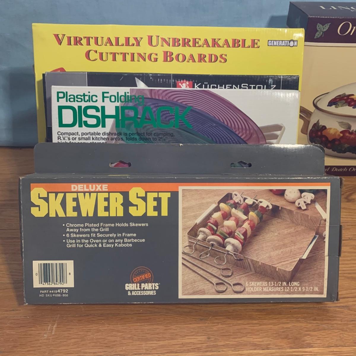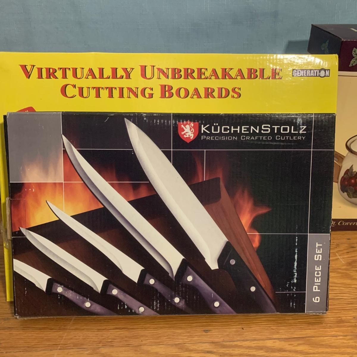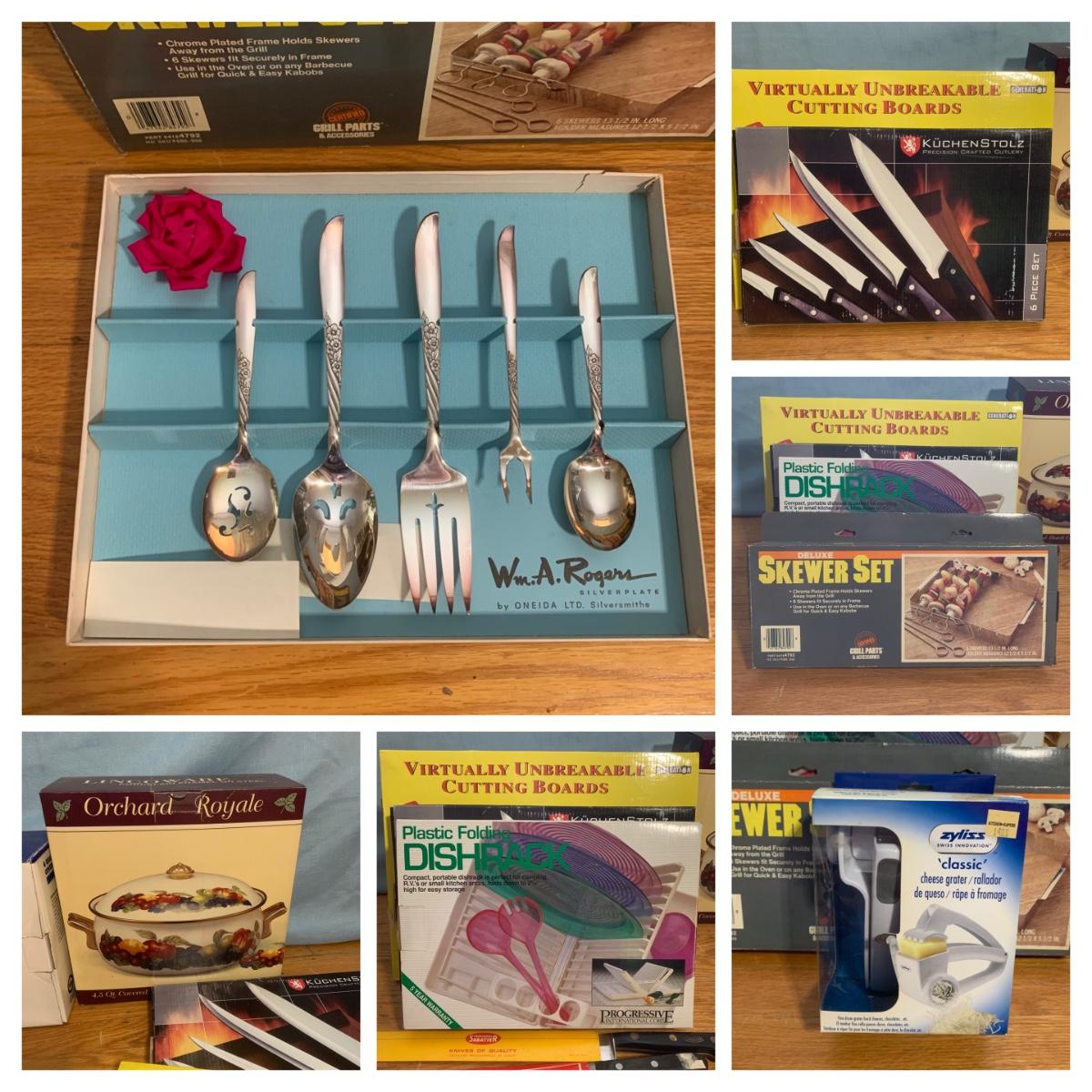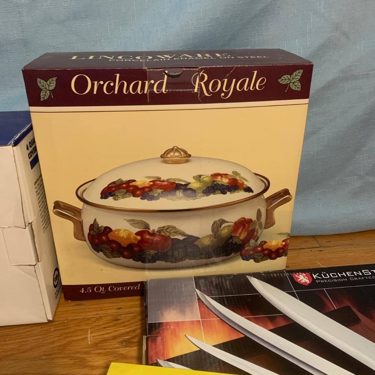 LOT 129: New In Box: Oneida Silver Plate Serving Set, Non-Stick Roasting Pan, Orchard Royale, Cutting Boards, Knife Set. Diplomat Sauce Pan & More