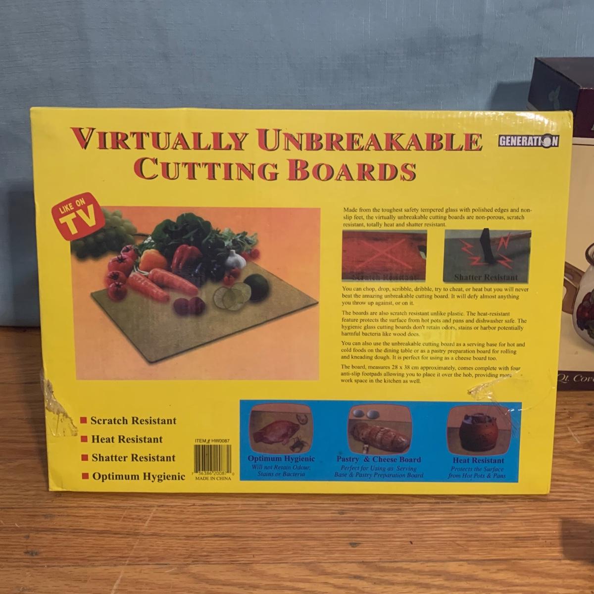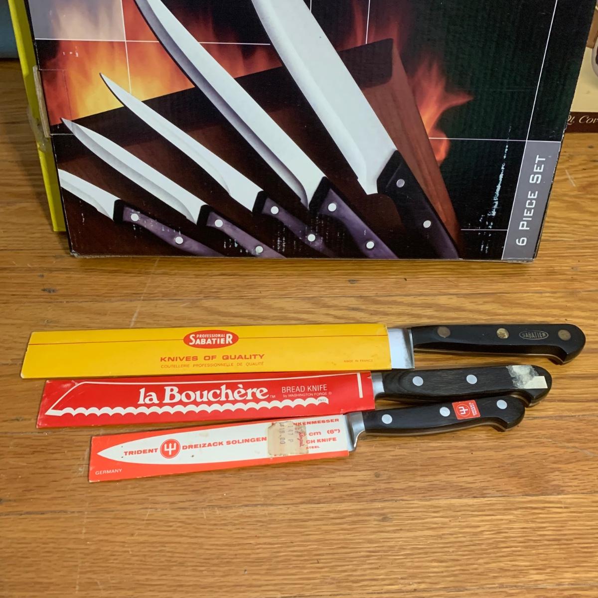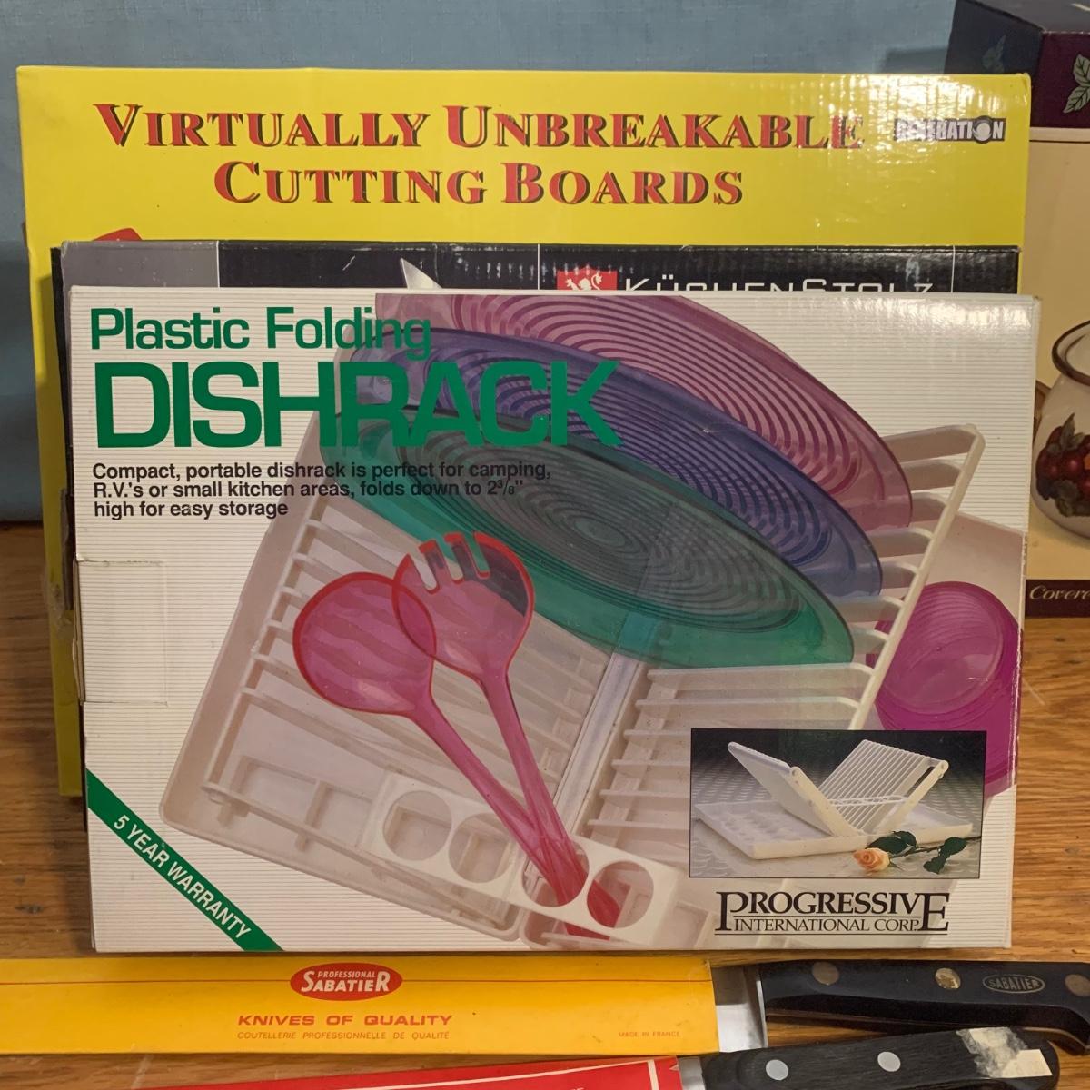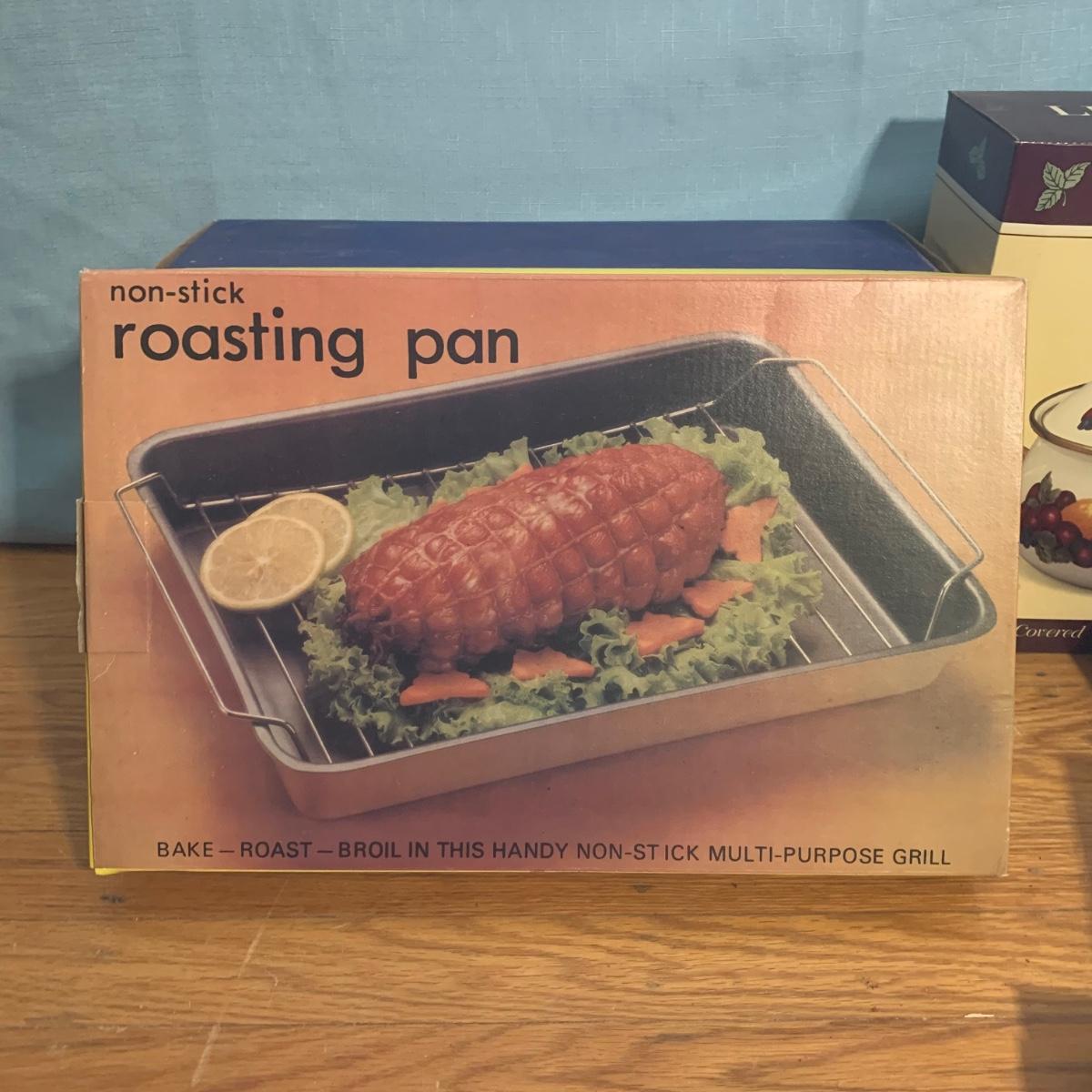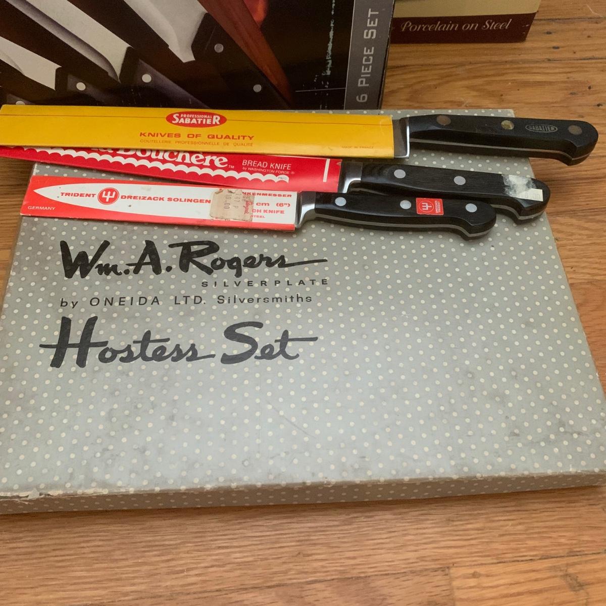 LOT 129: New In Box: Oneida Silver Plate Serving Set, Non-Stick Roasting Pan, Orchard Royale, Cutting Boards, Knife Set. Diplomat Sauce Pan & More