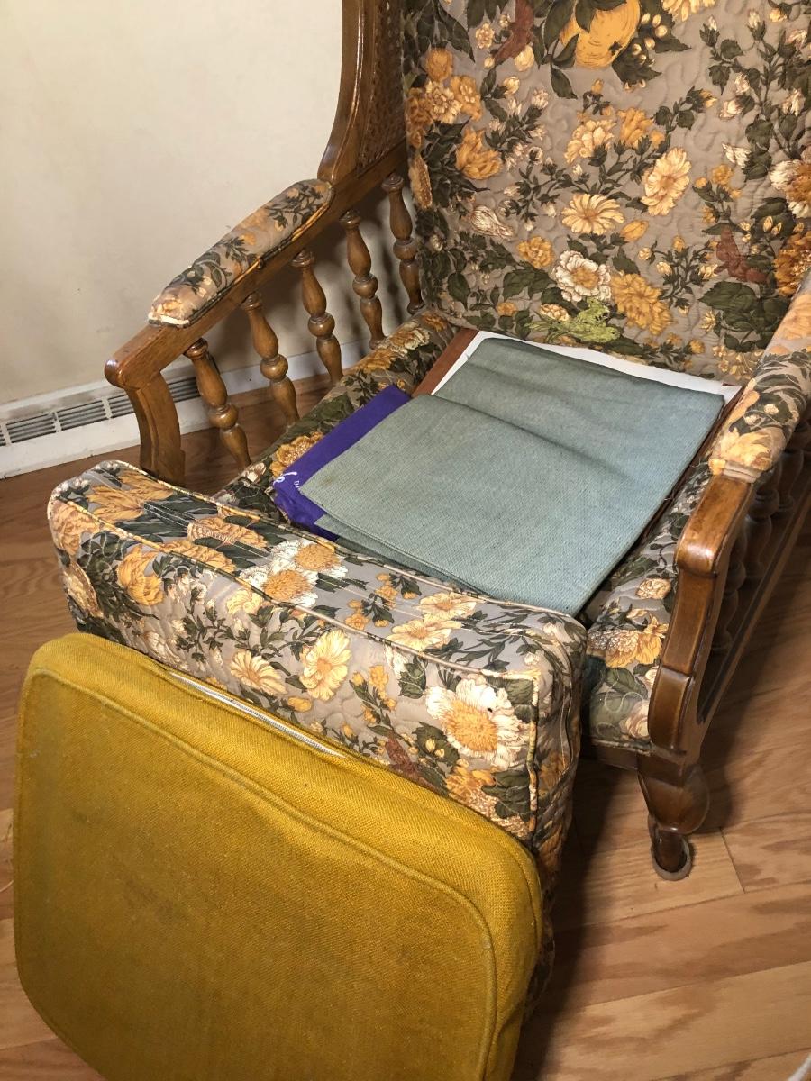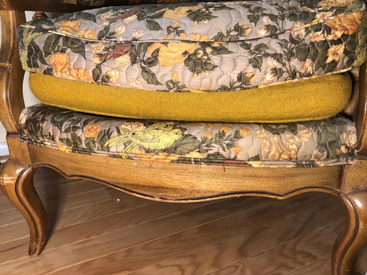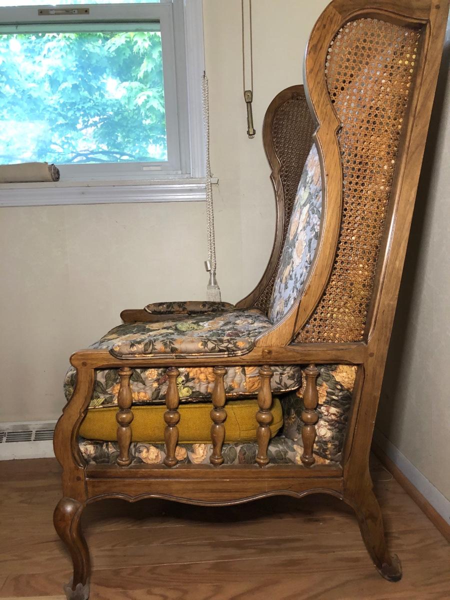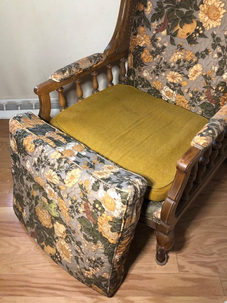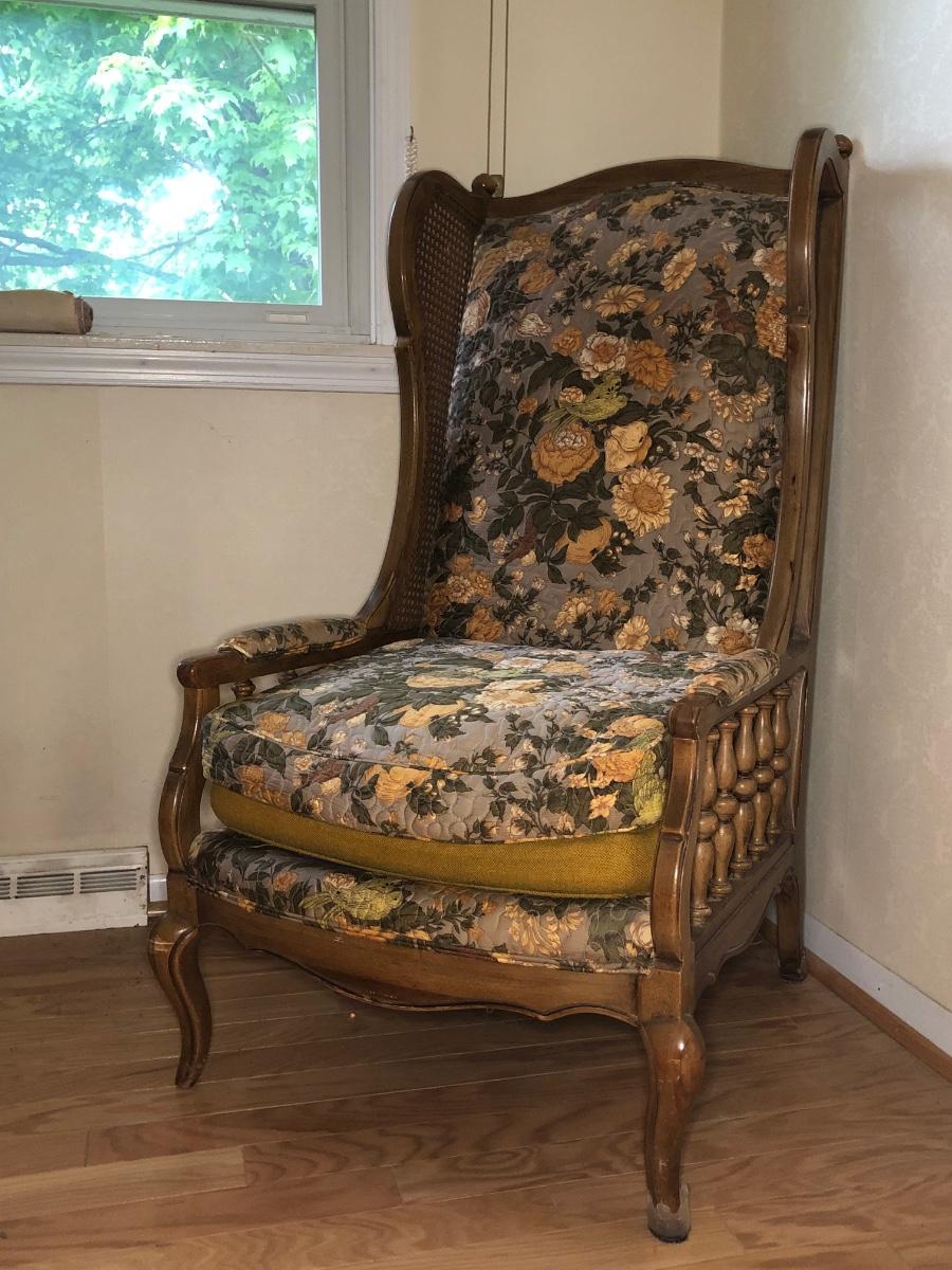 Chair is in used condition and supported by an extra cushion as there is a dip in the upholstery. Measures 24W x 26D x 49H.