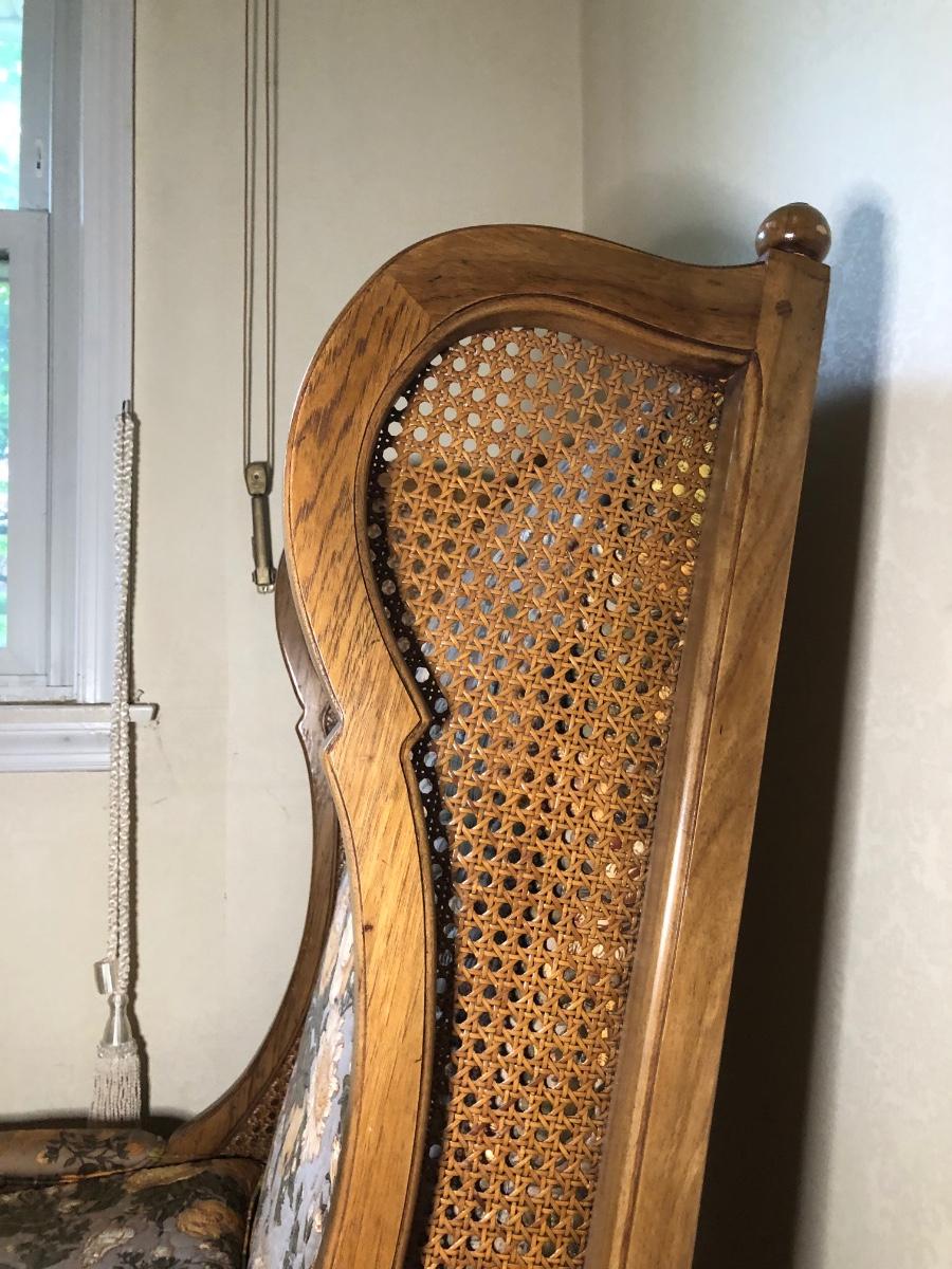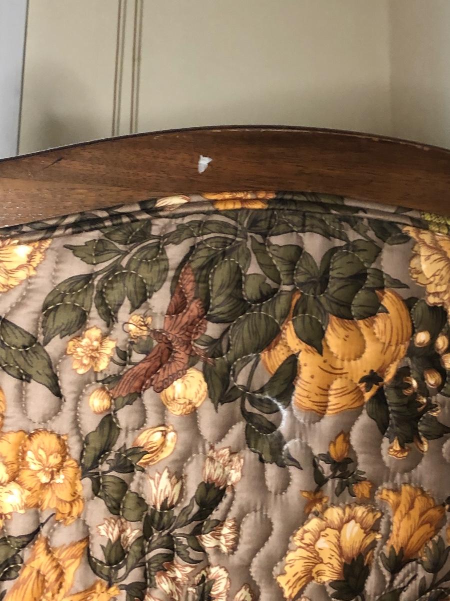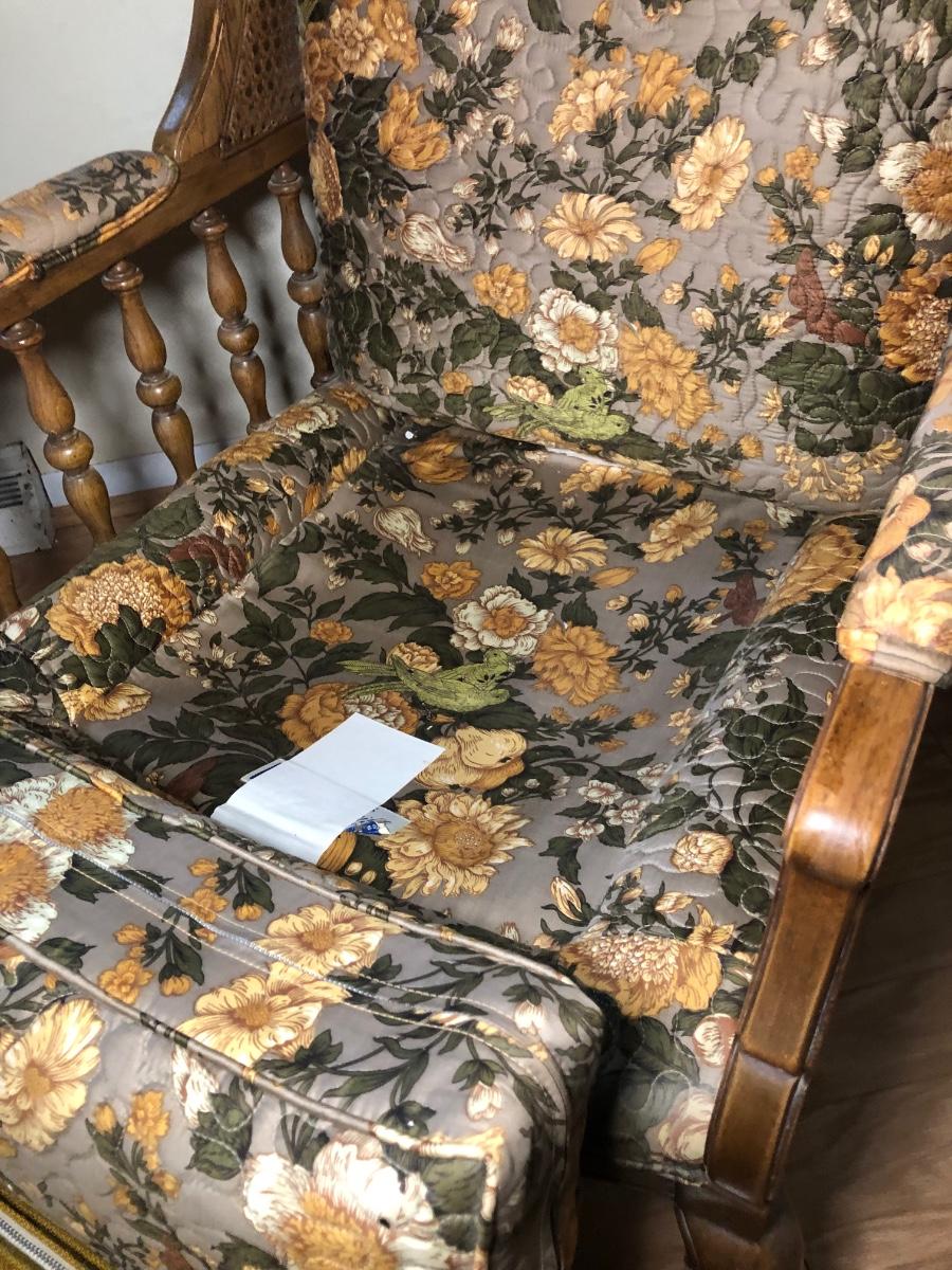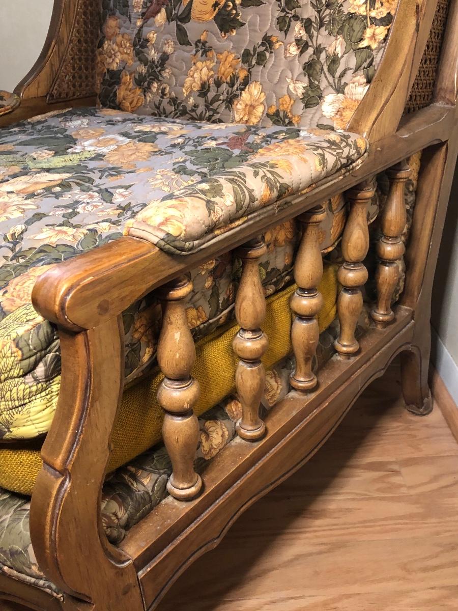 Chair is in used condition and supported by an extra cushion as there is a dip in the upholstery. Measures 24W x 26D x 49H.