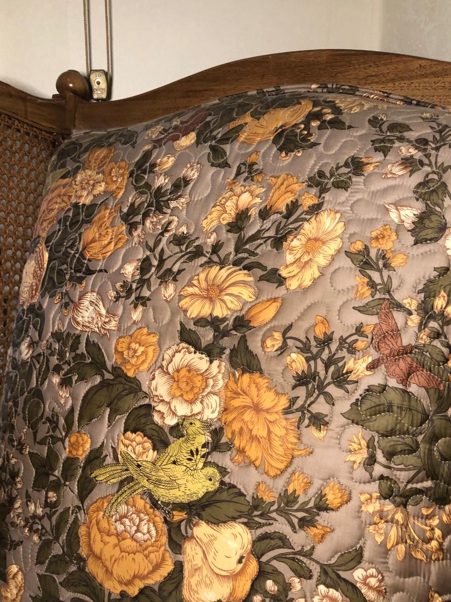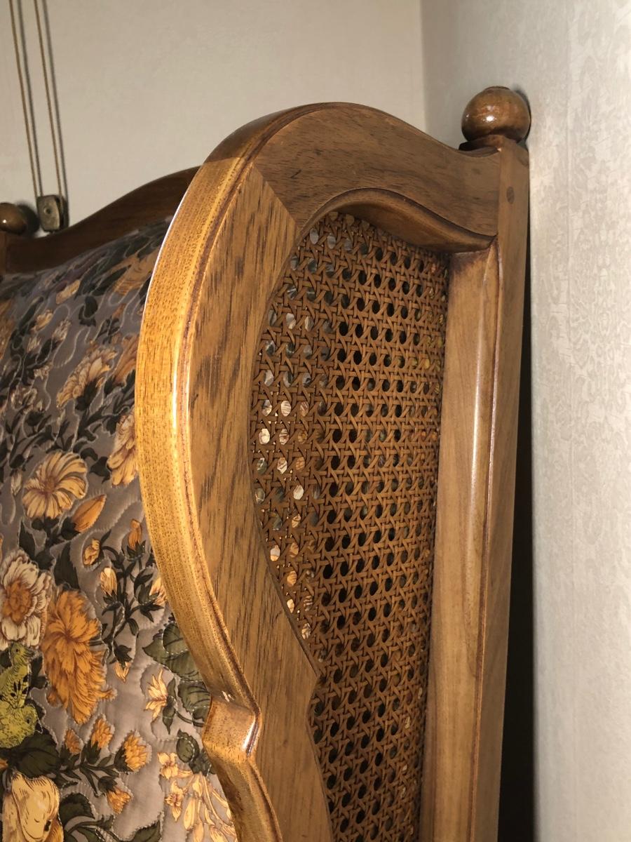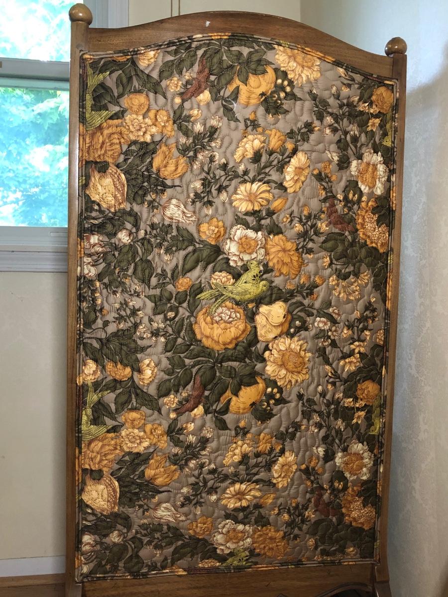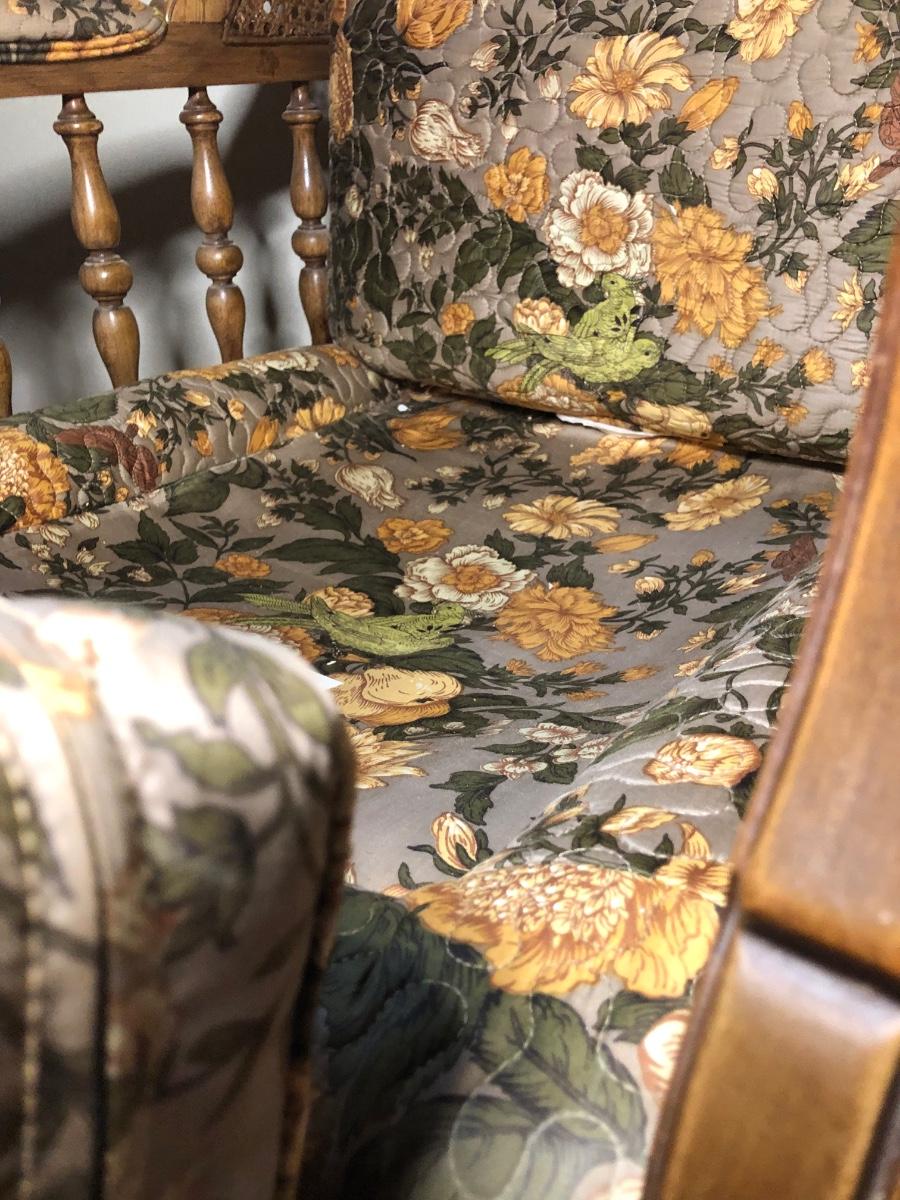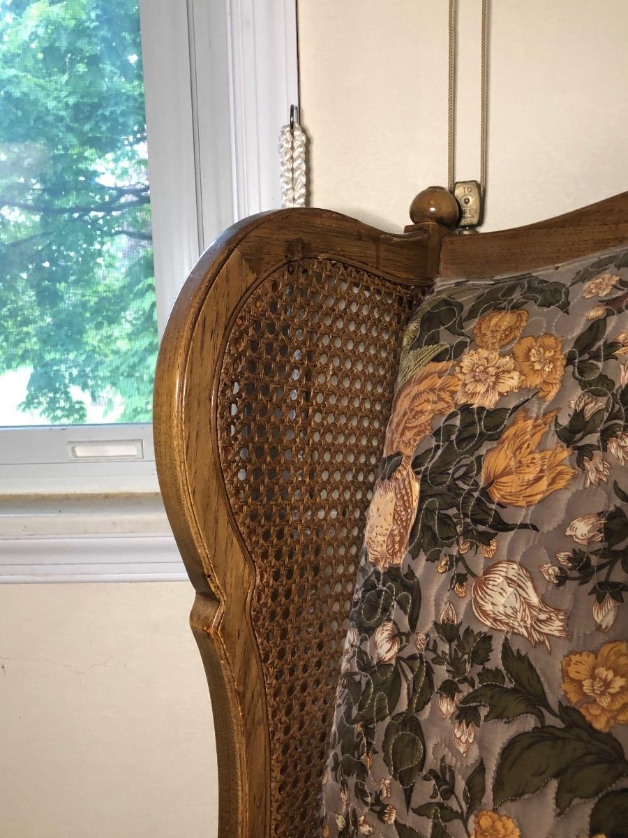 Chair is in used condition and supported by an extra cushion as there is a dip in the upholstery. Measures 24W x 26D x 49H.