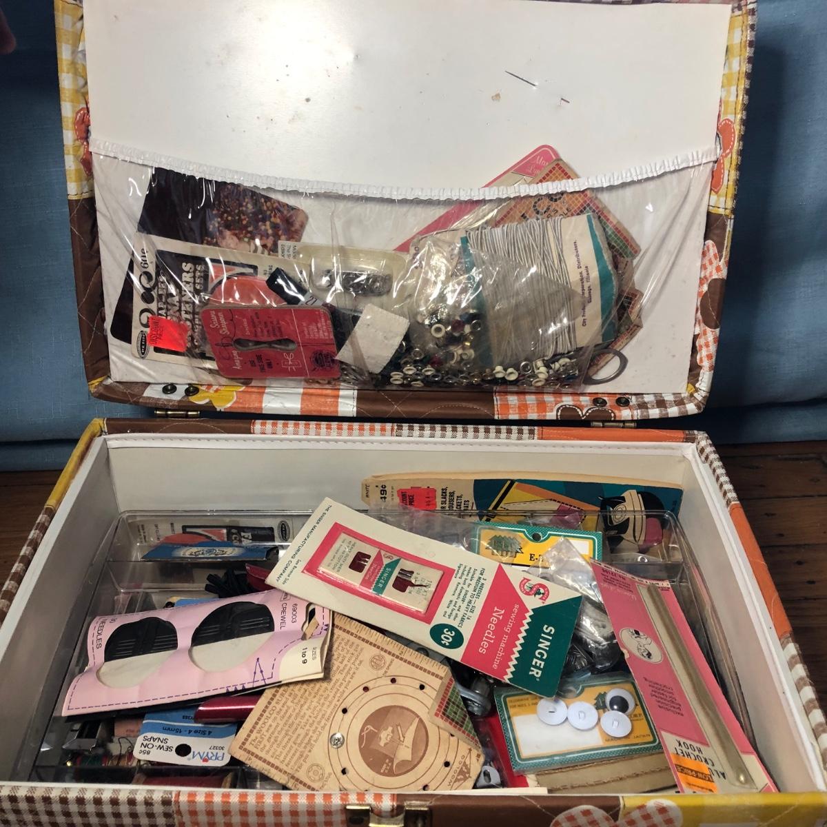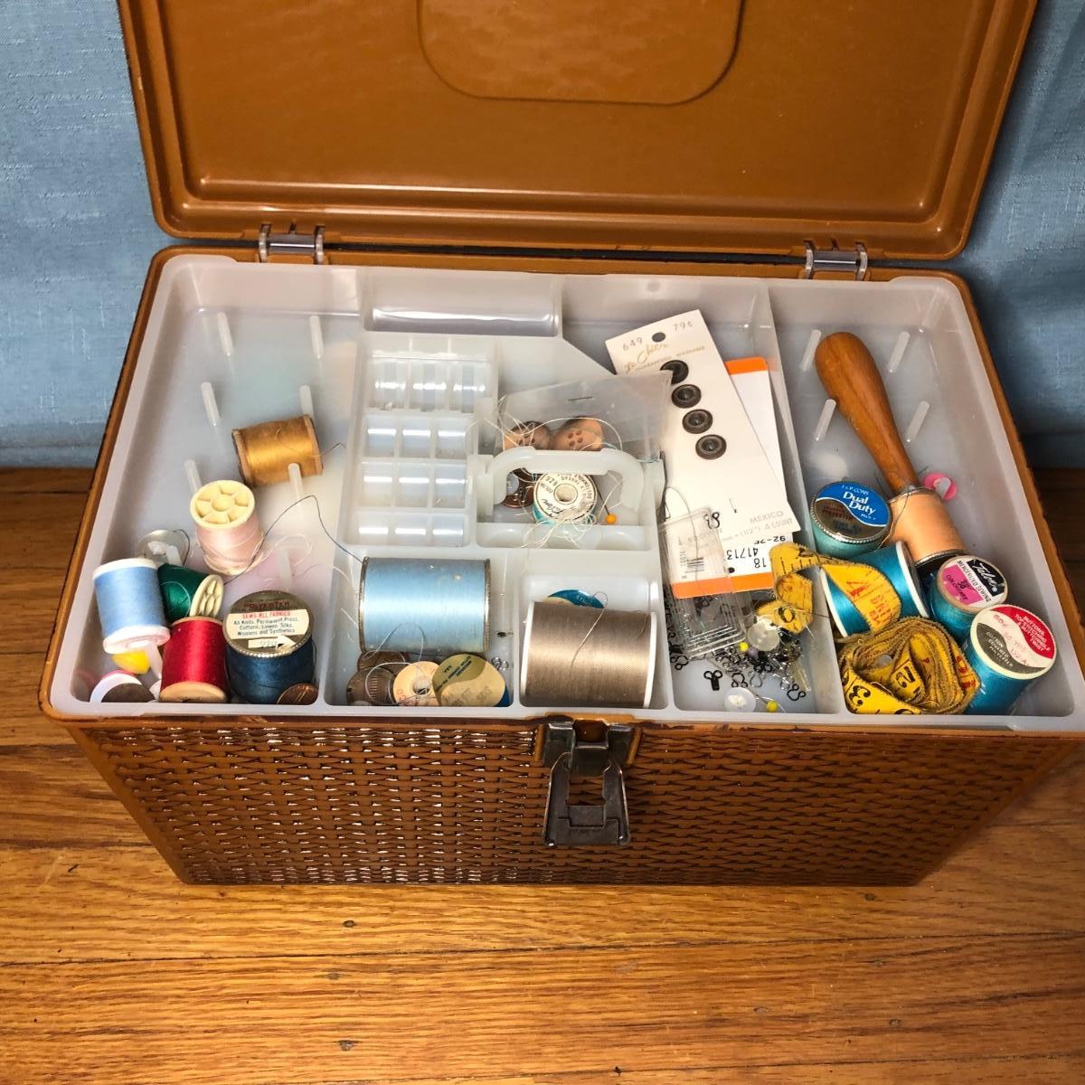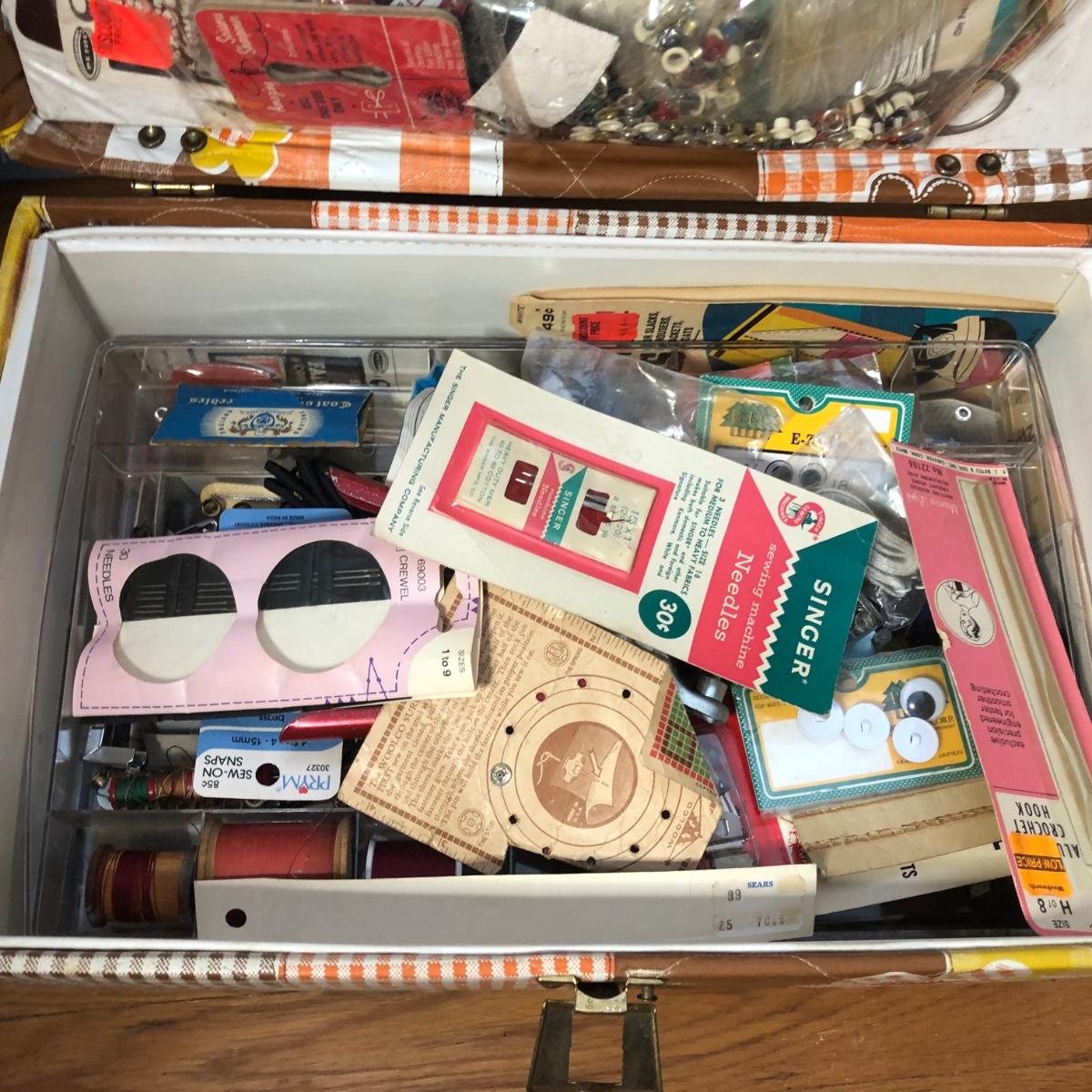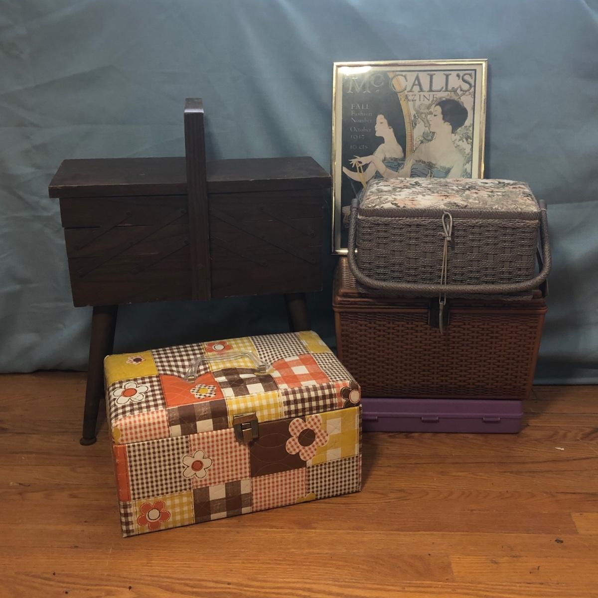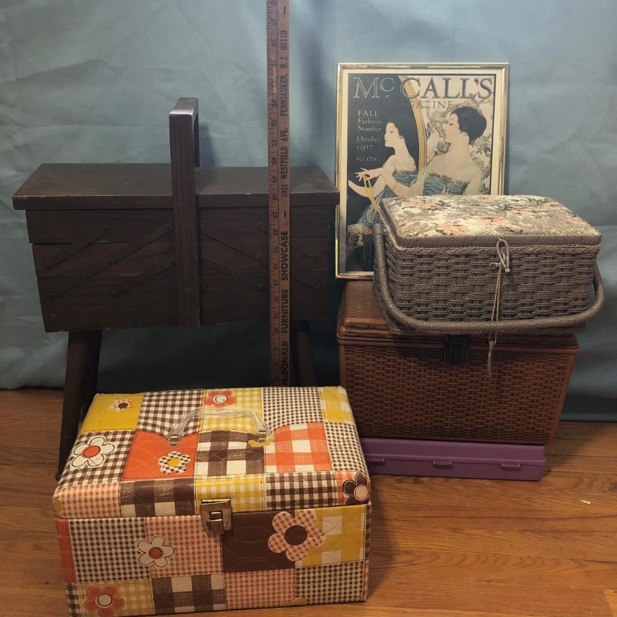 LOT 152M: Vintage Sewing Caddies w/ Supplies & Framed McCall's Poster